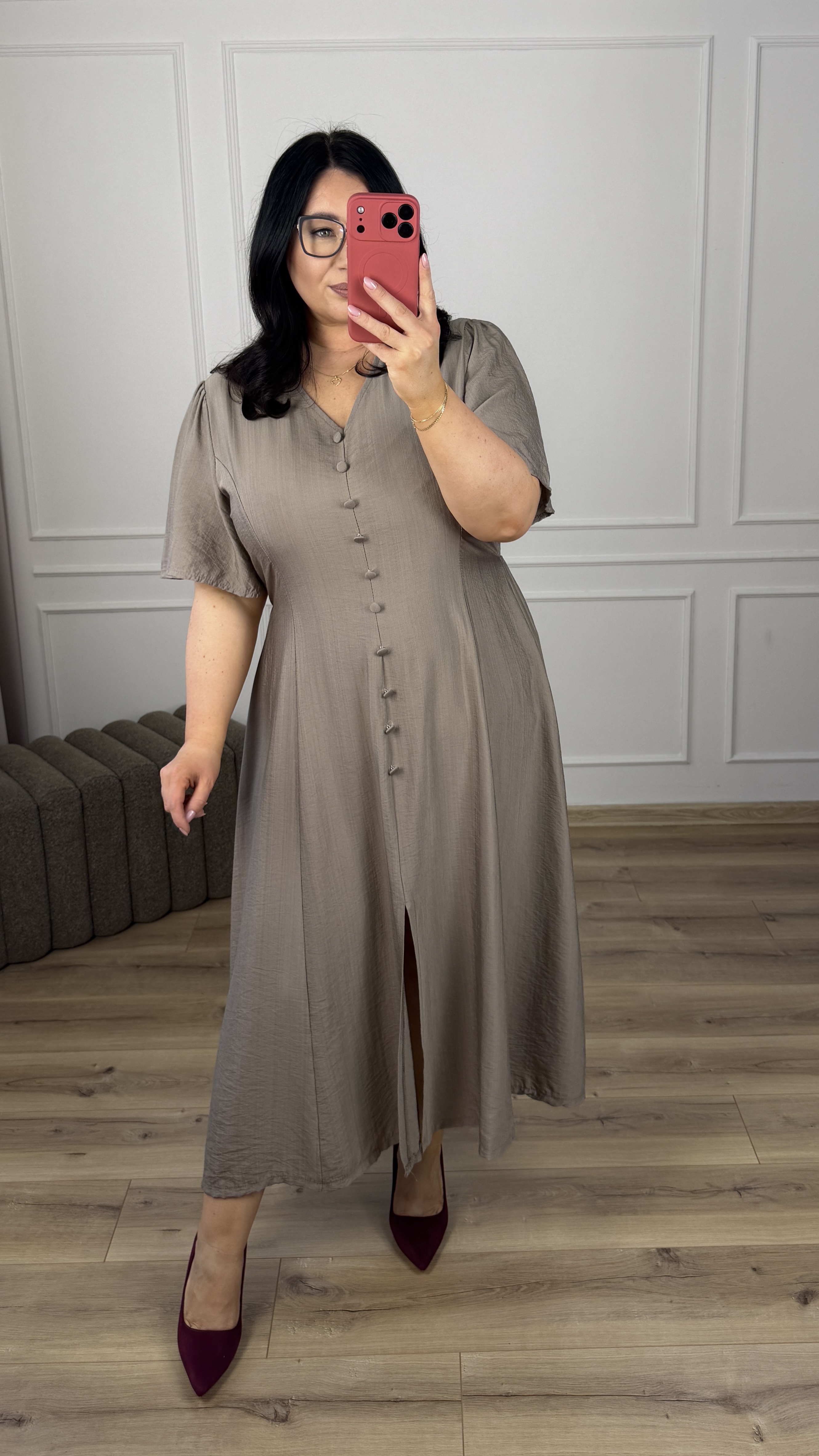 Elegancka sukienka z wiskozy z ozdobnymi guzikami z przodu. Model z podkreśloną talią oraz rozkloszowaną spódnicą długości midi. Spódnica posiada rozcięcie z przodu. Krótki rękaw delikatnie rozkloszowany, świetnie podkreśla ramiona. Model o swobodnym fasonie zapewnia swobodę ruchu i komfort noszenia. Sukienka posiada delikatny dekolt w serek. Rozkloszowana spódnica nadaje jej lekkości i dziewczęcego wdzięku. Sukienka świetnie sprawdzi się na okazjonalne wyjścia jak i również na co dzień.
