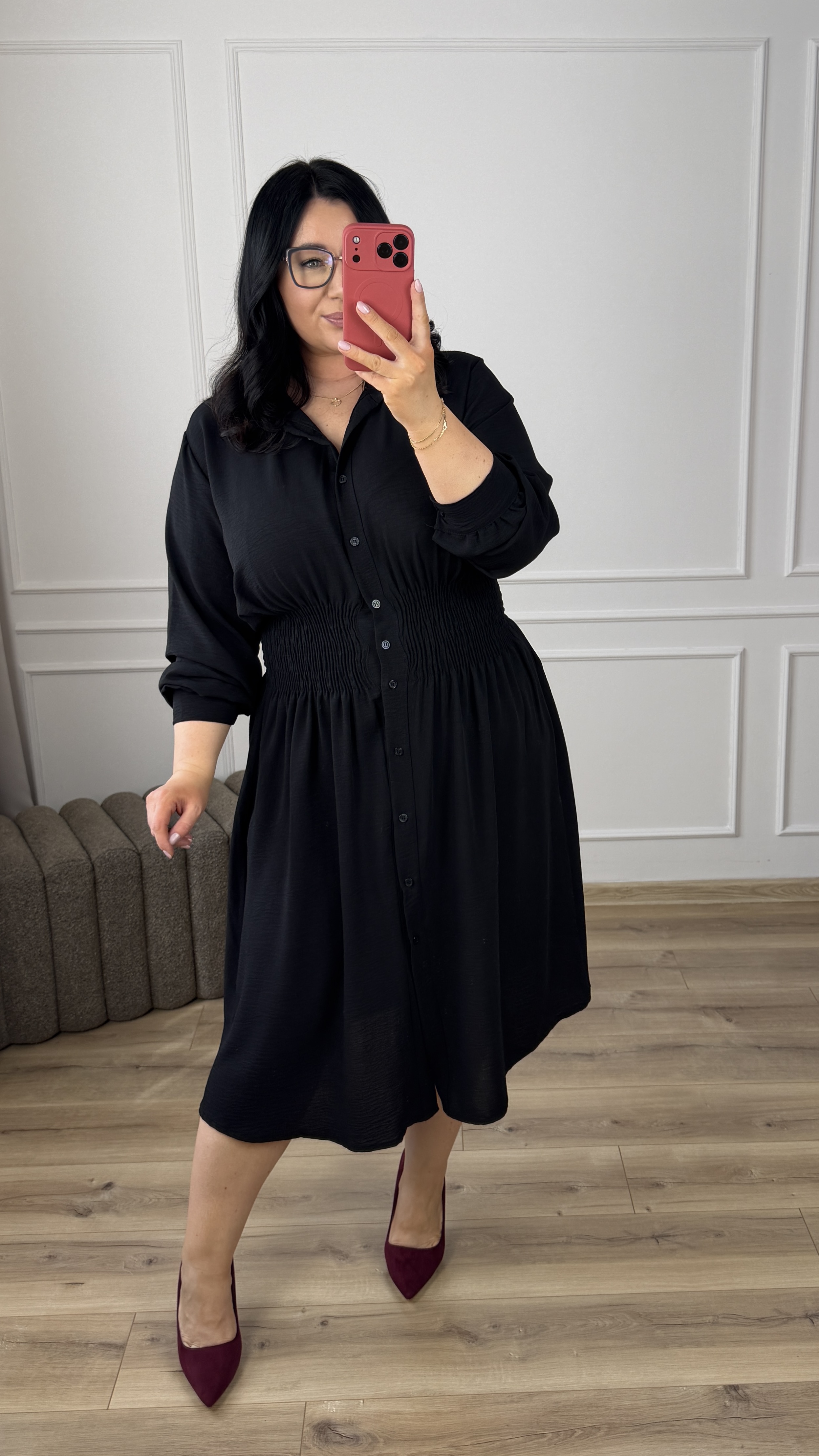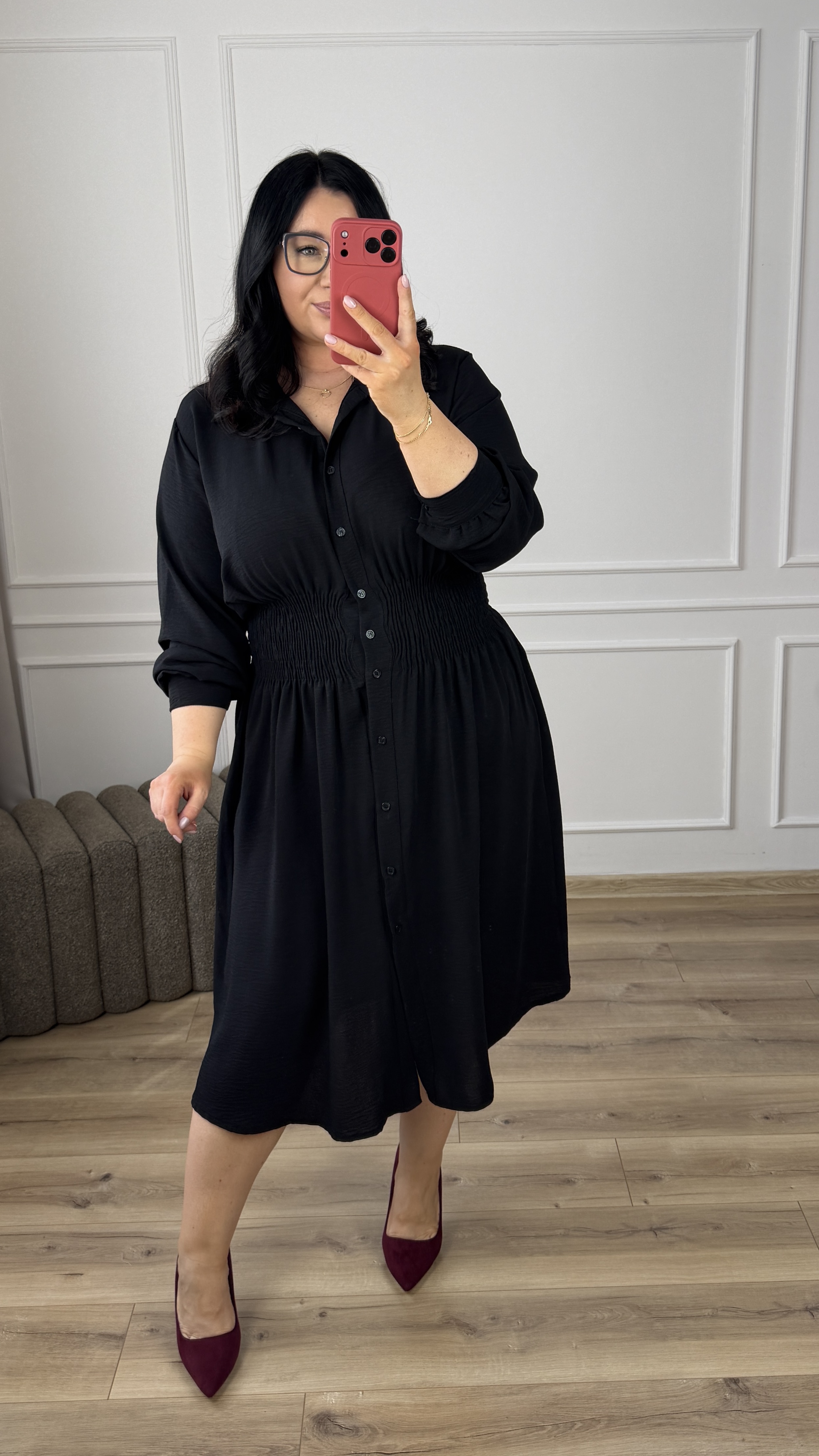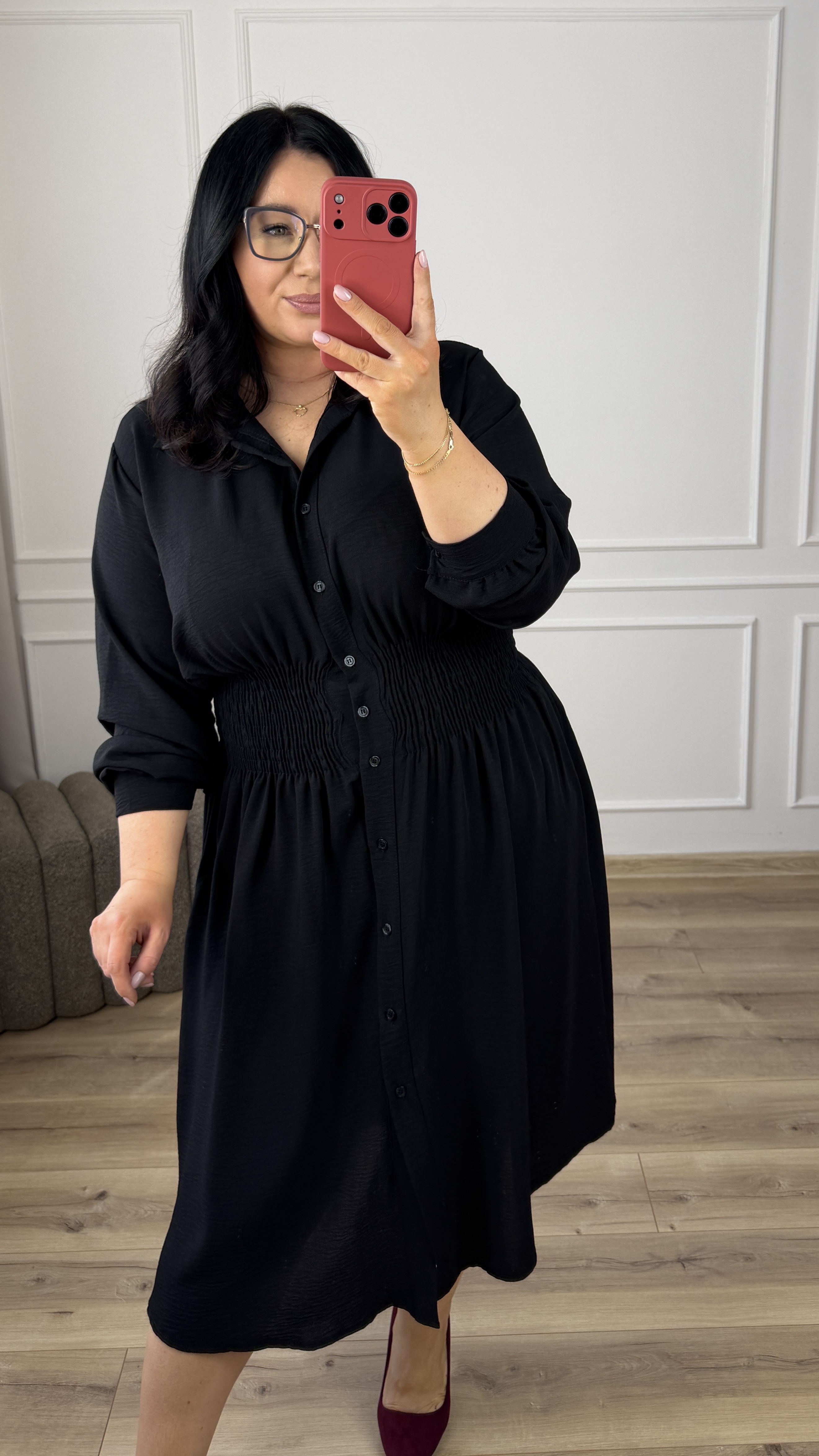 Klasyczny model sukienki typu szmizjerka z marszczeniem w pasie, dzięki czemu idealnie podkreśla talię. Sukienka długości midi, zapinana na rząd guzików. Długi rękaw wykończony mankietem z zapinanym na guzik. Sukienka dzięki swojej uniwersalności idealnie sprawdzi się na co dzień jak i również na większe wyjścia. Model dostępy w 4 kolorach.