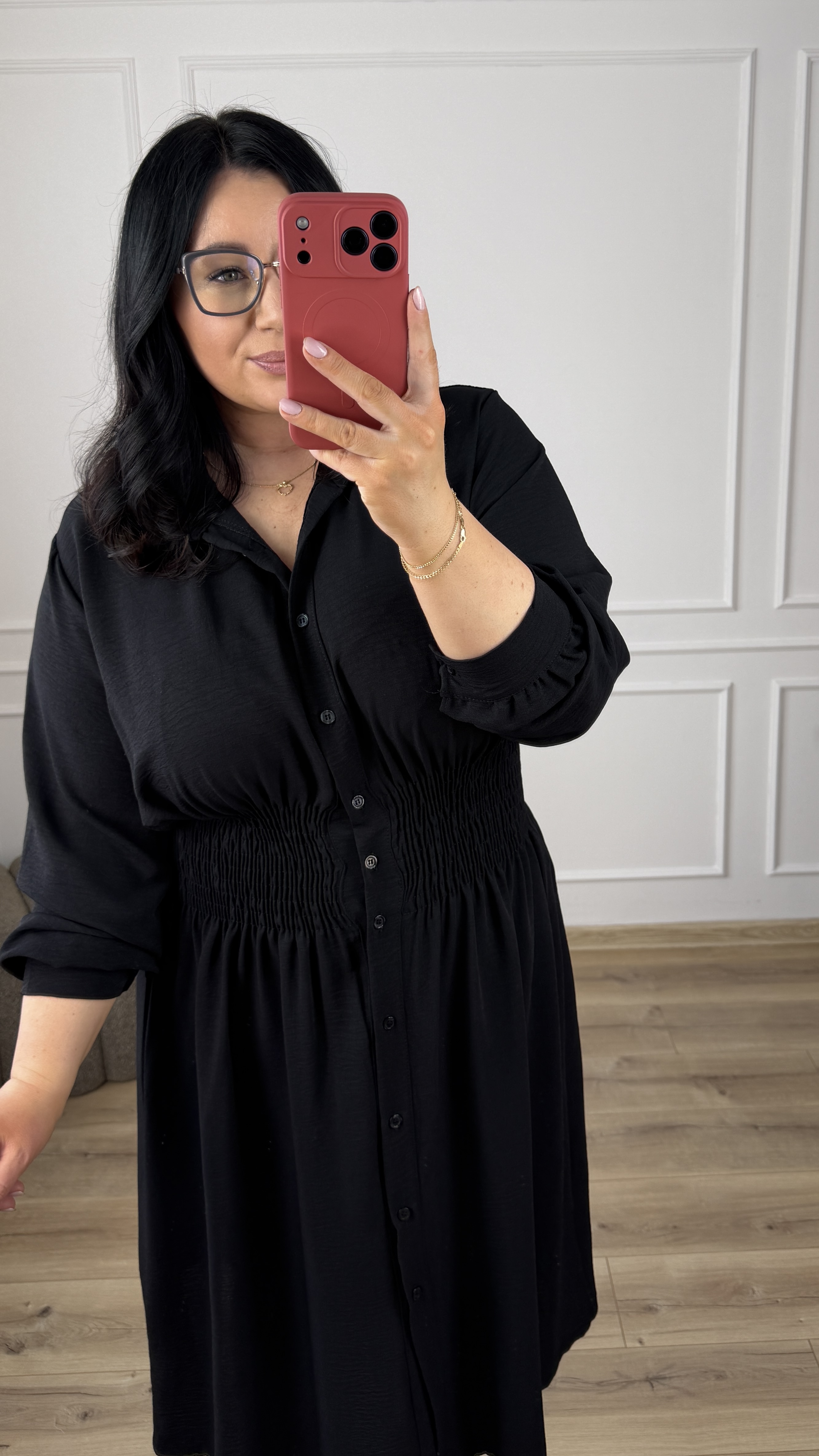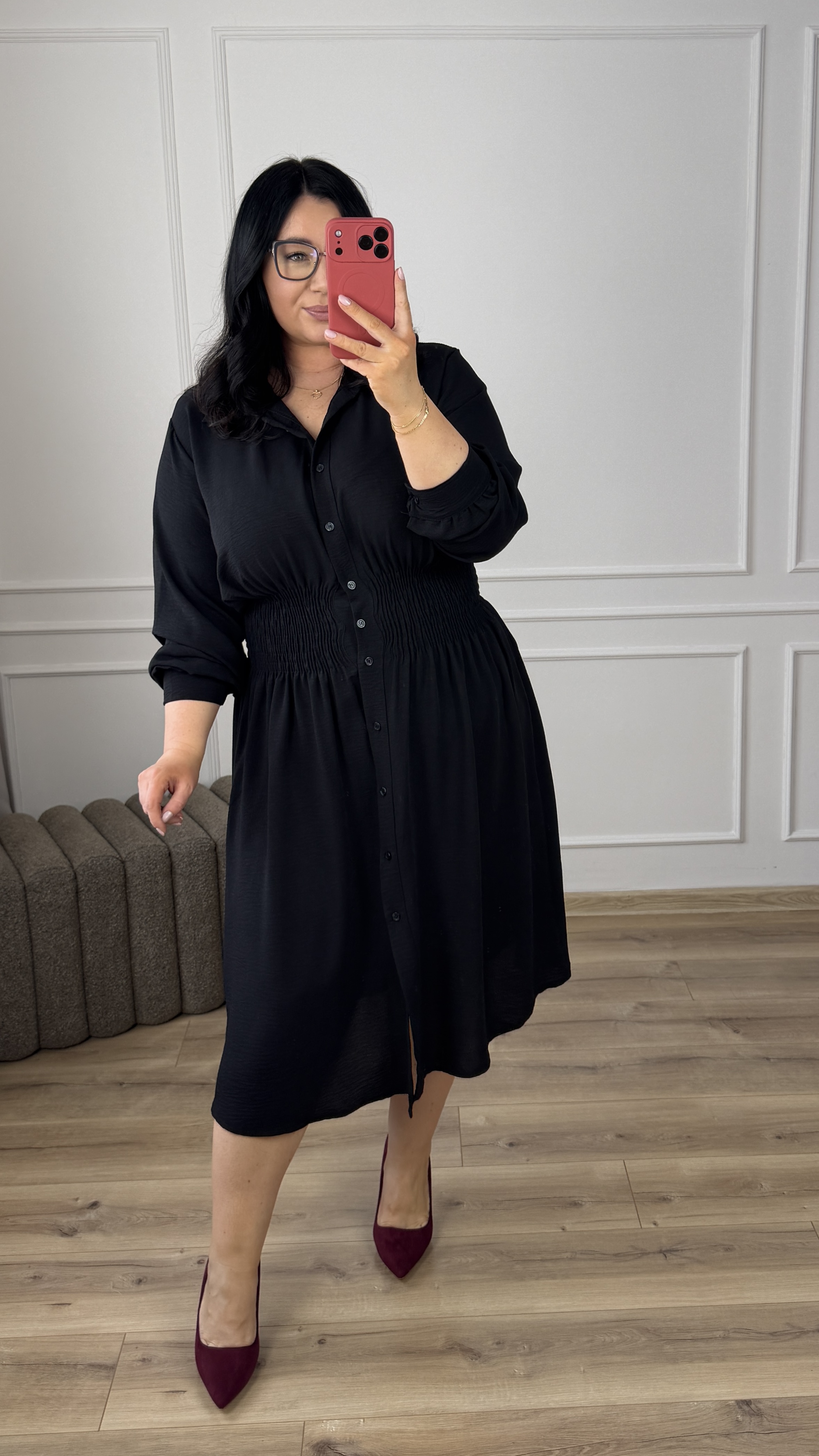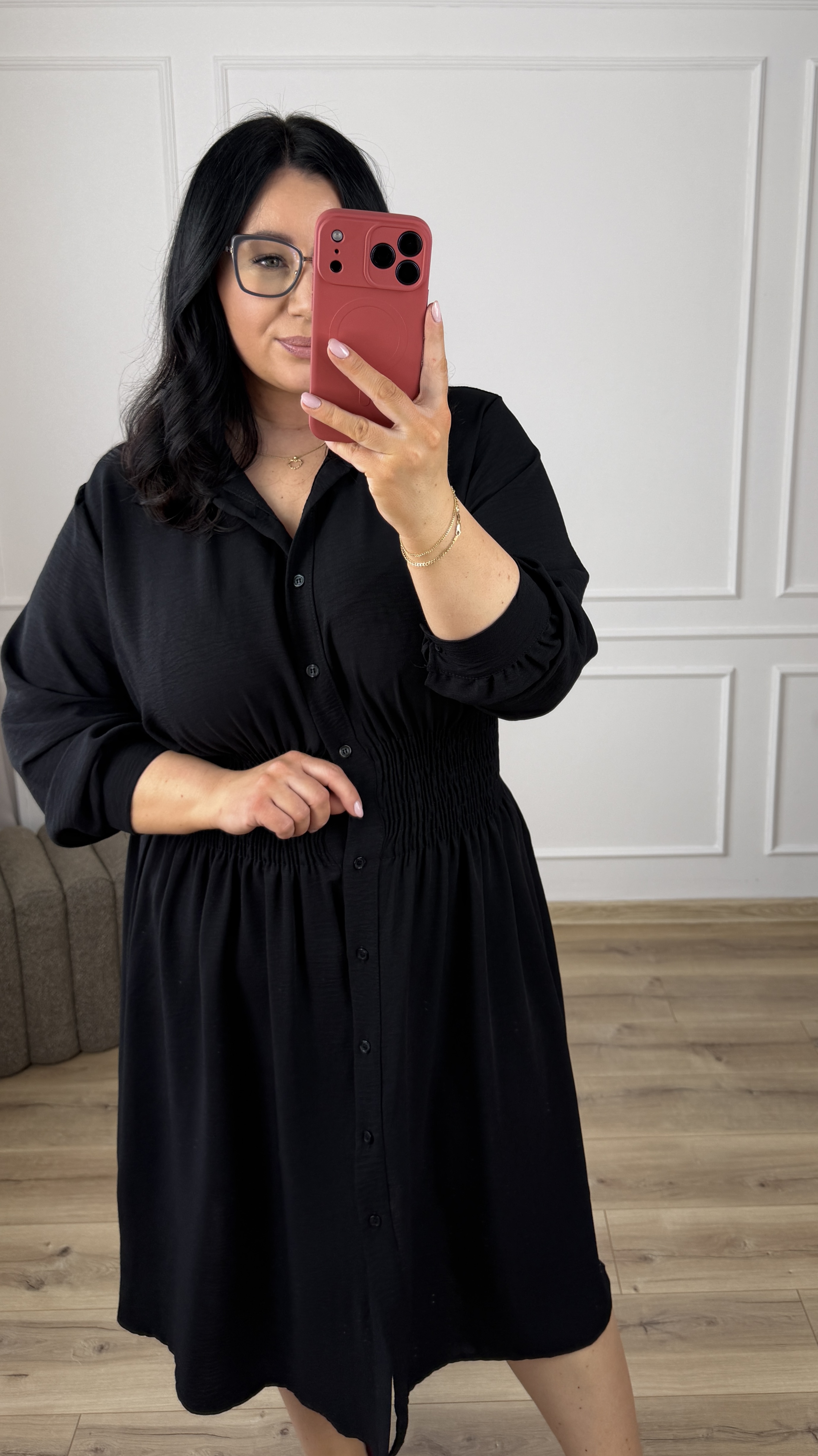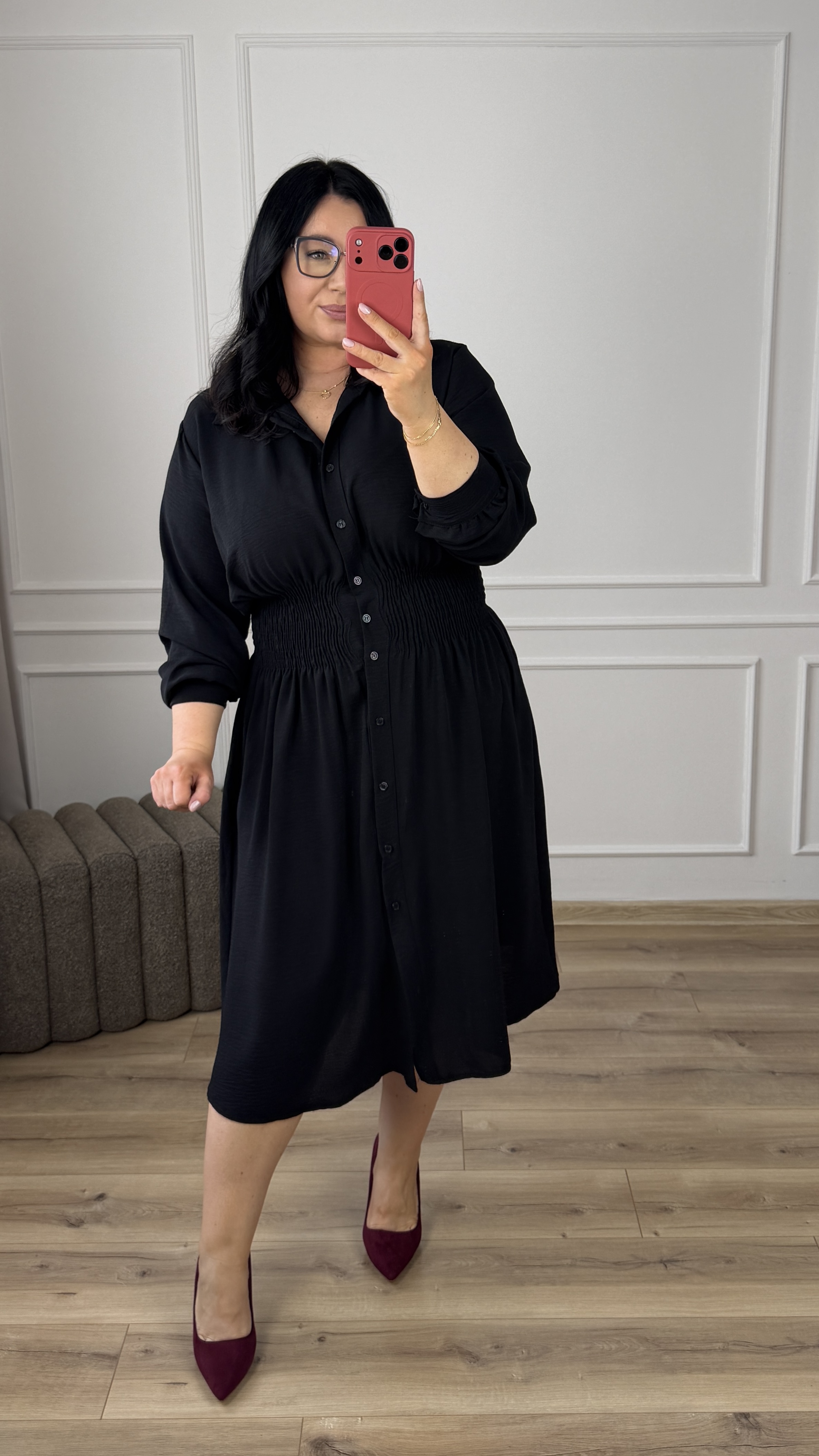Klasyczny model sukienki typu szmizjerka z marszczeniem w pasie, dzięki czemu idealnie podkreśla talię. Sukienka długości midi, zapinana na rząd guzików. Długi rękaw wykończony mankietem z zapinanym na guzik. Sukienka dzięki swojej uniwersalności idealnie sprawdzi się na co dzień jak i również na większe wyjścia. Model dostępy w 4 kolorach.