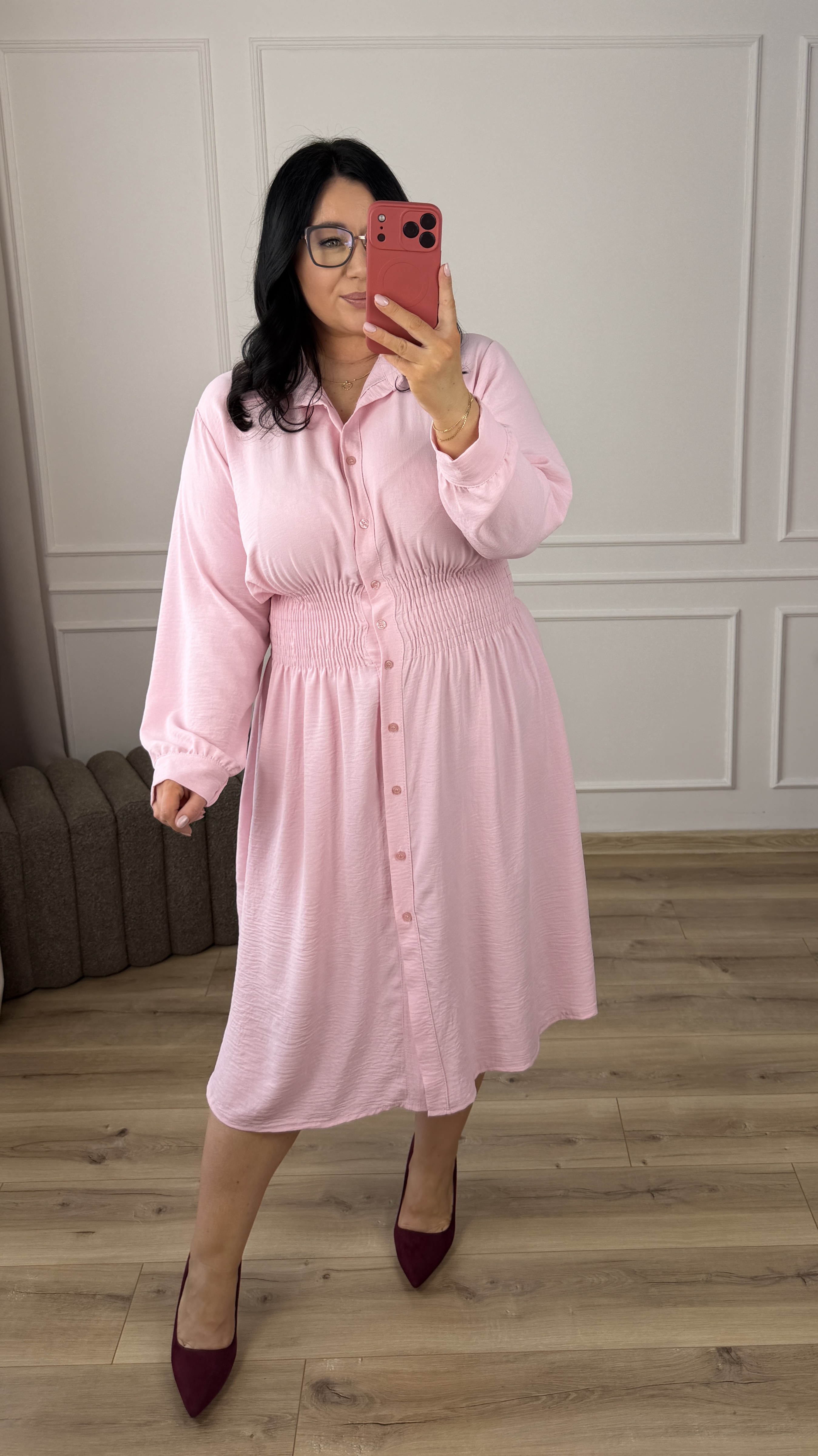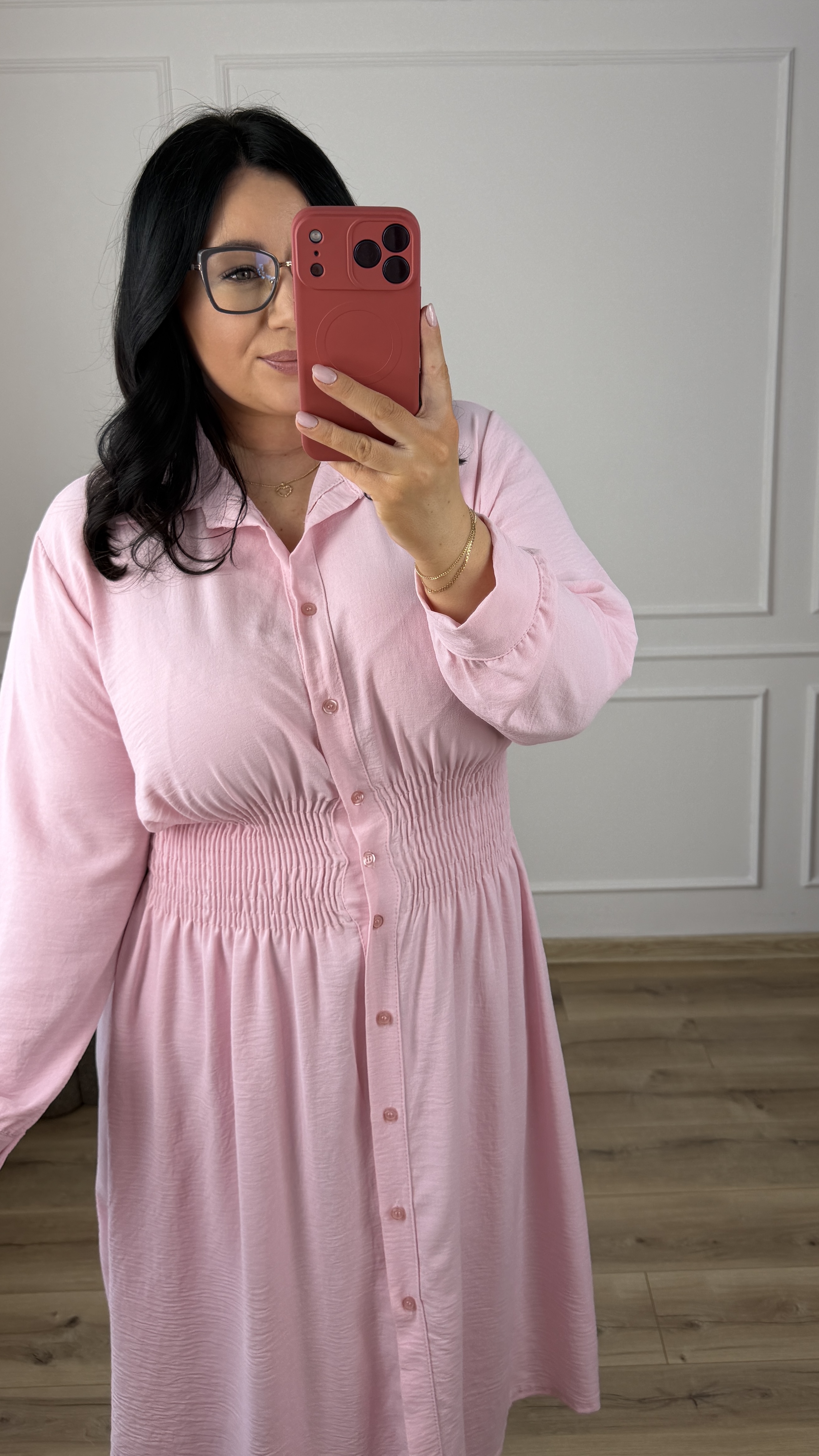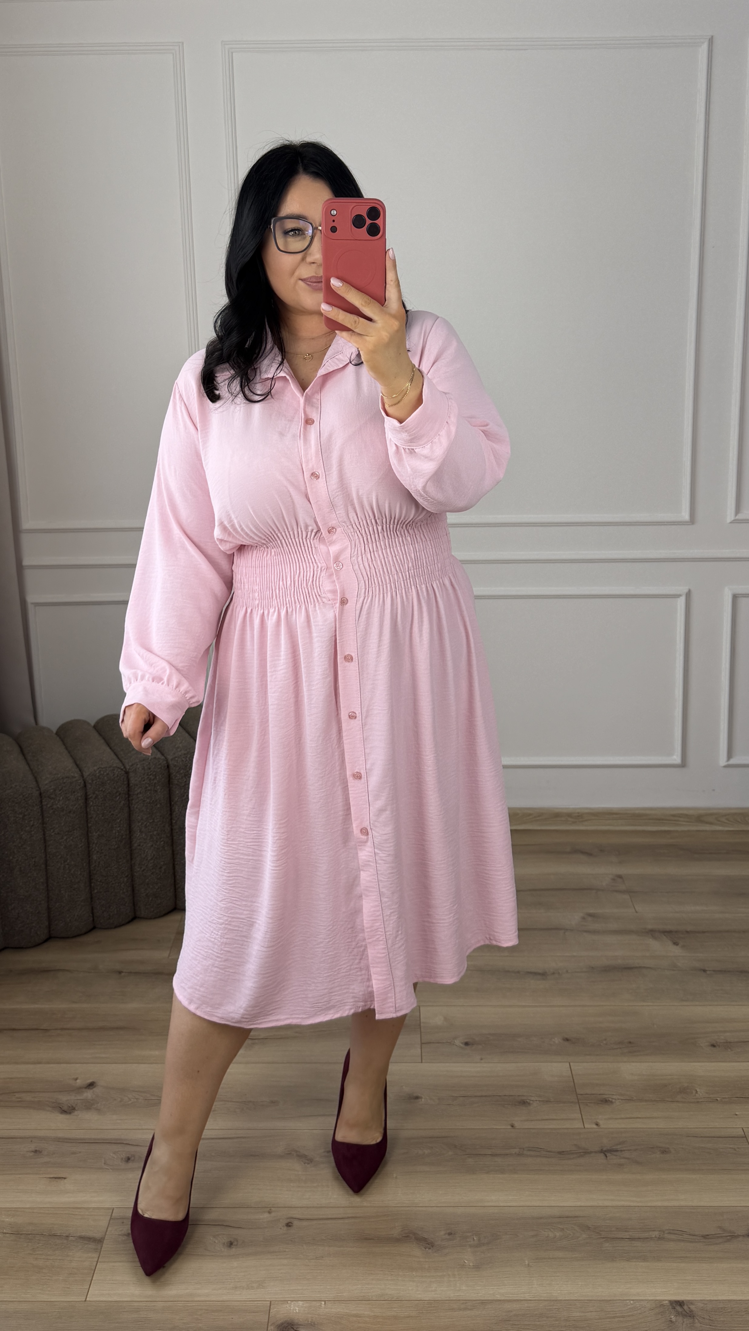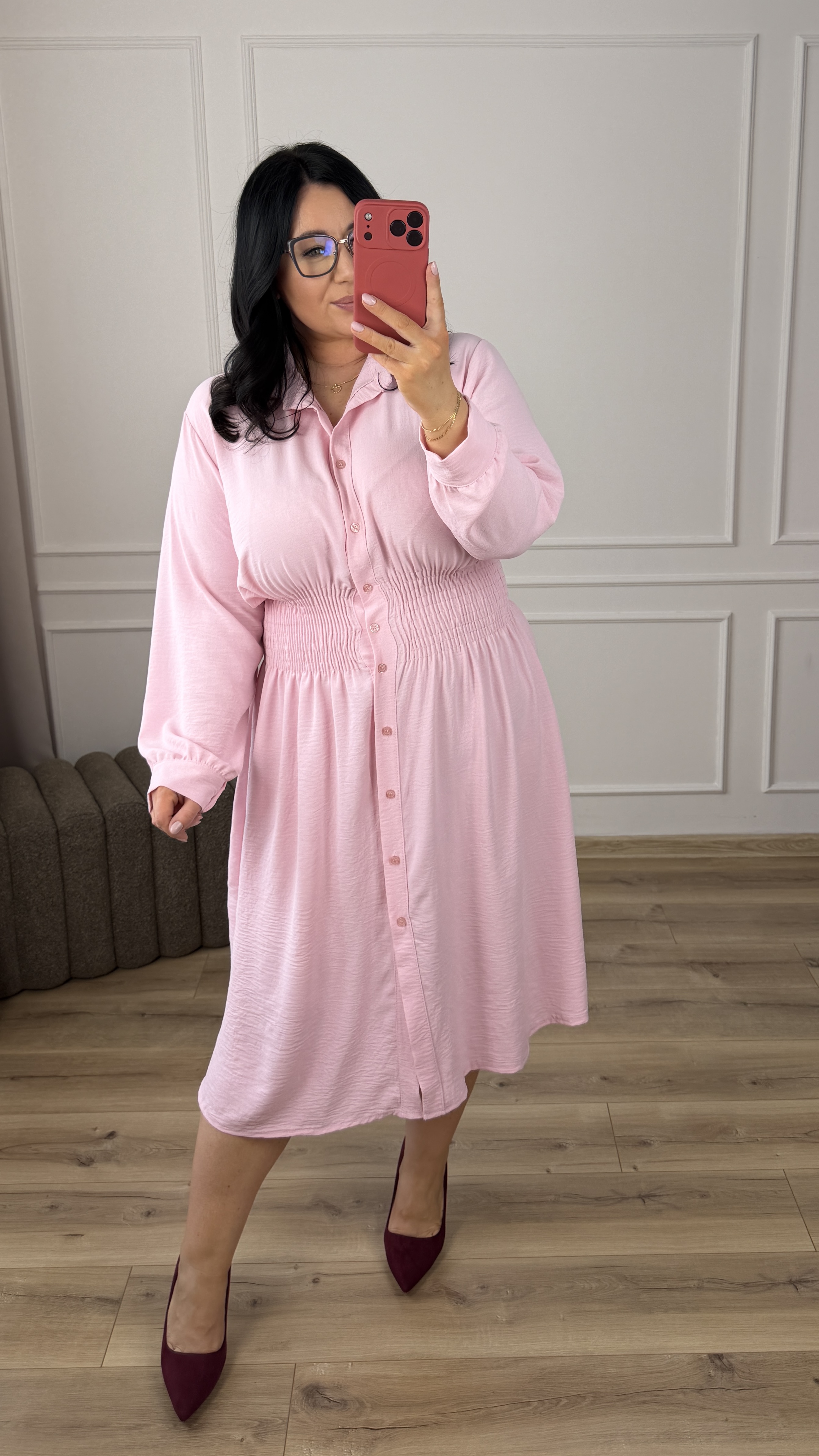 Klasyczny model sukienki typu szmizjerka z marszczeniem w pasie, dzięki czemu idealnie podkreśla talię. Sukienka długości midi, zapinana na rząd guzików. Długi rękaw wykończony mankietem z zapinanym na guzik. Sukienka dzięki swojej uniwersalności idealnie sprawdzi się na co dzień jak i również na większe wyjścia. Model dostępy w 4 kolorach.