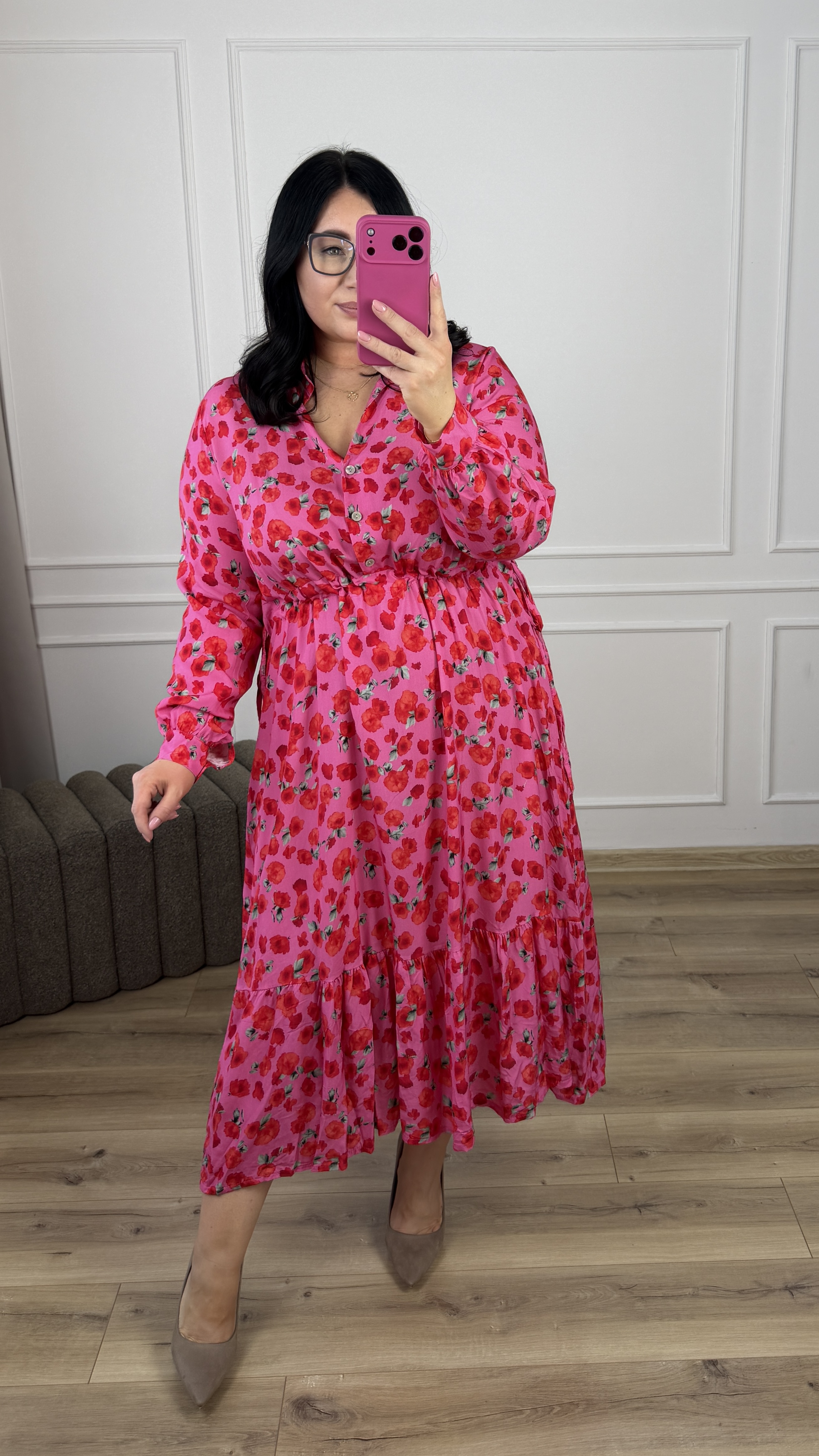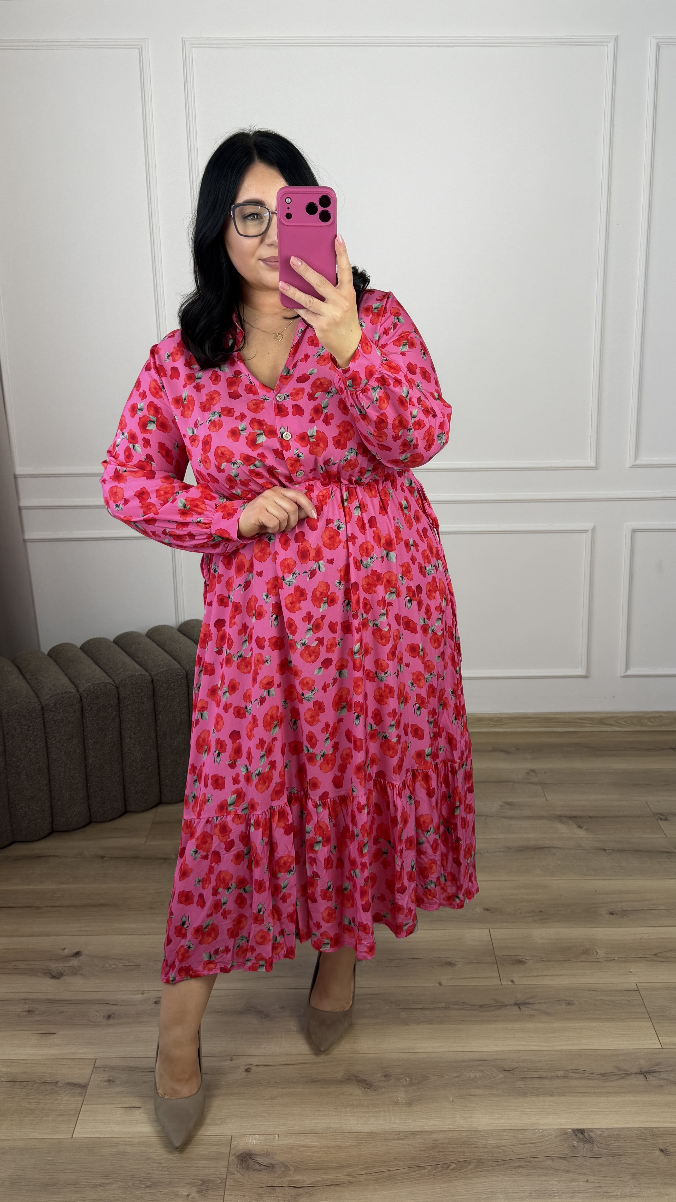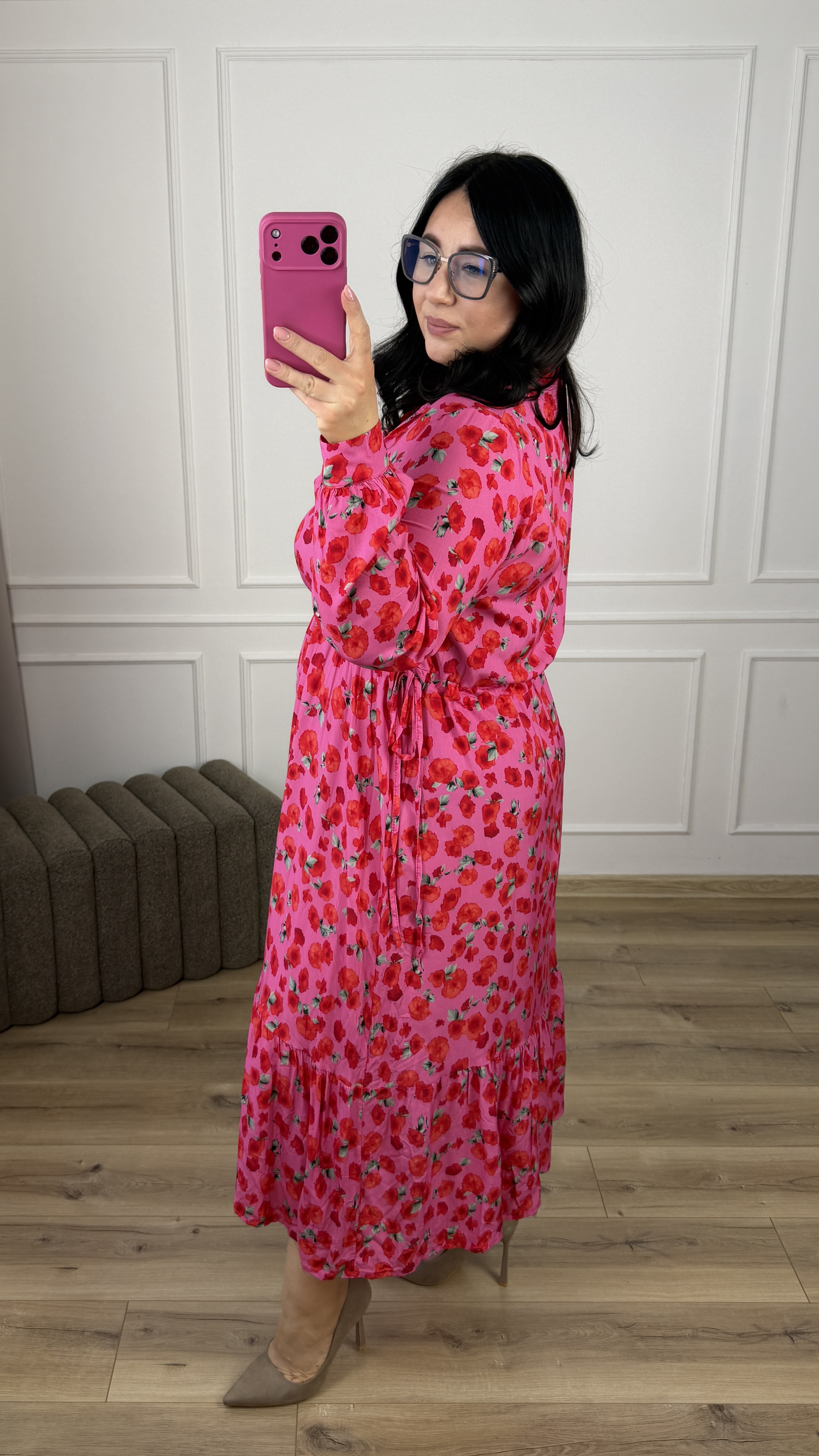 Klasyczna wiskozowa sukienka o długości midi. Góra sukienki typu szmizjerka - zapinana na guziki. W pasie wszyty panel z wiązaniem po bokach - idealnie podkreśla talię. Spódnica długości midi, lekko rozszerzana ku dołowi i wykończona falbaną. Długi rękaw zakończony mankietem i zapinany na guzik. Sukienka dzięki swojej uniwersalności idealnie sprawdzi się na co dzień jak i również na większe wyjścia.