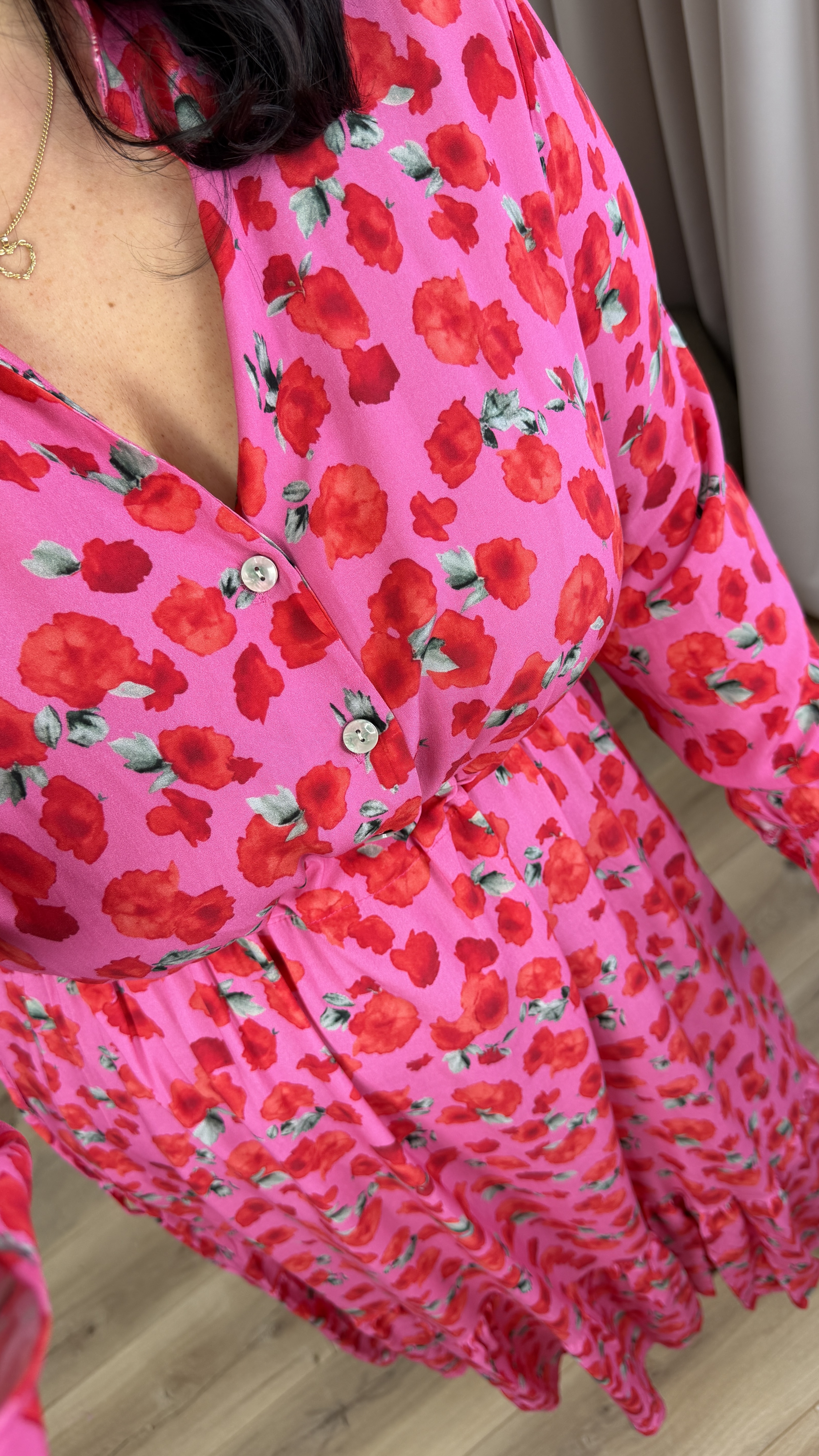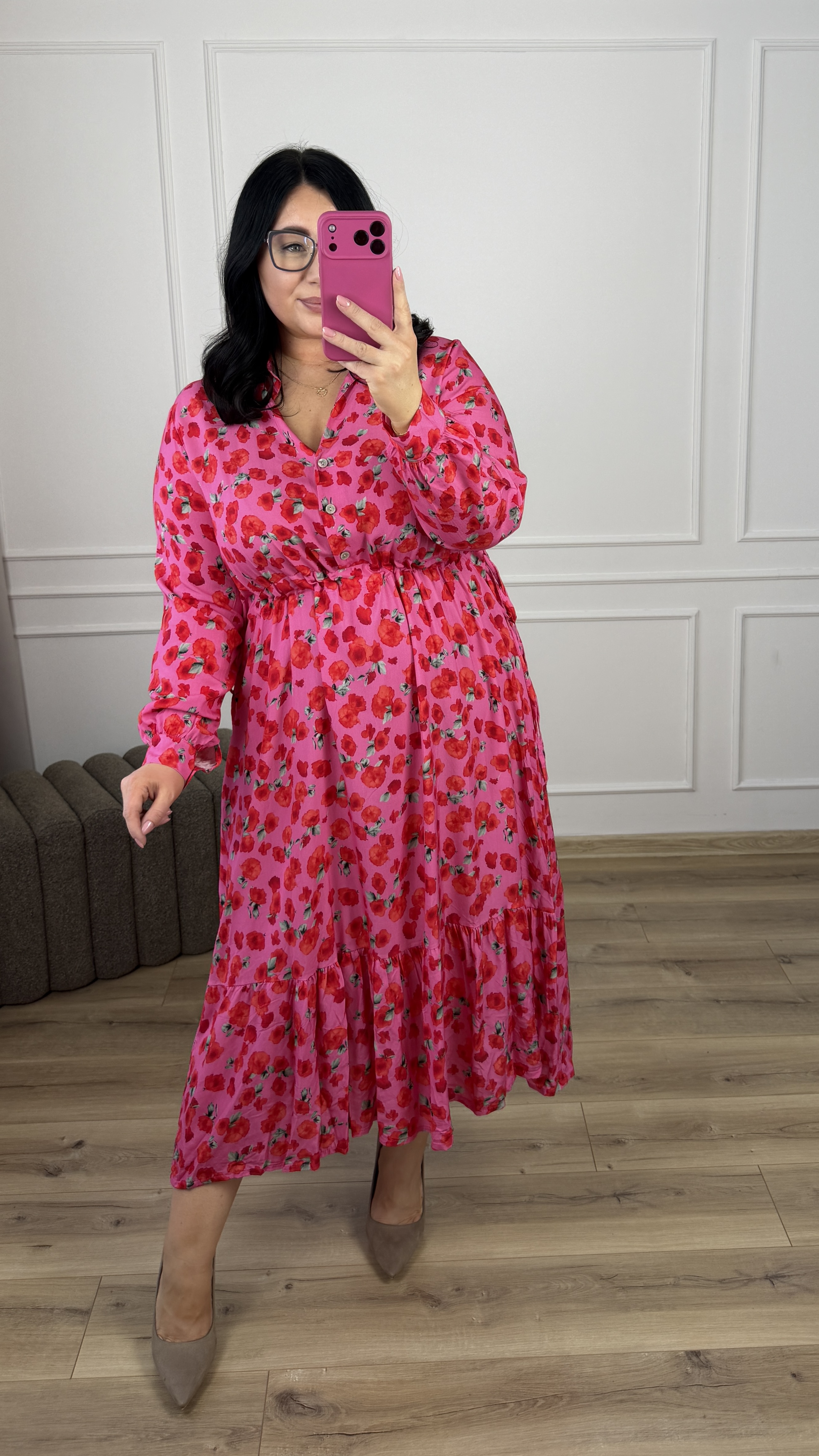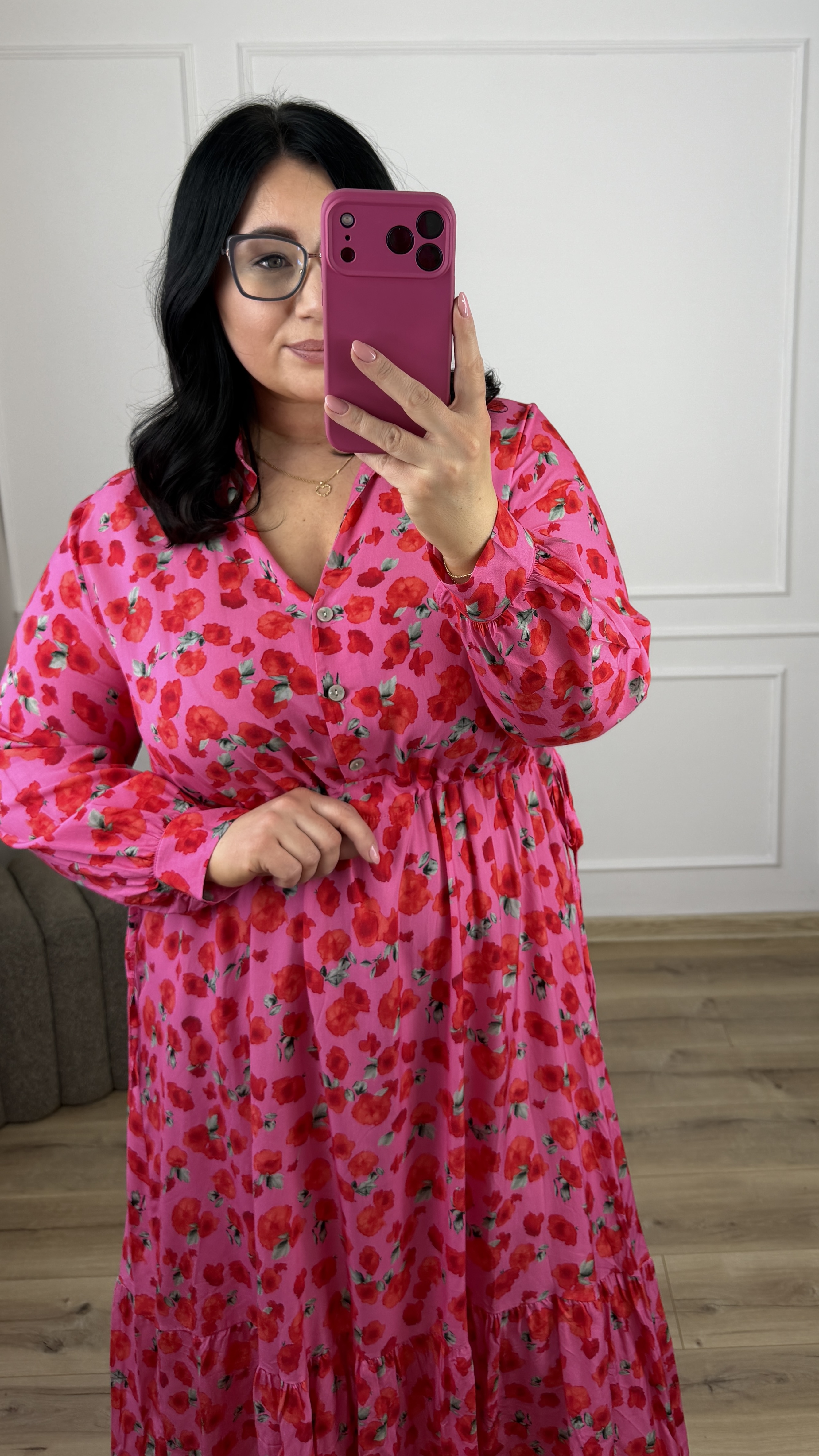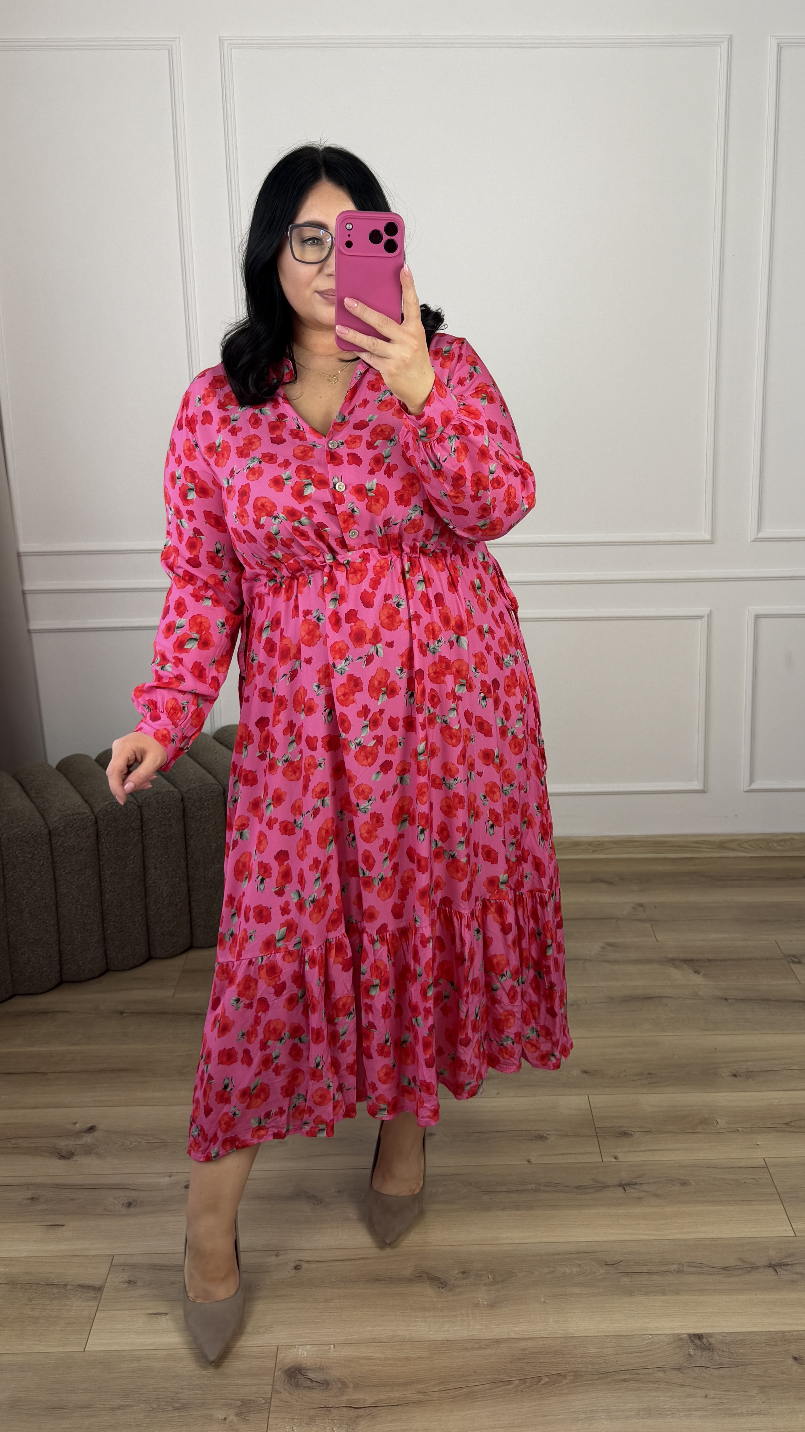 Klasyczna wiskozowa sukienka o długości midi. Góra sukienki typu szmizjerka - zapinana na guziki. W pasie wszyty panel z wiązaniem po bokach - idealnie podkreśla talię. Spódnica długości midi, lekko rozszerzana ku dołowi i wykończona falbaną. Długi rękaw zakończony mankietem i zapinany na guzik. Sukienka dzięki swojej uniwersalności idealnie sprawdzi się na co dzień jak i również na większe wyjścia.