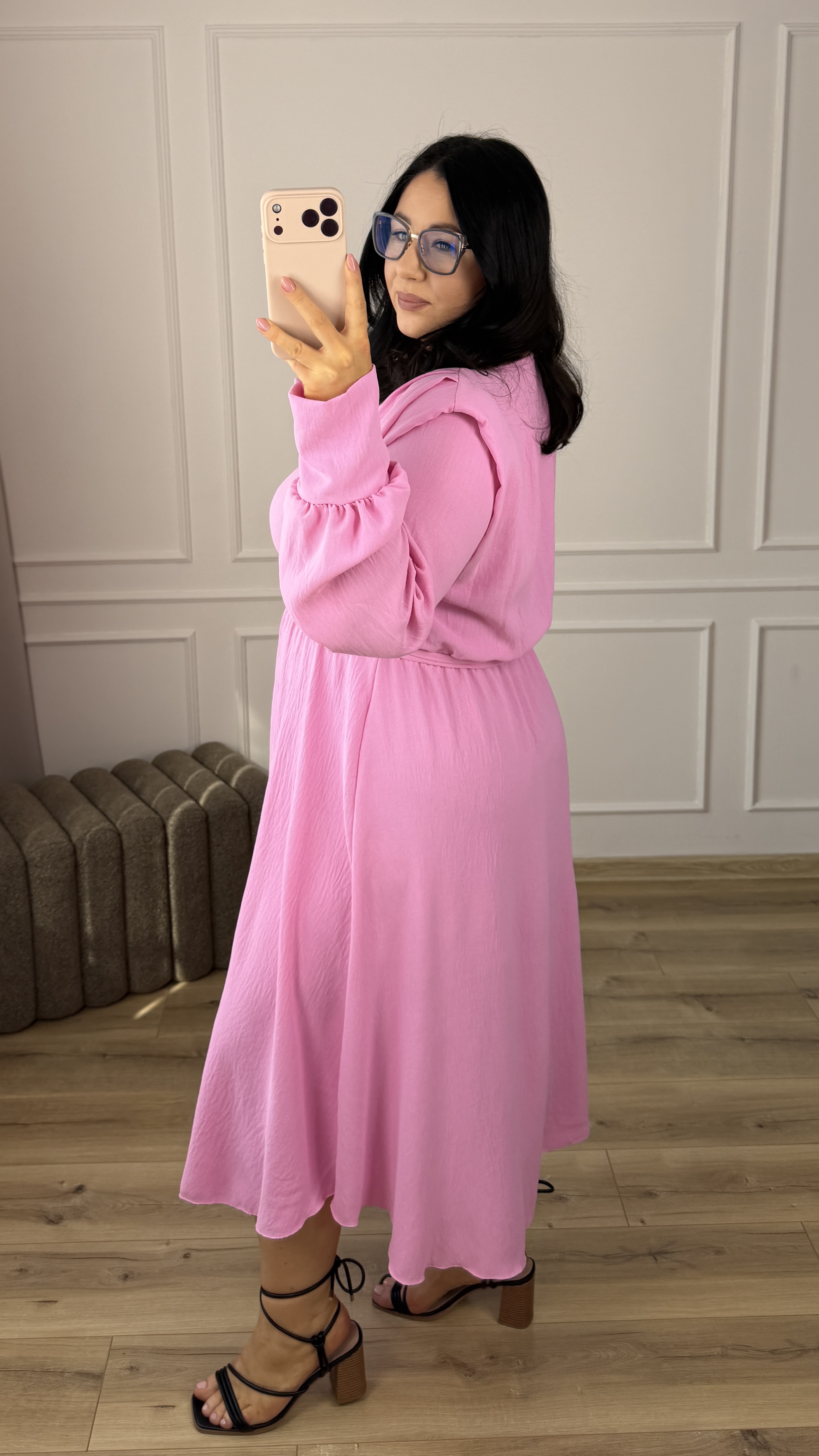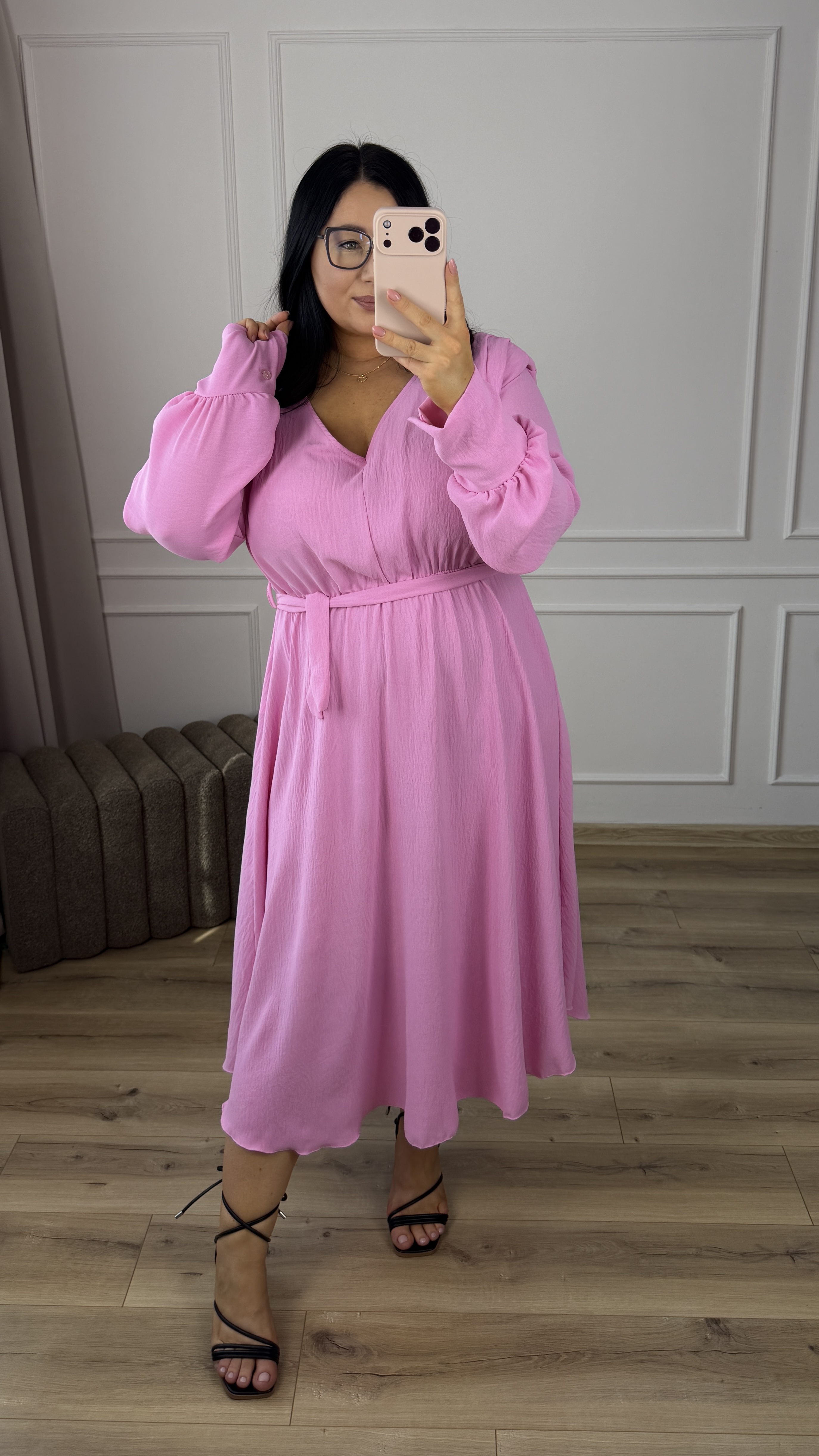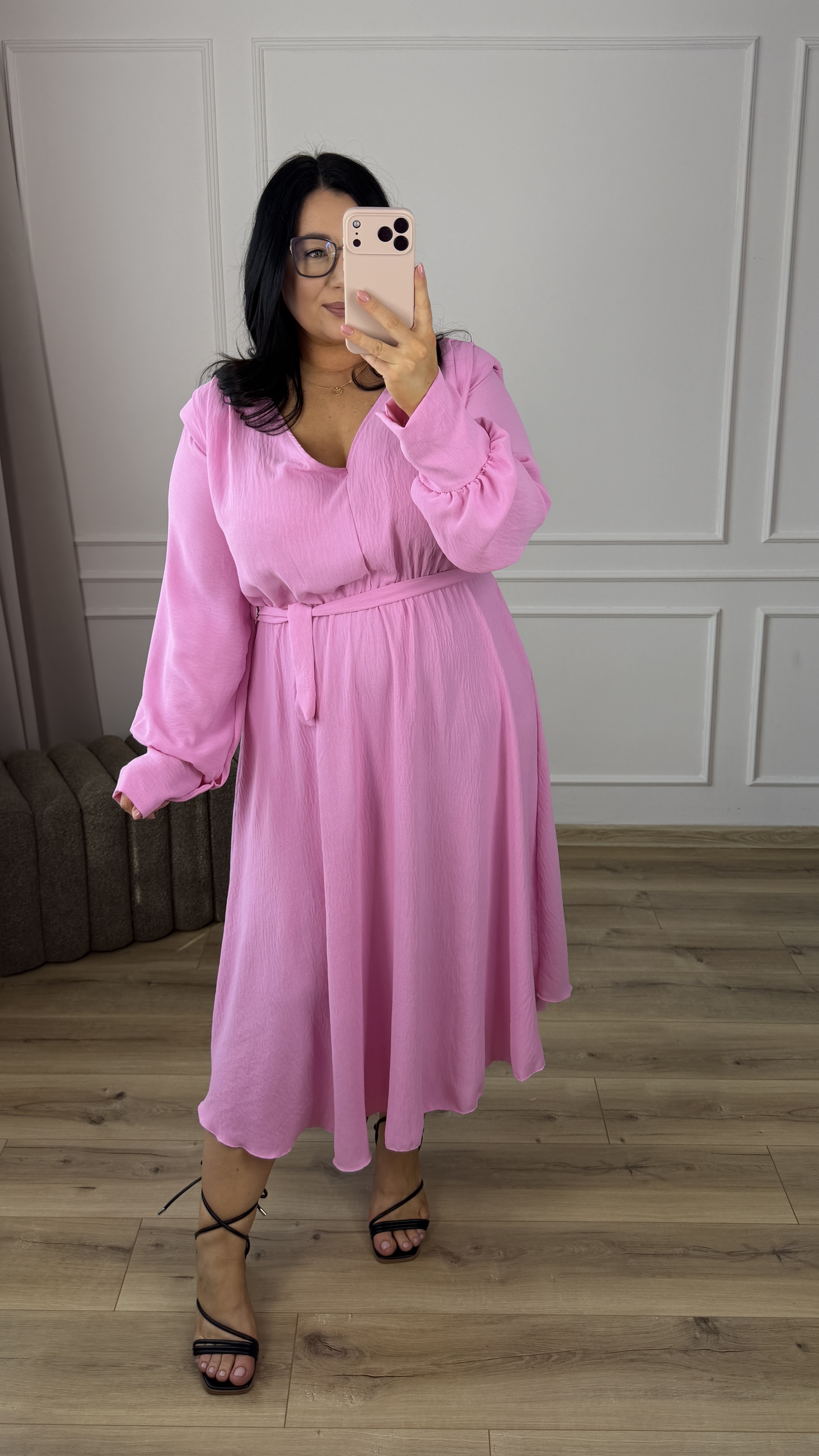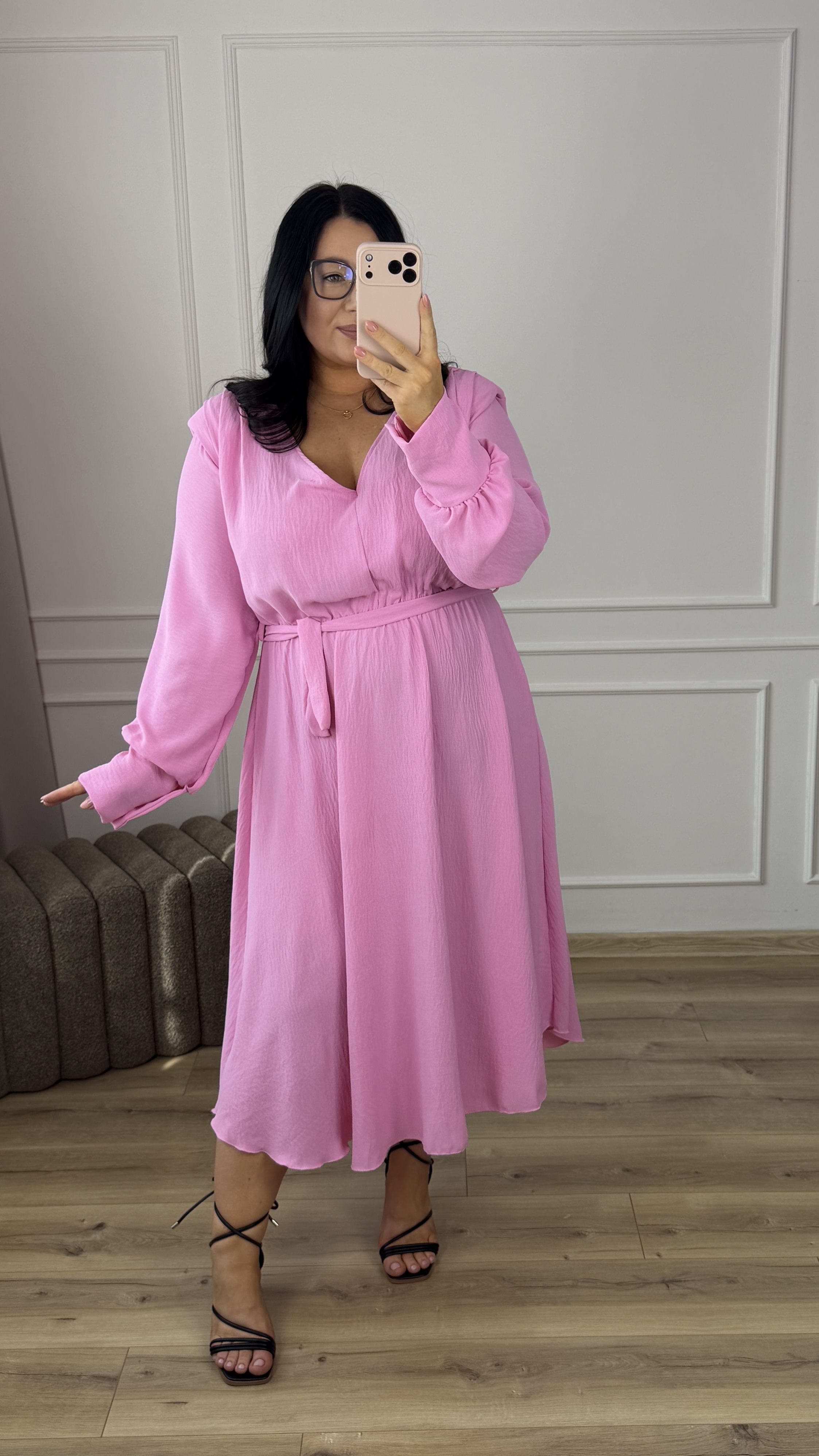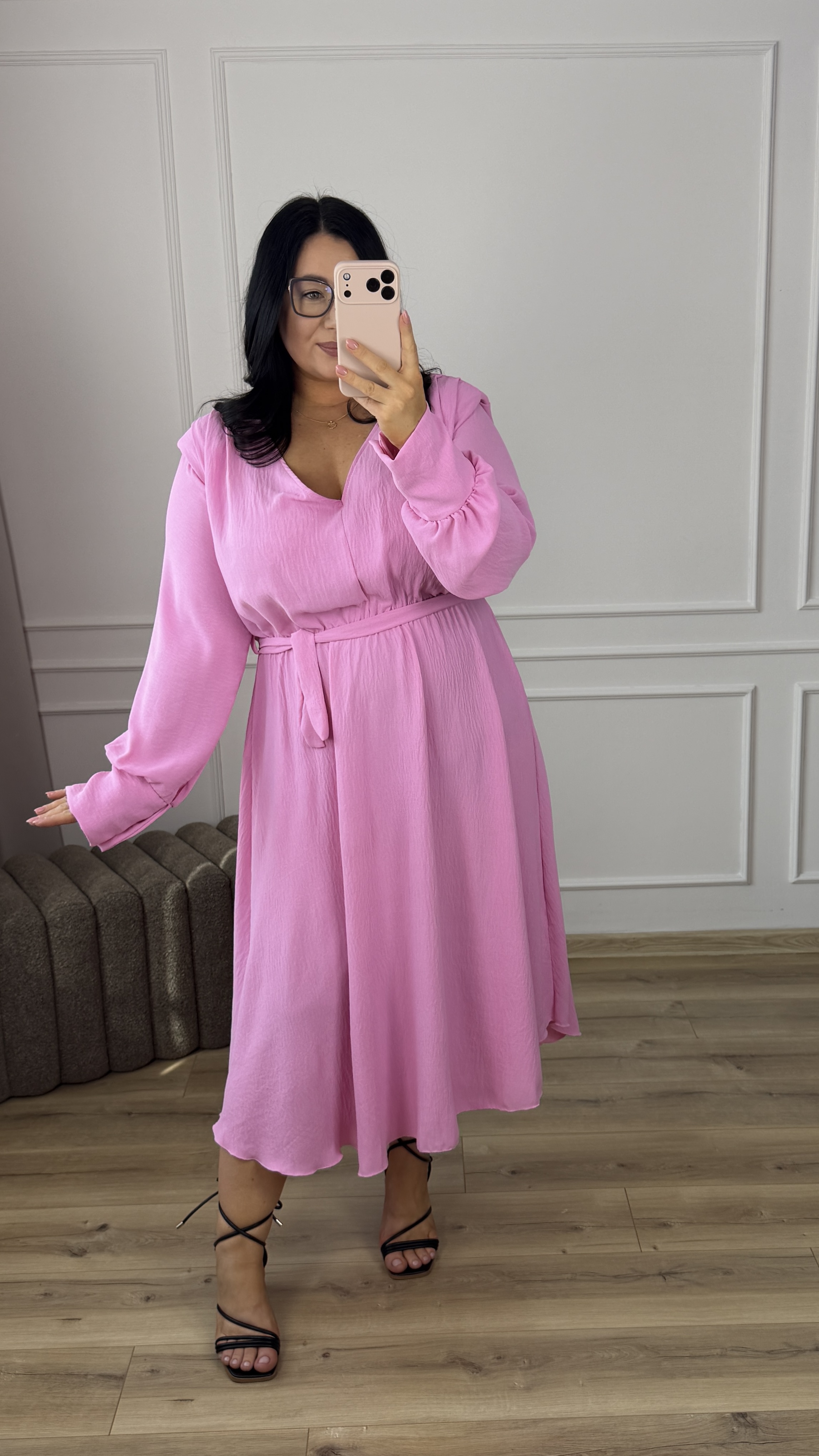 Stylowa sukienka z poduszkami na ramionach, które nadają jej eleganckiego charakteru. Delikatny dekolt w serek świetnie podkreśla dekolt. Sukienka posiada gumkę w pasie oraz wiązany pasek dzięki czemu sukienka idealnie podkreśla kobiece kształty. Sukienka posiada długie rękawy - można je wywinąć, dzięki długiemu mankietowi.