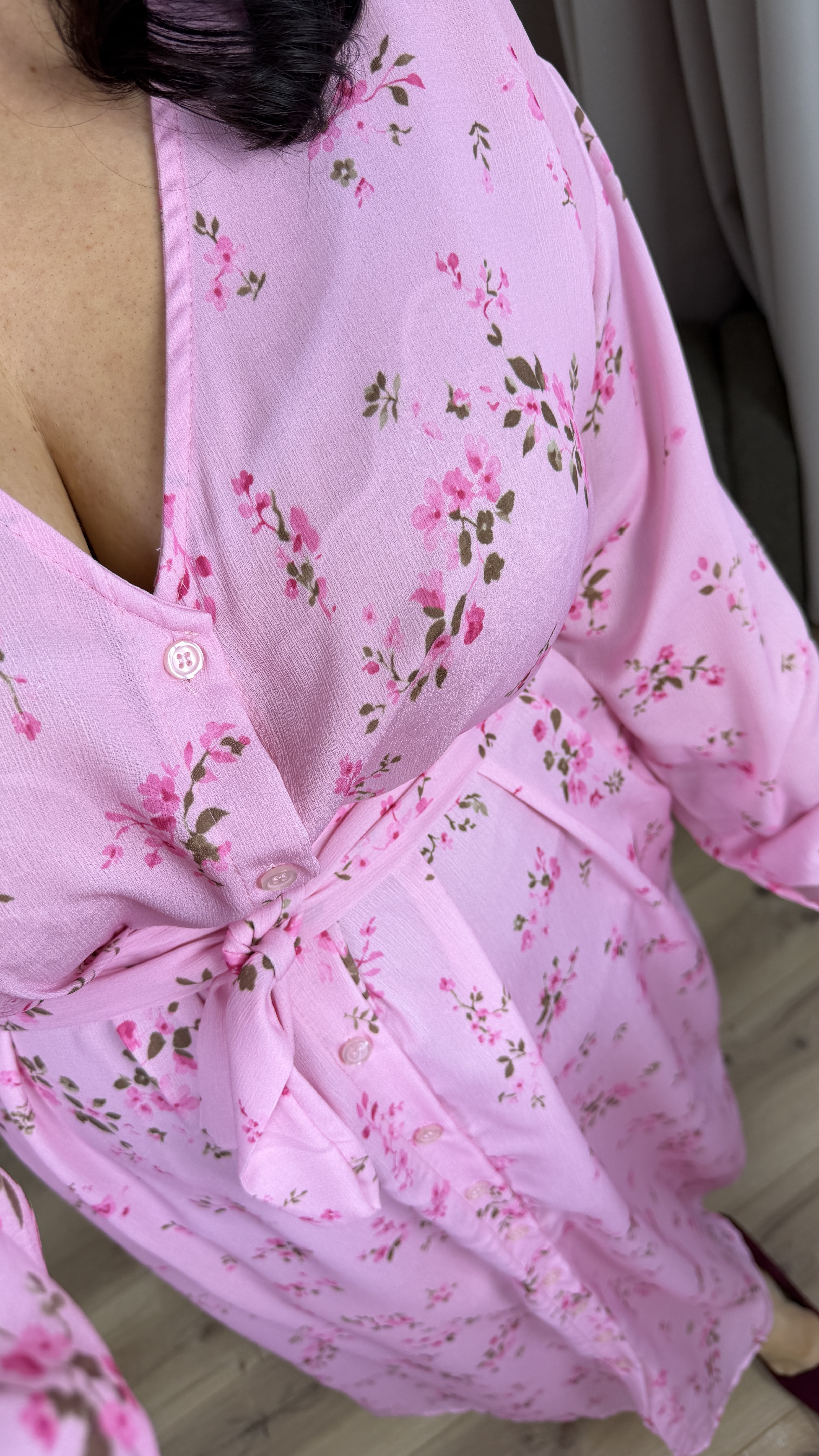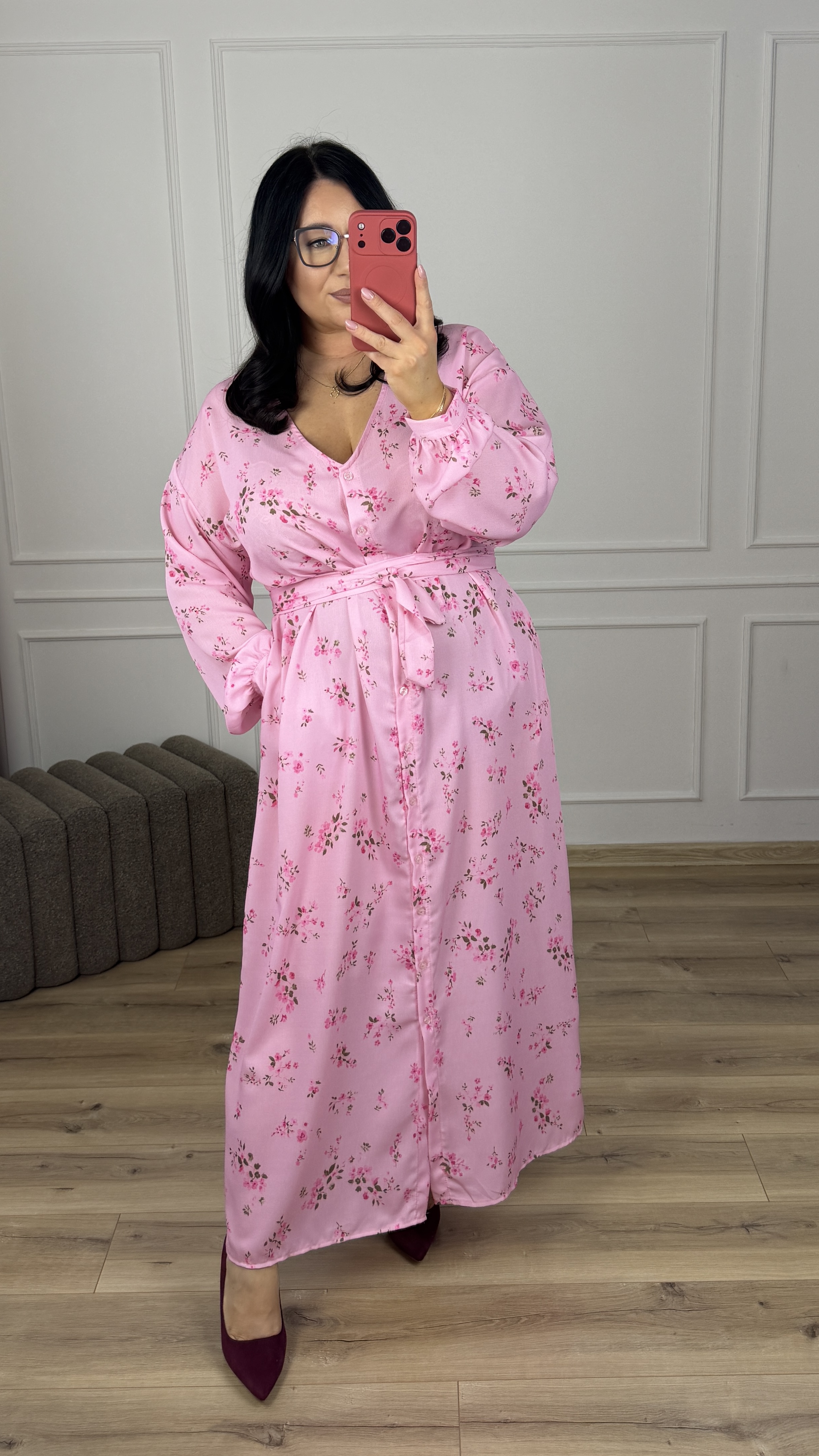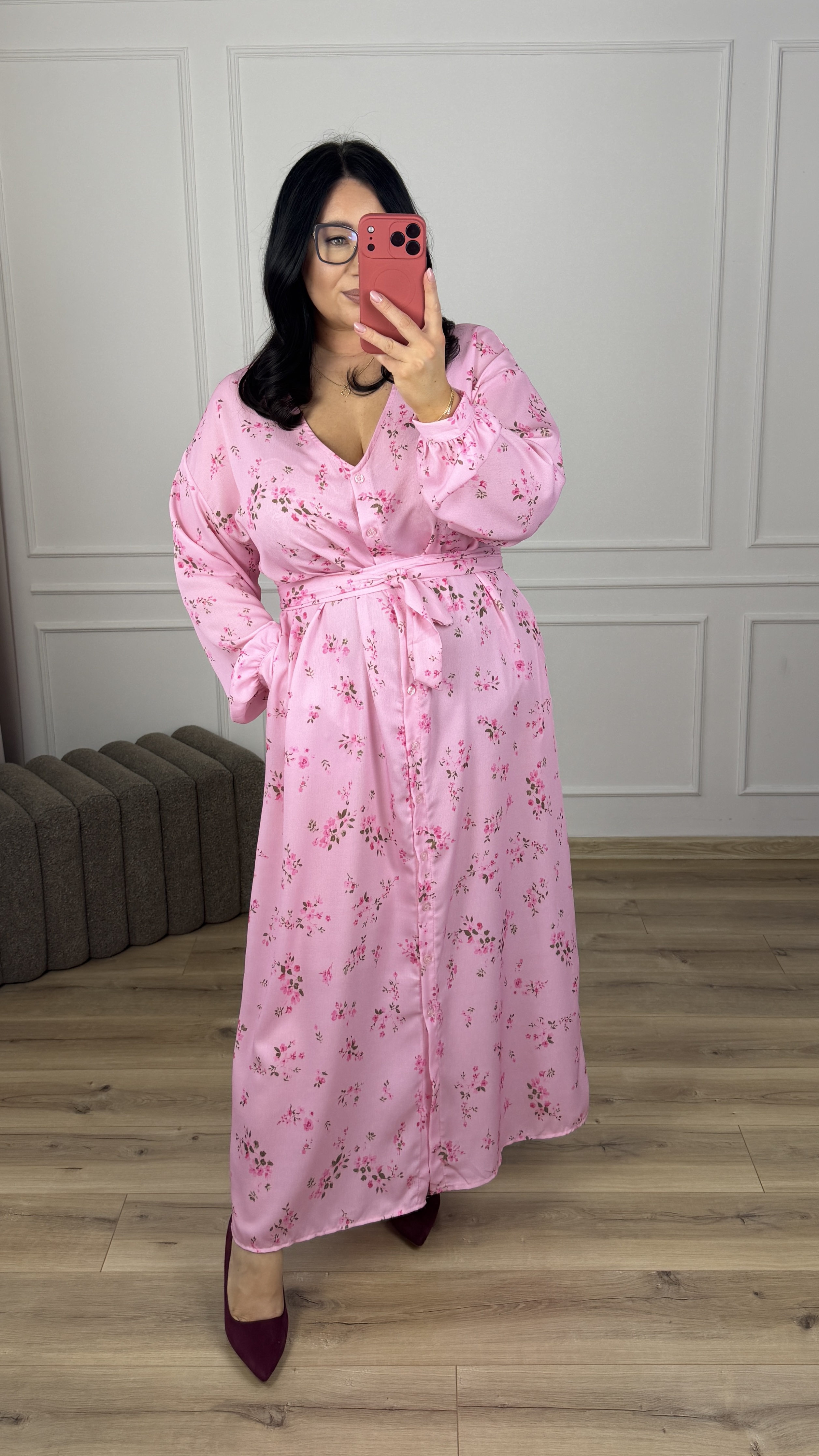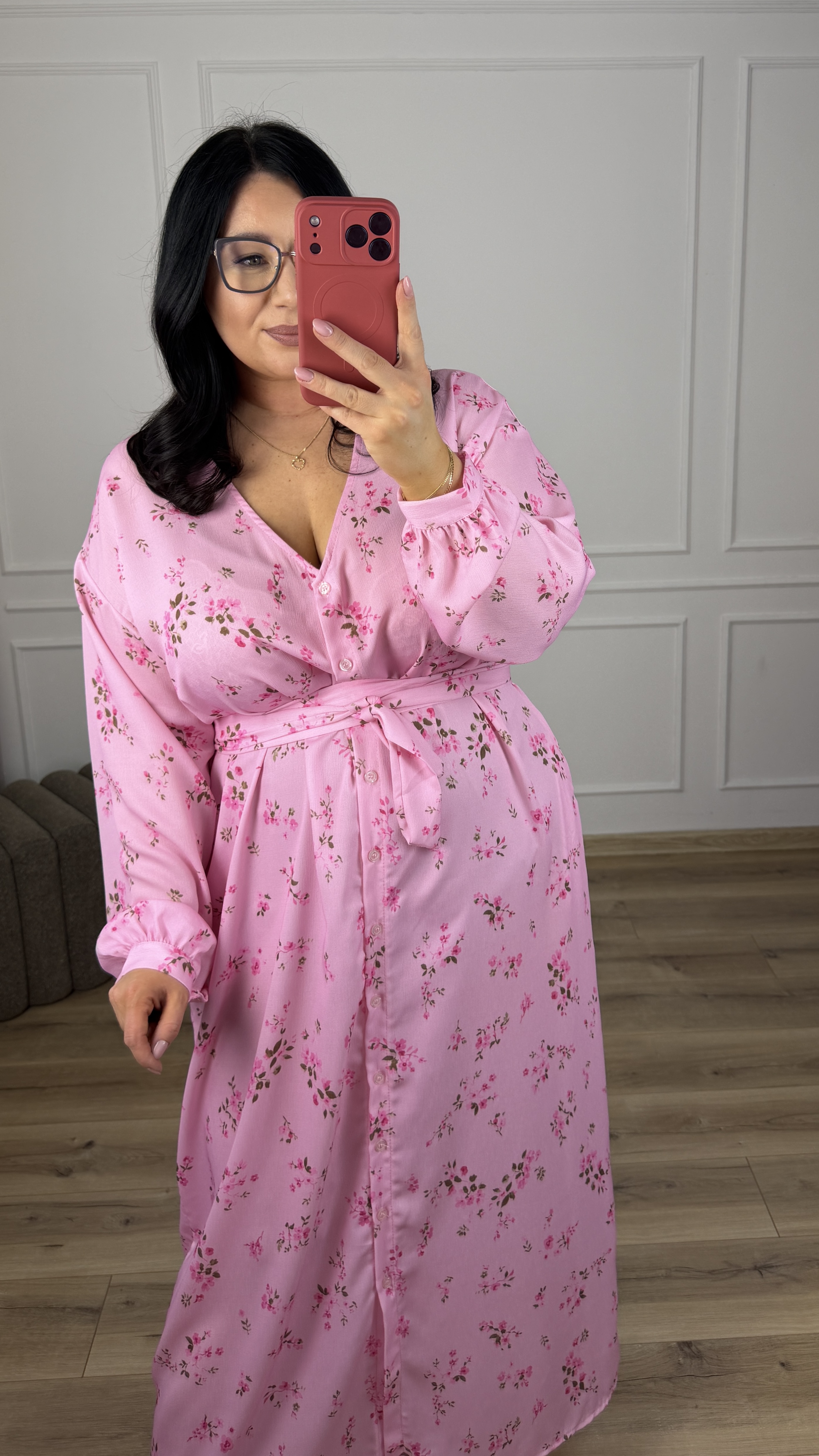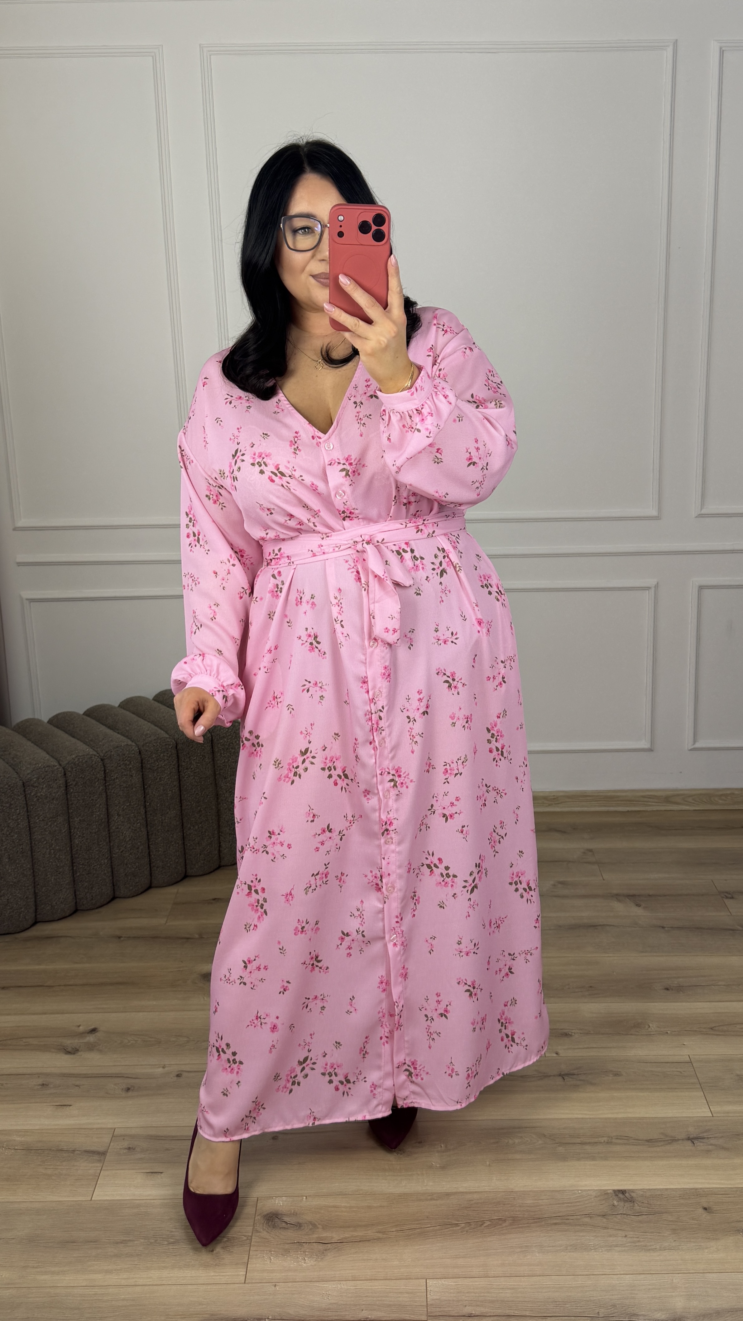 Sukienka szmizjerka długości maxi w kwiatowy wzór. Sukienka typu szmizjerka czyli zapinana na rząd guzików z ozdobnym wiązanym pasem. Delikatny dekolt w serek, długi rękaw zakończony mankietem i zapięciem na guzik. Sukienka posiada kieszenie. Model o luźnym, swobodnym fasonie zapewnia swobodę i nie krępuje ruchu. Sukienka dostępna w 4 kwiatowych printach.