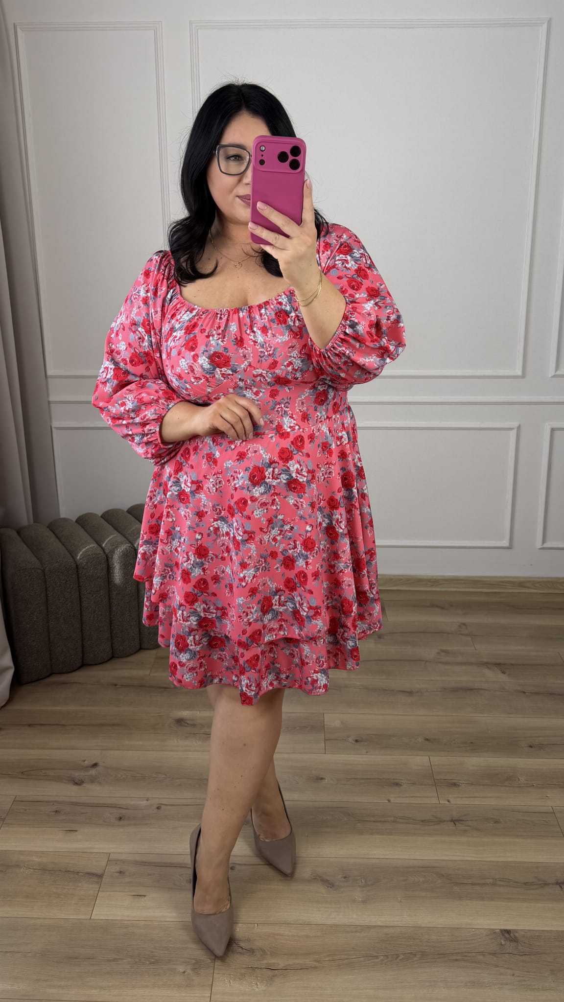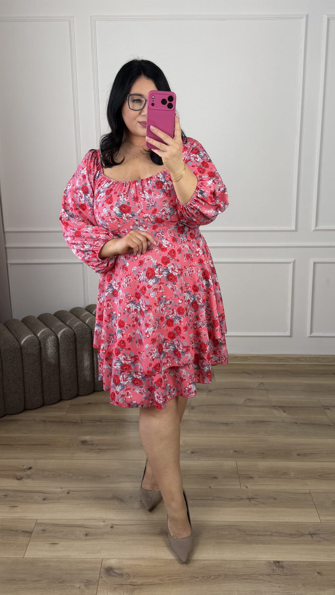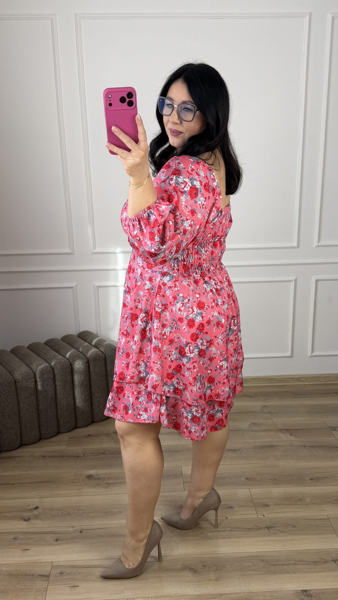Efektowna sukienka ze ściąganym dekoltem który można nosić normalnie oraz jako hiszpankę. Długi, szeroki rękaw zakończony gumką. Podkreślona talia, gumki na plecach przez co ładnie dopasowuje się do sylwetki, rozkloszowana podwójna spódnica. Sukienka dzięki swojej uniwersalności idealnie sprawdzi się na co dzień jak i również na większe wyjścia.