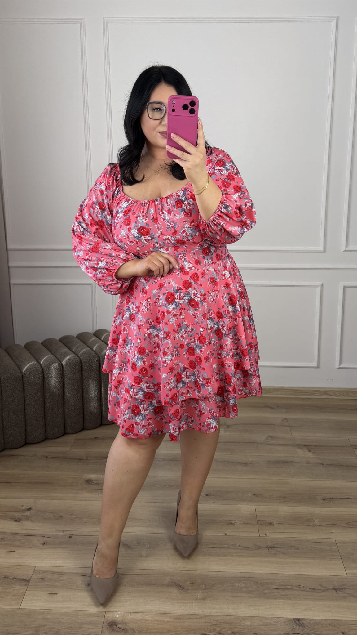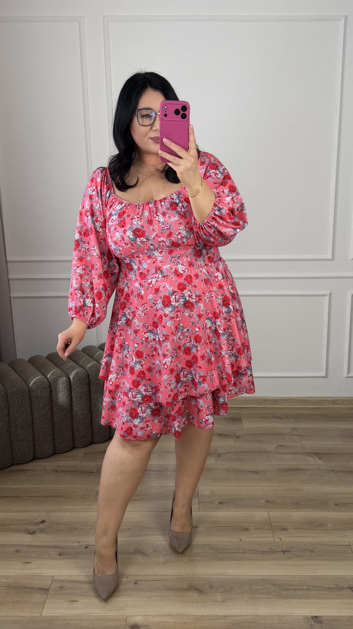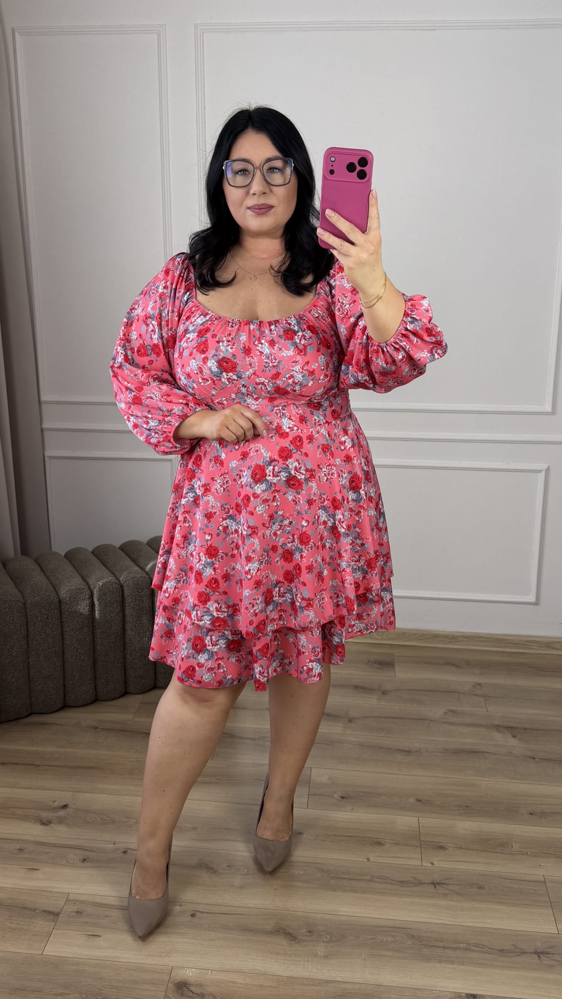 Efektowna sukienka ze ściąganym dekoltem który można nosić normalnie oraz jako hiszpankę. Długi, szeroki rękaw zakończony gumką. Podkreślona talia, gumki na plecach przez co ładnie dopasowuje się do sylwetki, rozkloszowana podwójna spódnica. Sukienka dzięki swojej uniwersalności idealnie sprawdzi się na co dzień jak i również na większe wyjścia.
