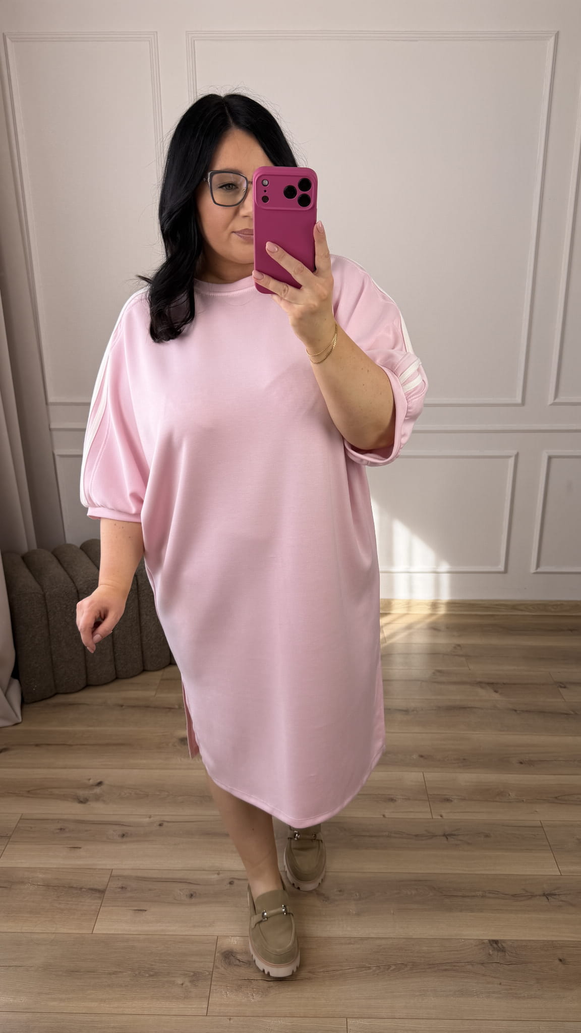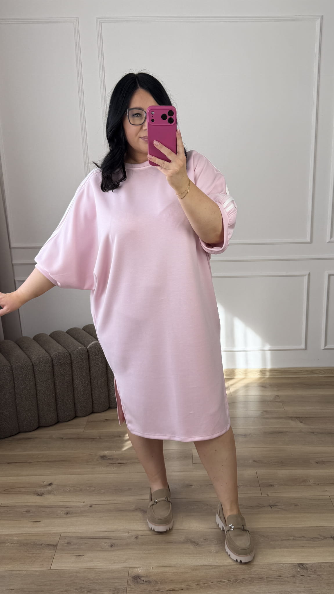 Prosta sukienka w sportowym stylu. Sukienka o kroju nietoperza - luźniejsza góra i zwężana ku dołowi. Sukienka posiada ozdobne paski na ramionach, luźniejszy rękaw, okrągły dekolt. Sukienka długości midi z dwoma rozcięciami po boku. Sukienka dzięki swojej uniwersalności idealnie sprawdzi się na co dzień.