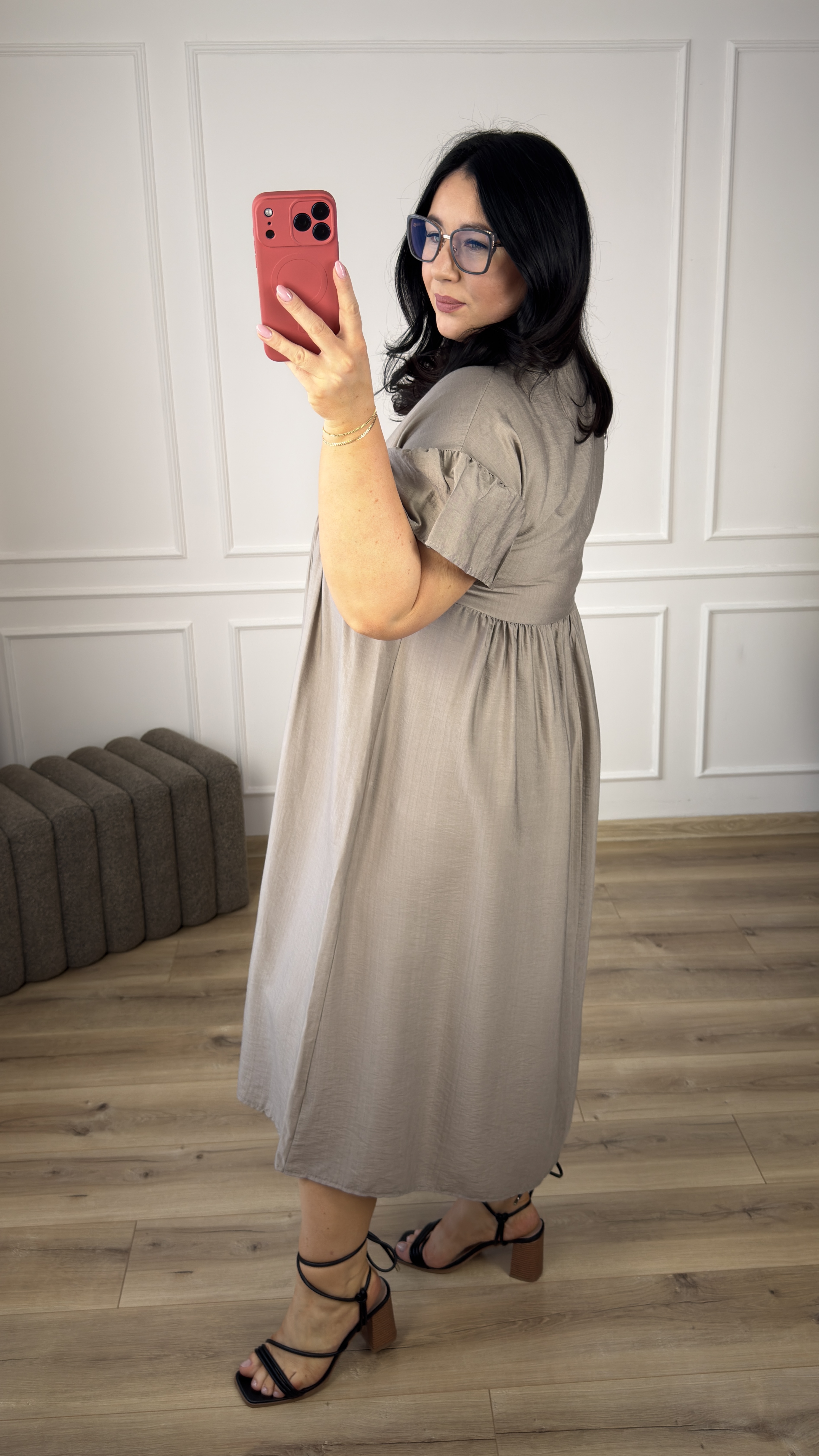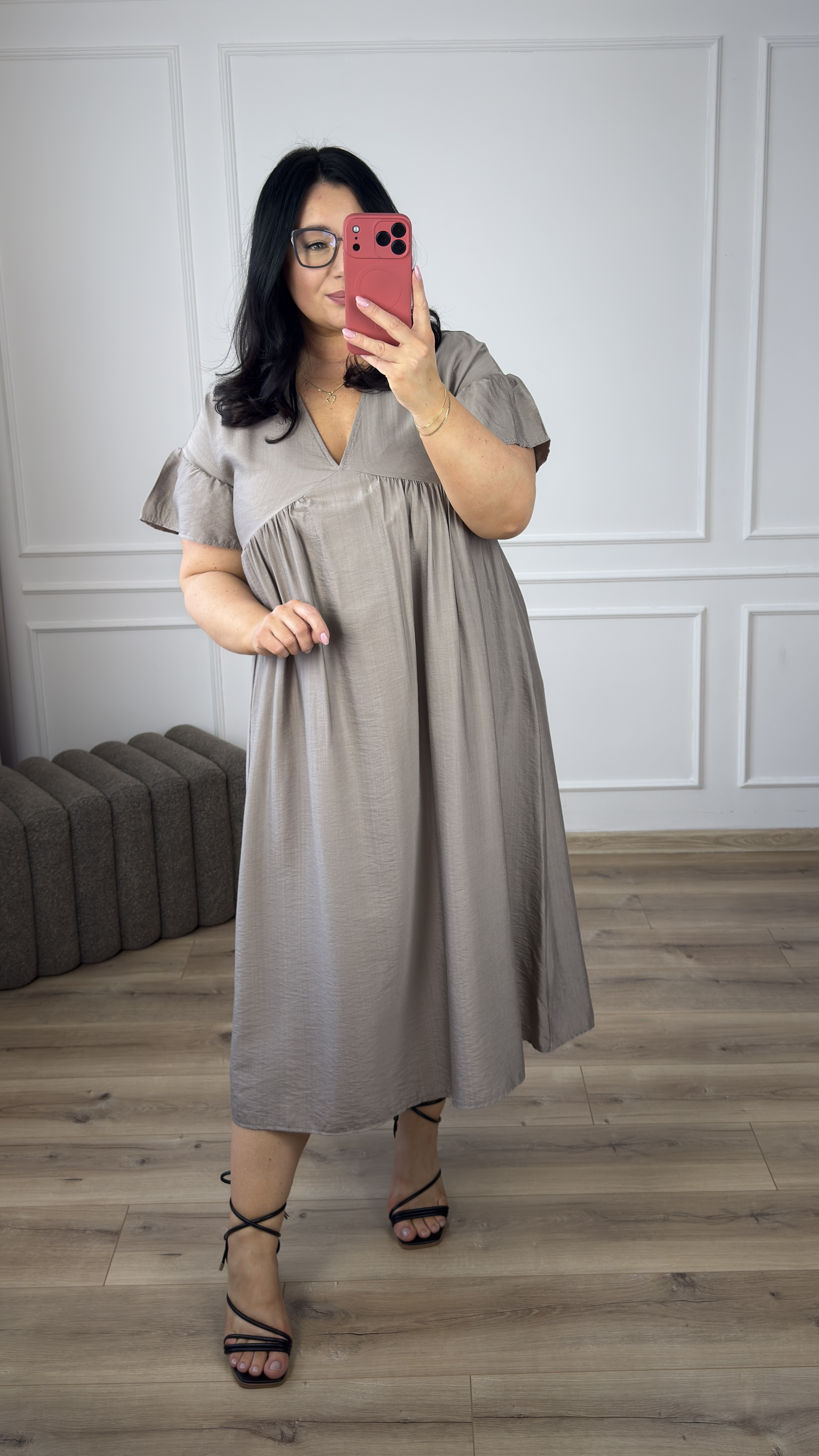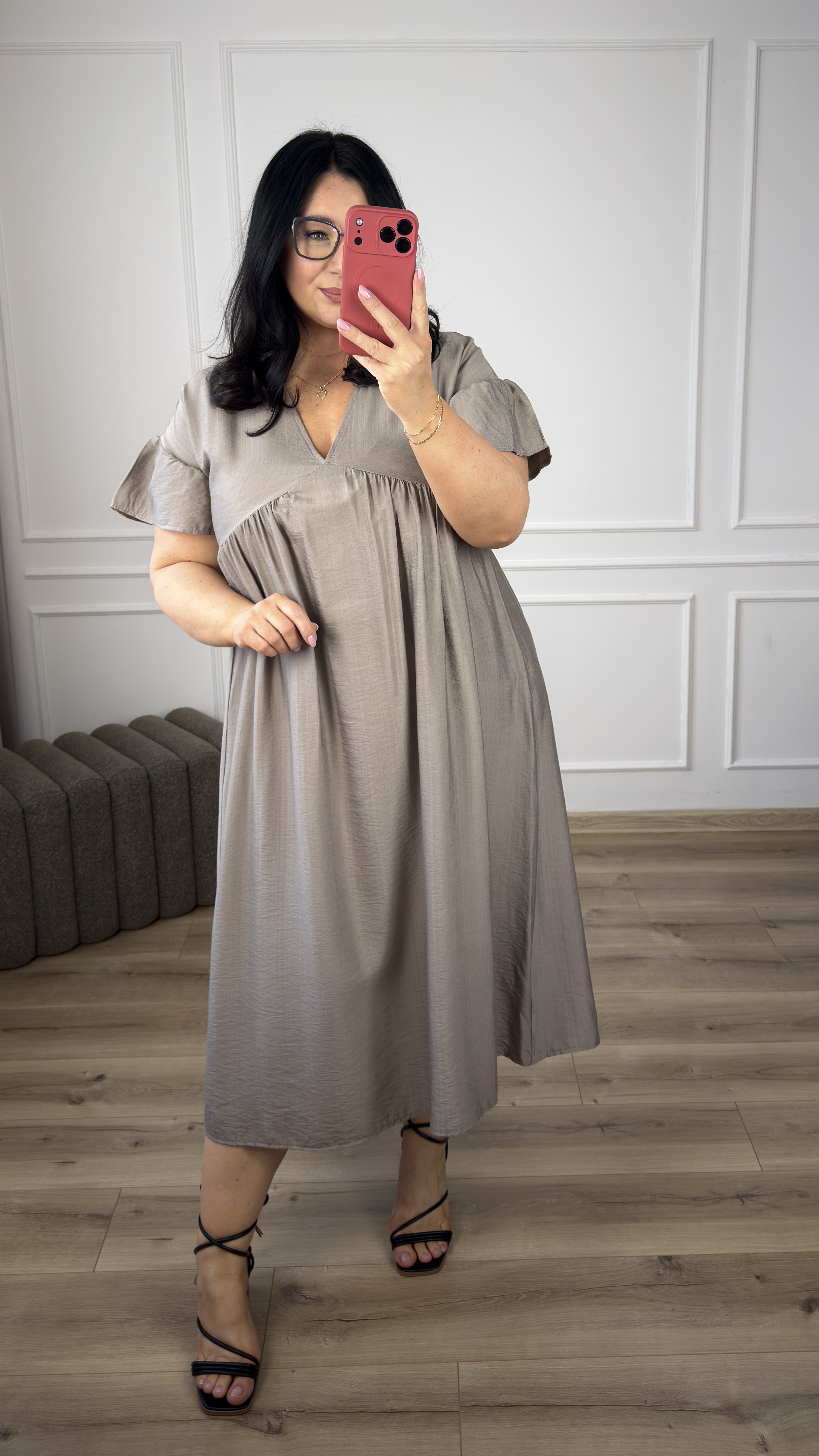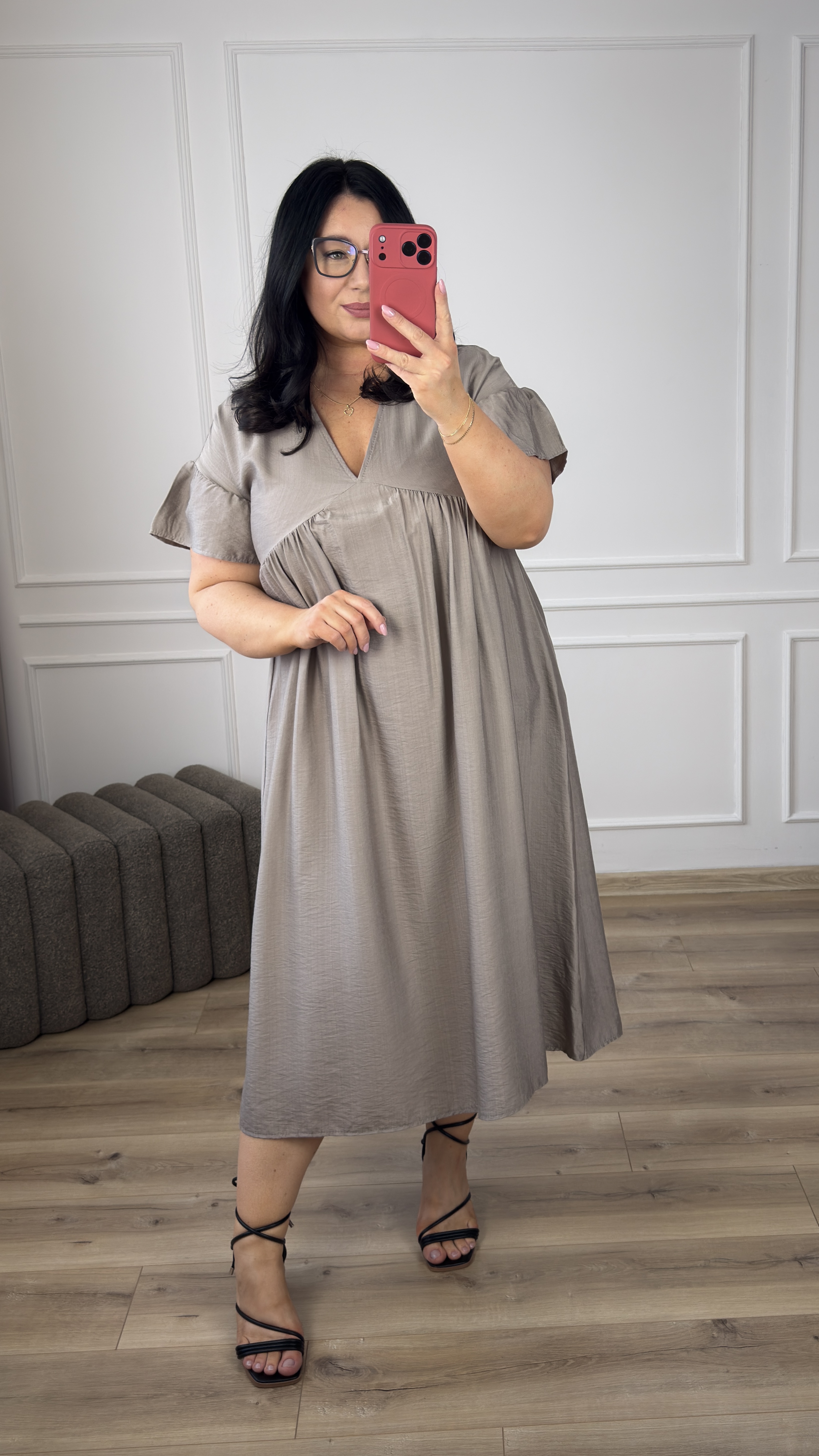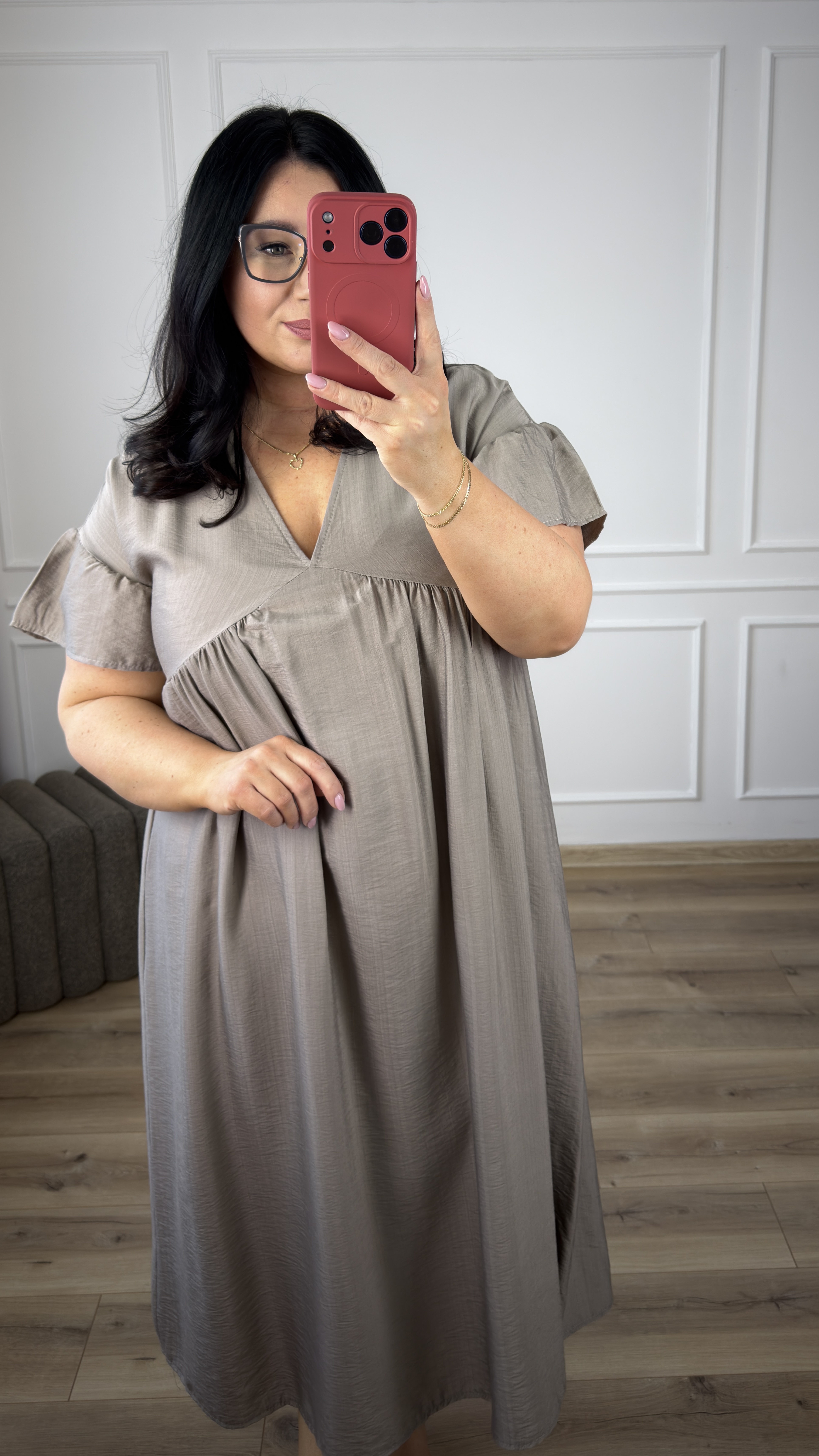 Stylowa sukienka o luźnym, swobodnym kroju, wykonana z cienkiej i przyjemnej wiskozy. To idealna propozycja na co dzień. Model o luźnym fasonie zapewnia swobodę ruchu i komfort noszenia, jednocześnie wpisując się w casualowe stylizacje. Sukienka posiada krótki rękaw wykończony delikatną falbaną oraz dekolt w serek. Rozkloszowany ku dołowi krój sprawia, że model pięknie układa się na sylwetce i nadaje jej lekkości.