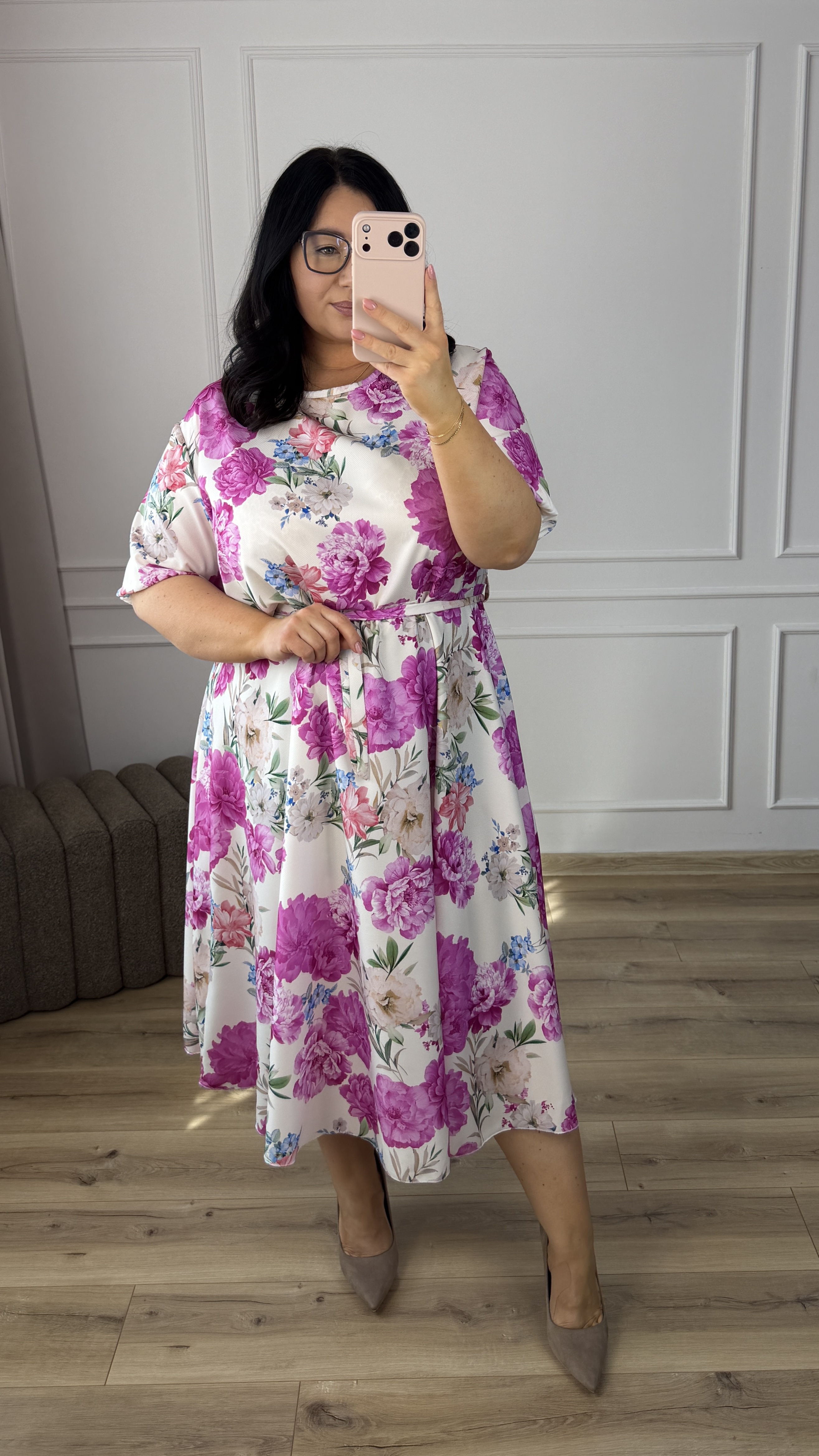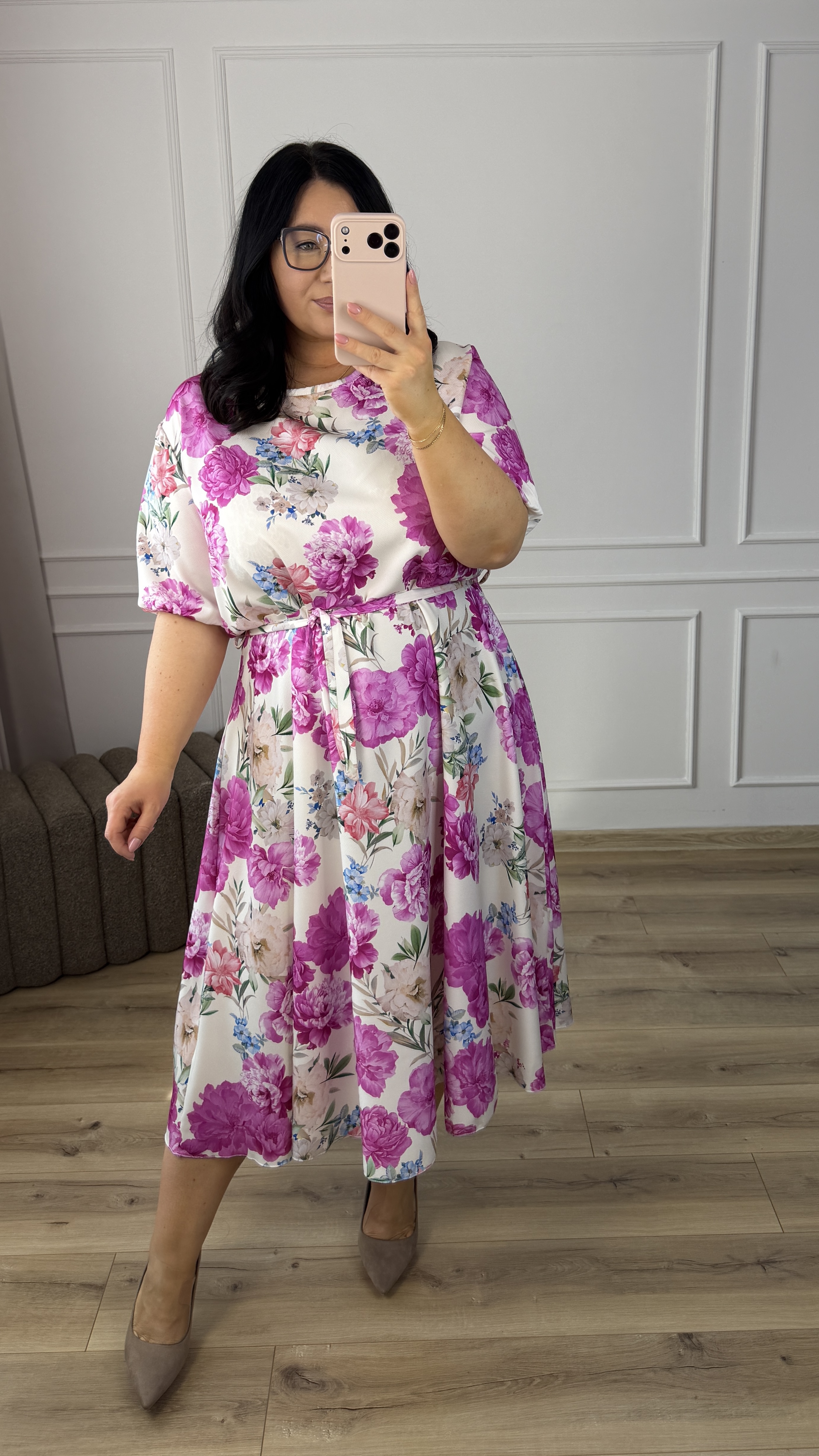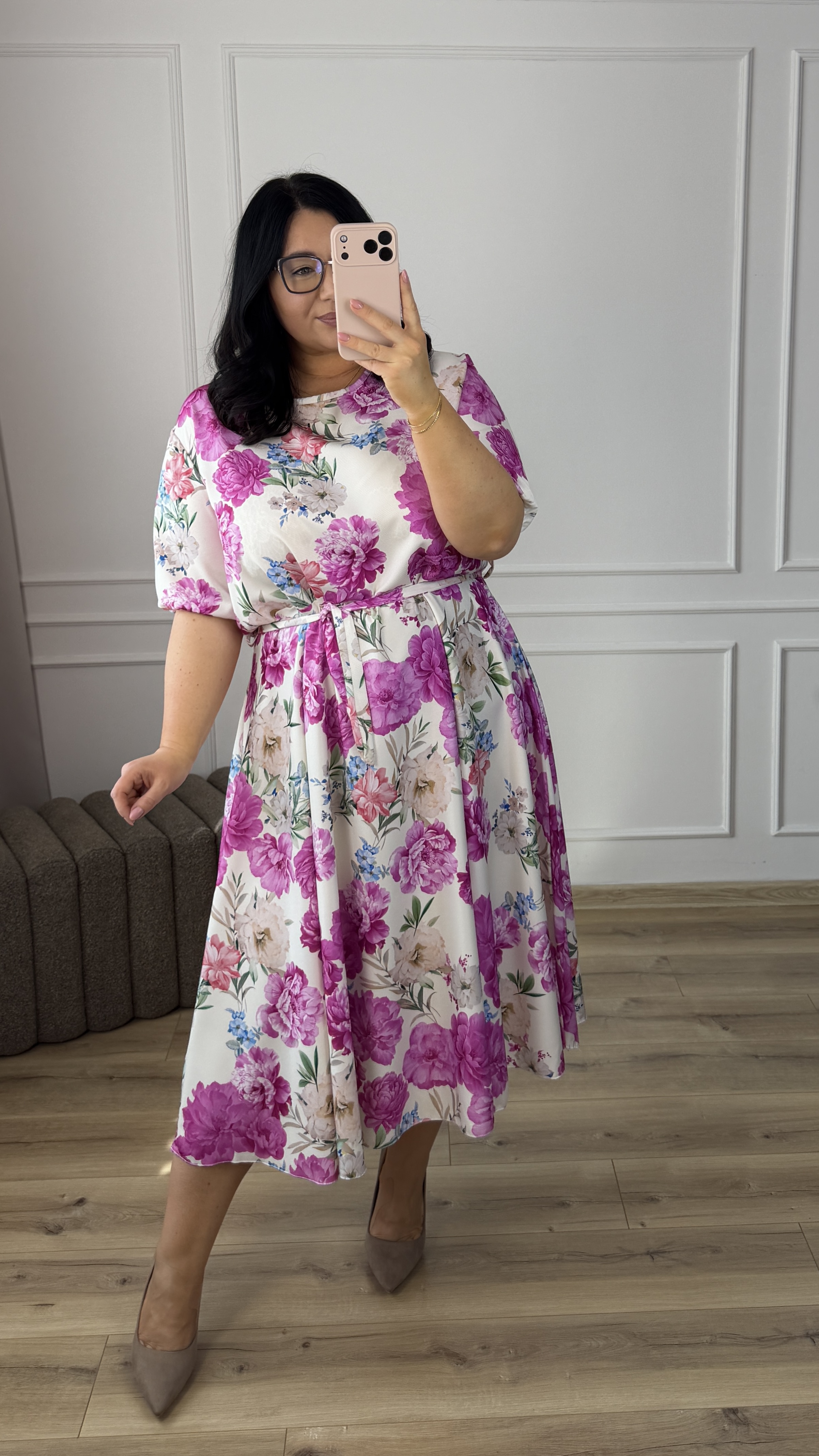 Klasyczna sukienka w kwiatki o długości midi. Spódnica szyta z koła przez co ładnie się układa. Okrągły dekolt oraz wiązany pasek w pasie. Krótki bufkowy rękaw zakończony gumką, przez co można dostosować jego długość wg. preferencji. Sukienka dzięki swojej uniwersalności idealnie sprawdzi się na co dzień jak i również na większe wyjścia.