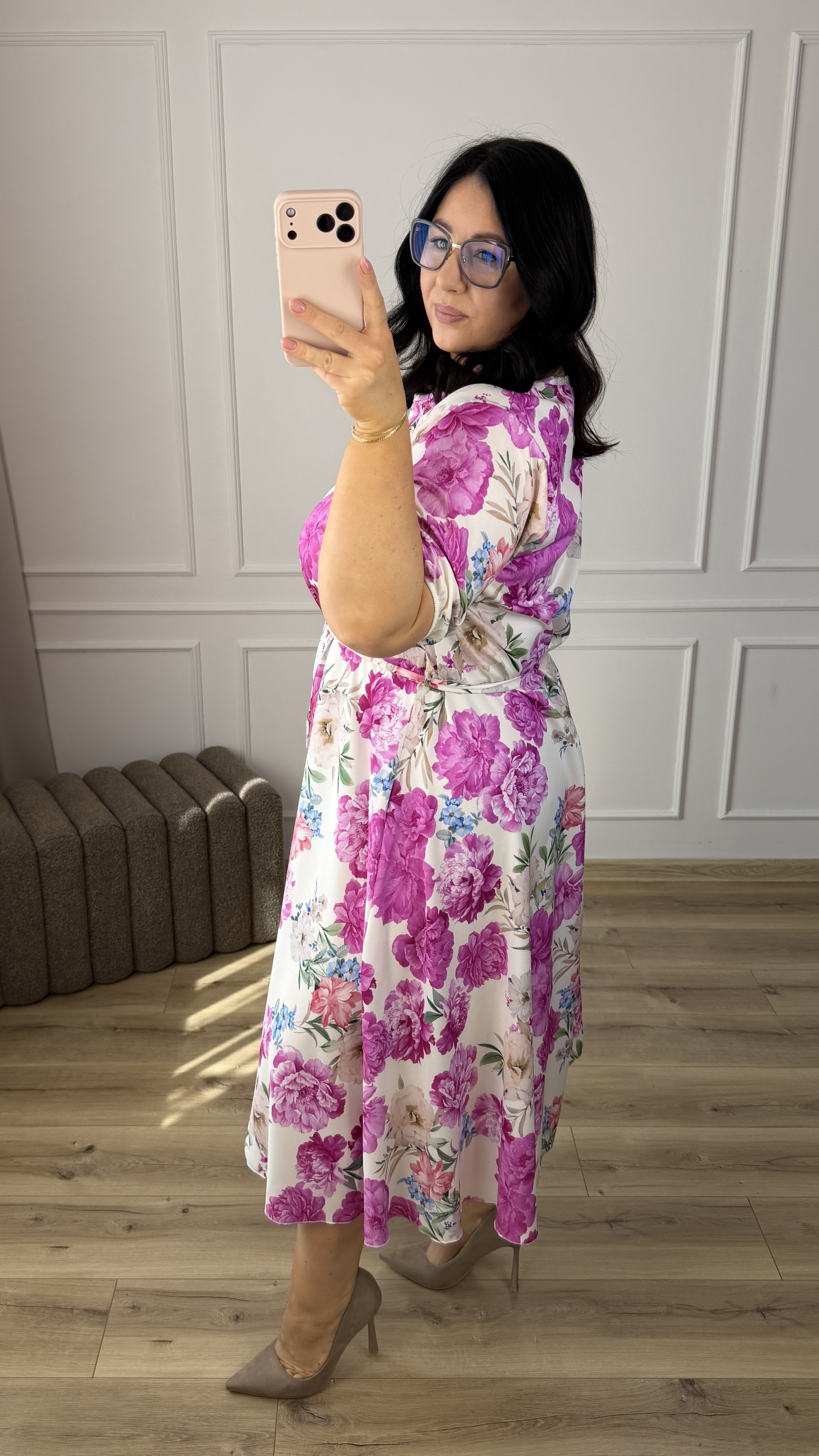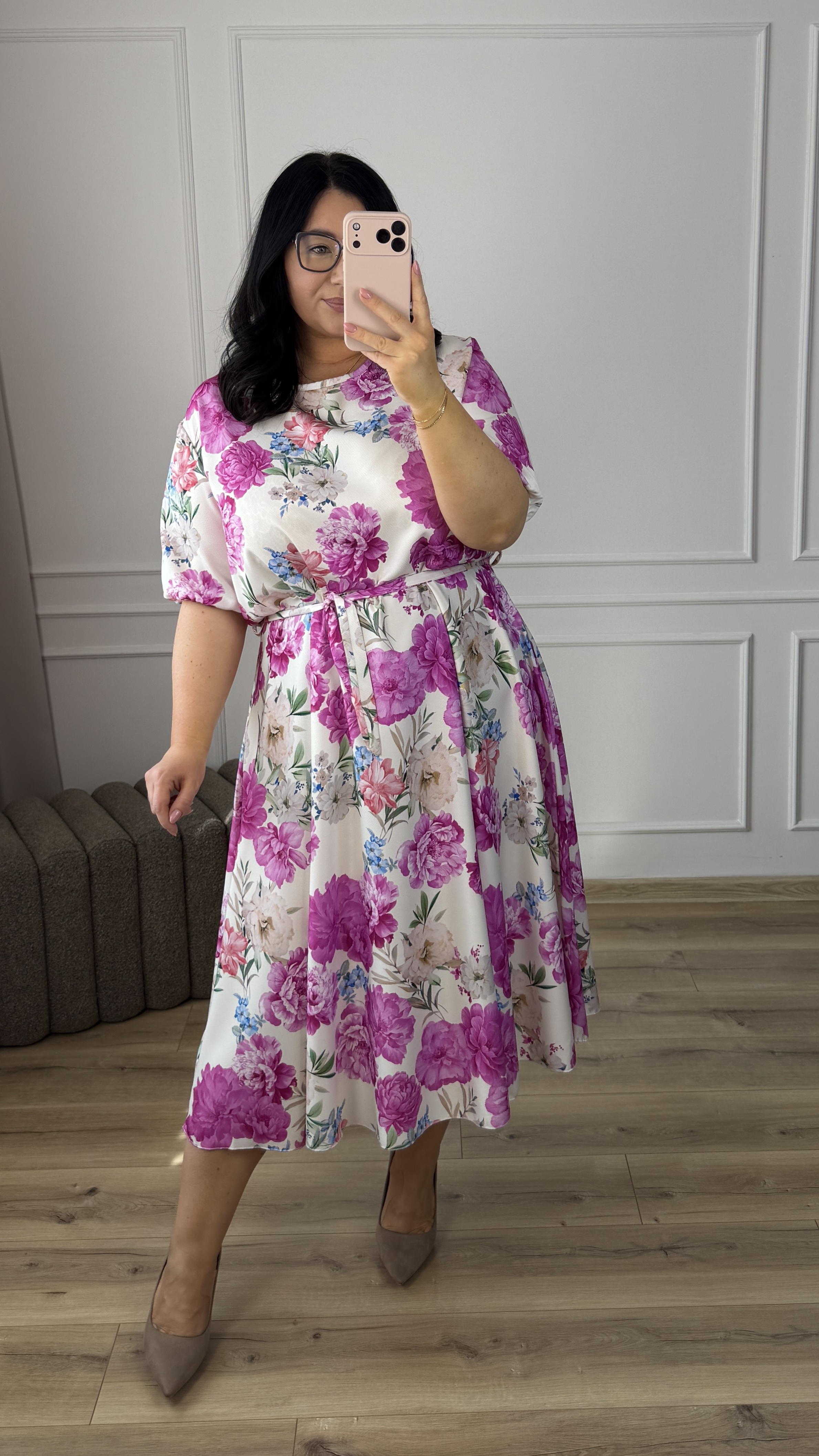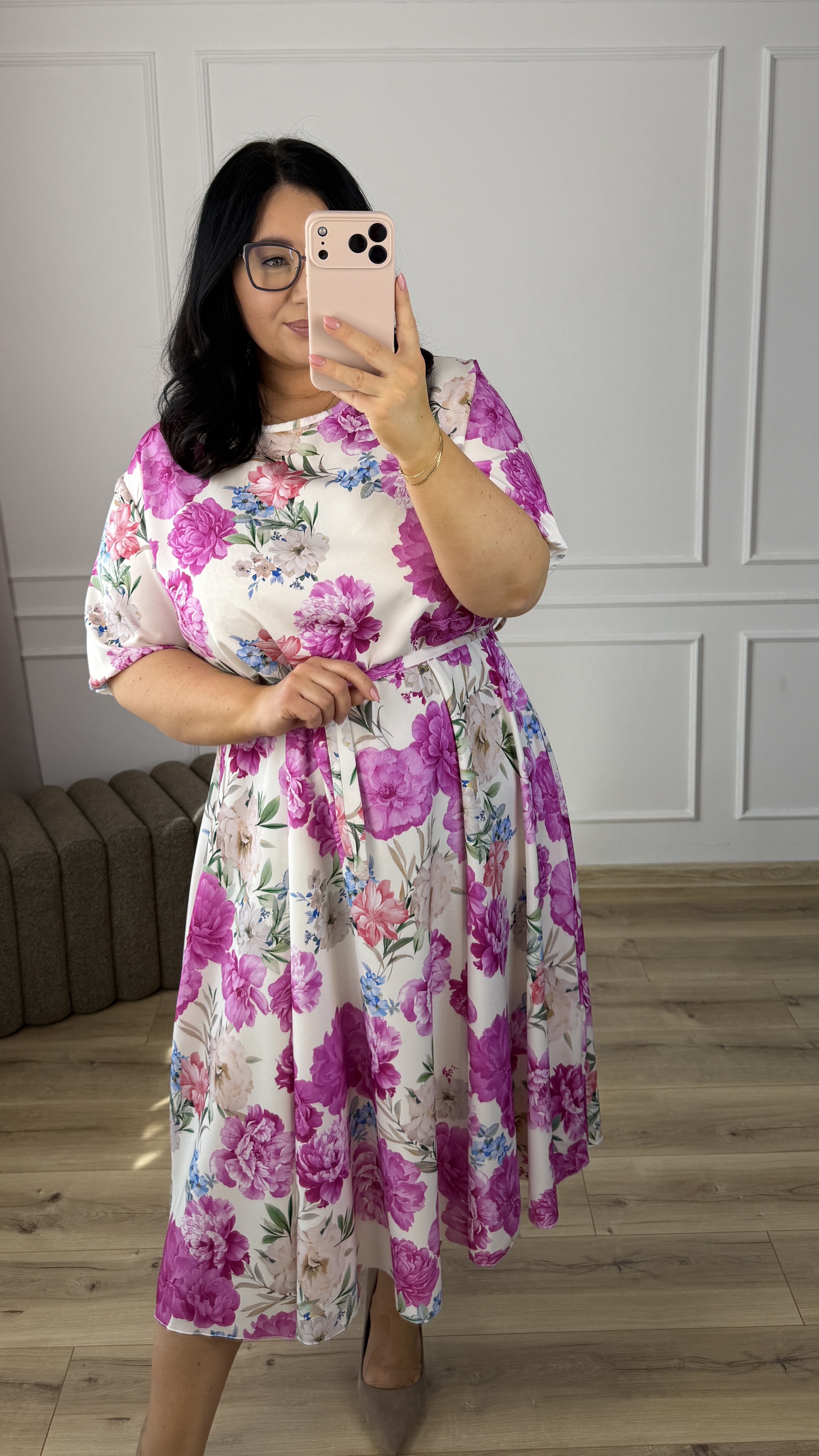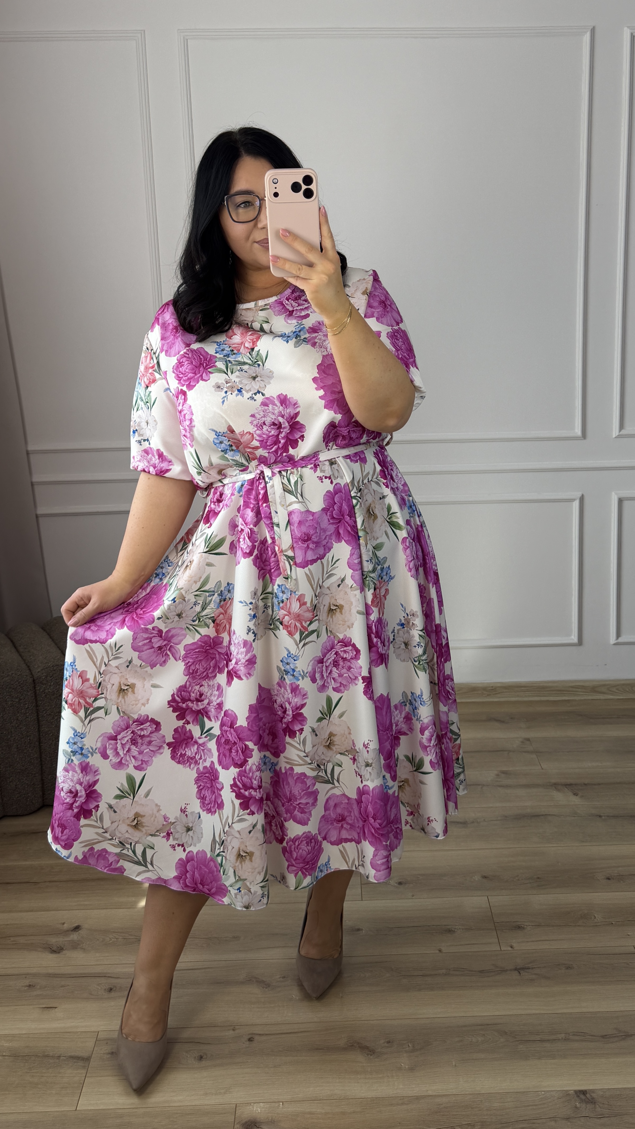 Klasyczna sukienka w kwiatki o długości midi. Spódnica szyta z koła przez co ładnie się układa. Okrągły dekolt oraz wiązany pasek w pasie. Krótki bufkowy rękaw zakończony gumką, przez co można dostosować jego długość wg. preferencji. Sukienka dzięki swojej uniwersalności idealnie sprawdzi się na co dzień jak i również na większe wyjścia.