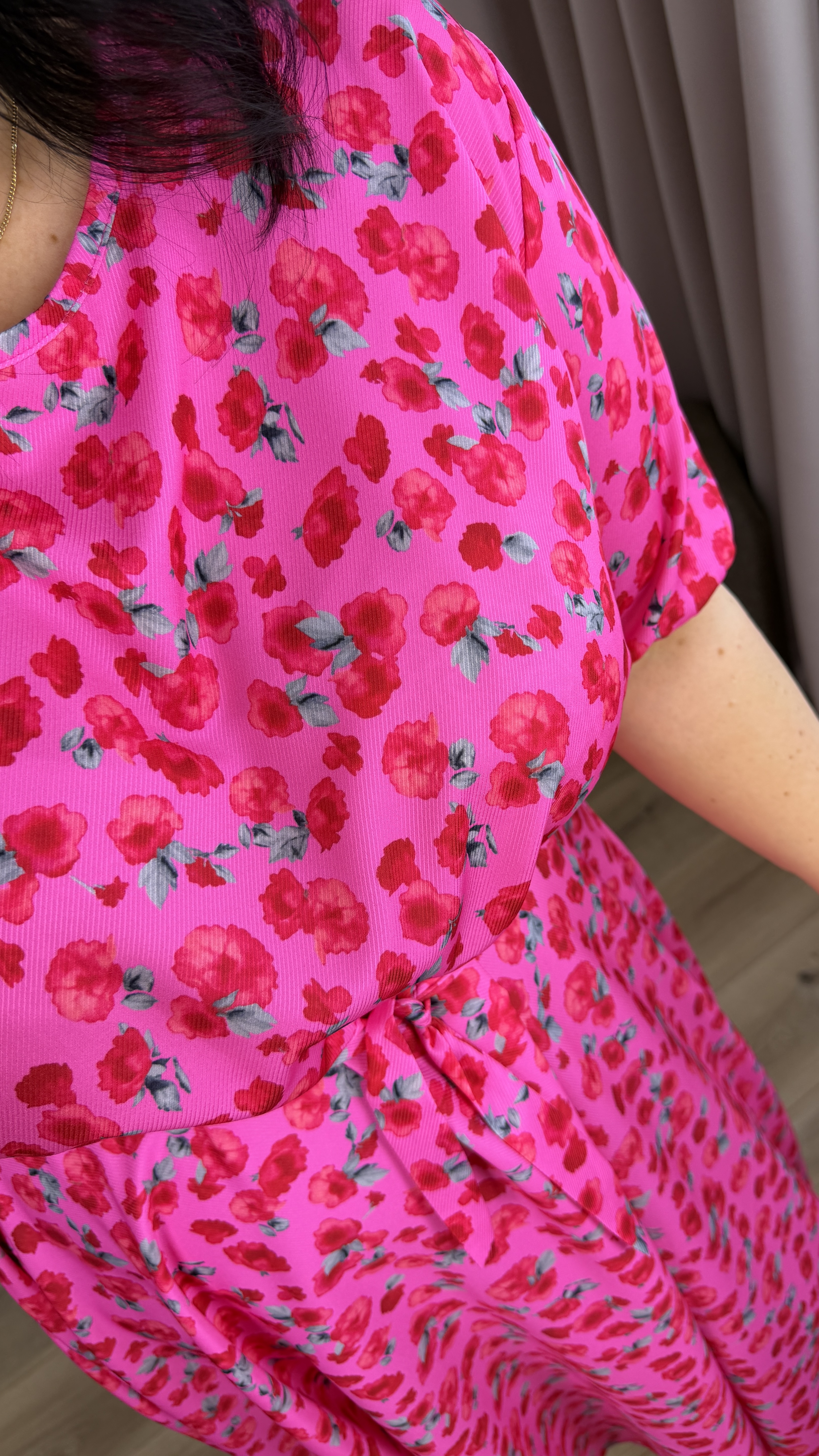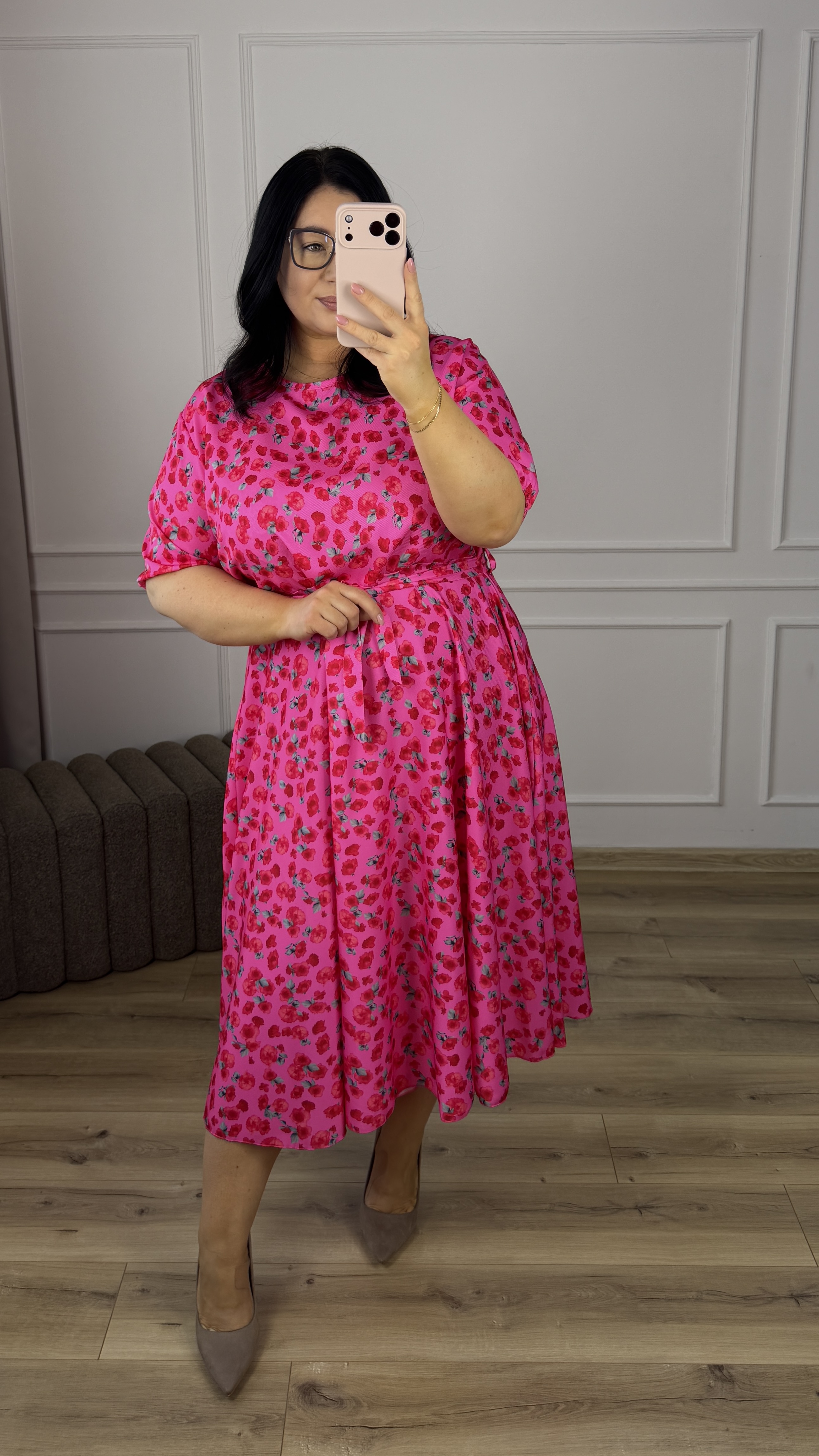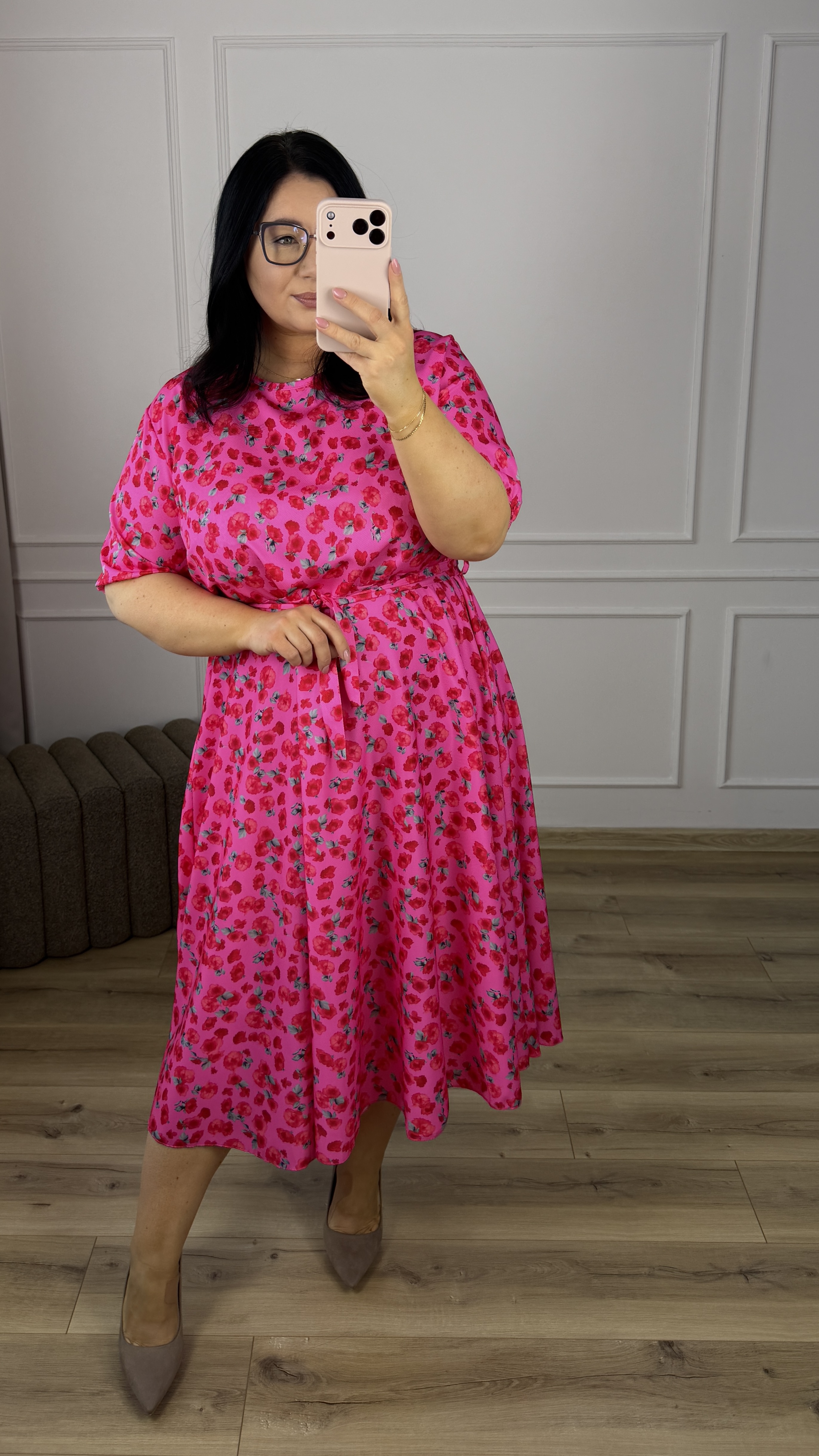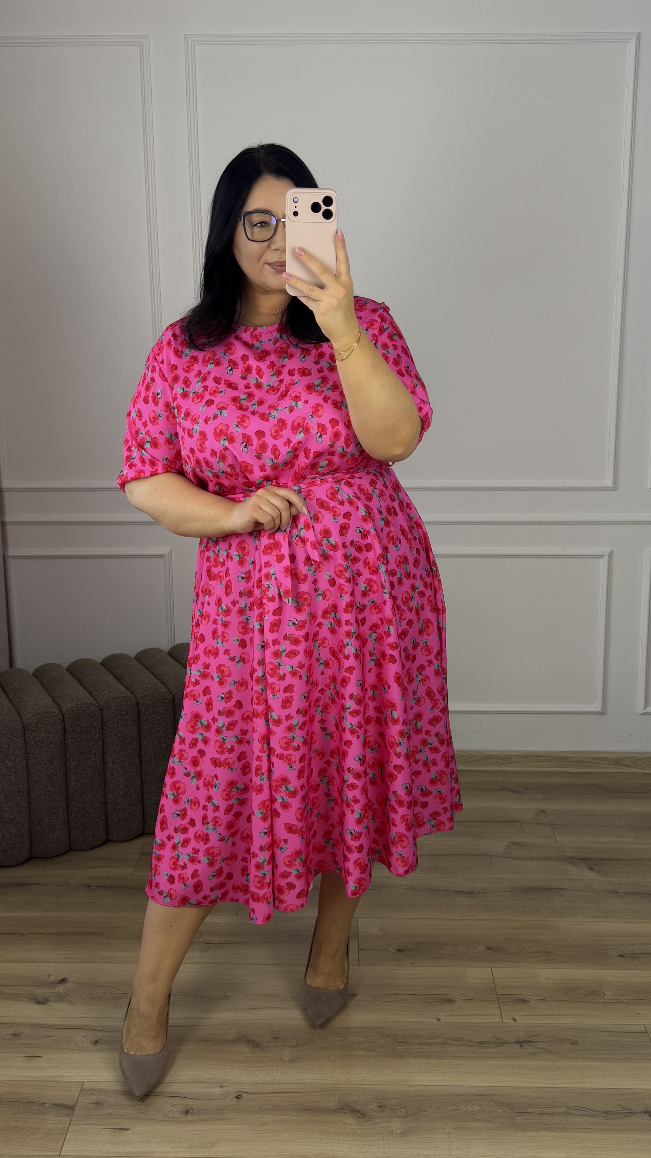 Klasyczna sukienka w kwiatki o długości midi. Spódnica szyta z koła przez co ładnie się układa. Okrągły dekolt oraz wiązany pasek w pasie. Krótki bufkowy rękaw zakończony gumką, przez co można dostosować jego długość wg. preferencji. Sukienka dzięki swojej uniwersalności idealnie sprawdzi się na co dzień jak i również na większe wyjścia.