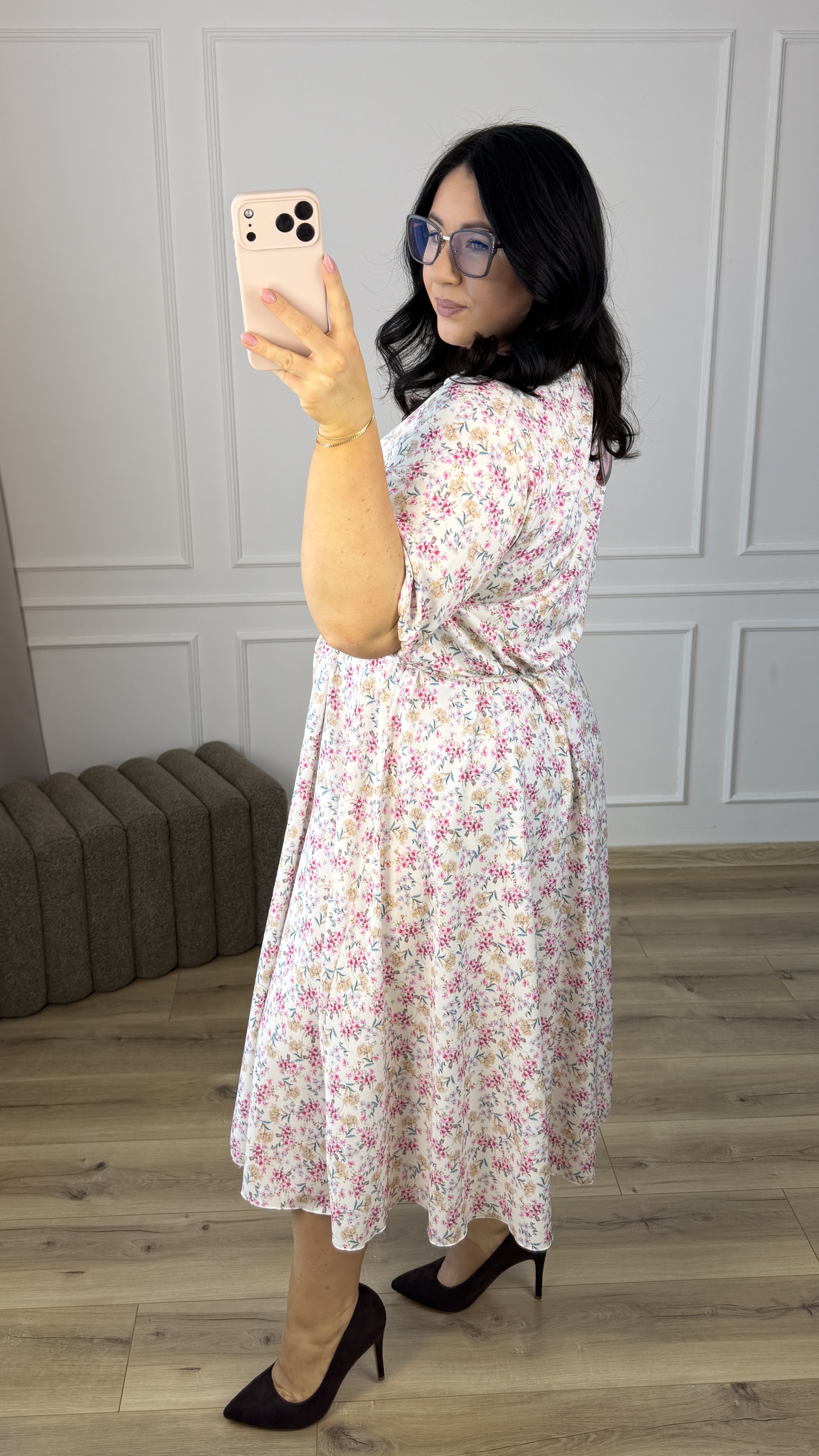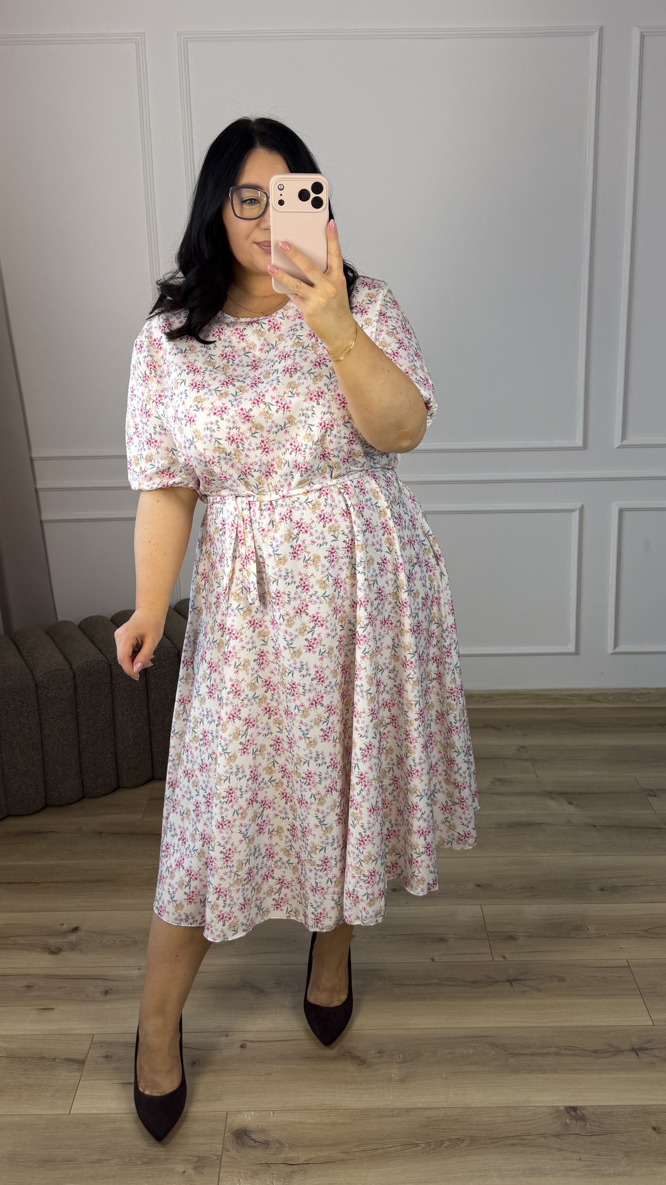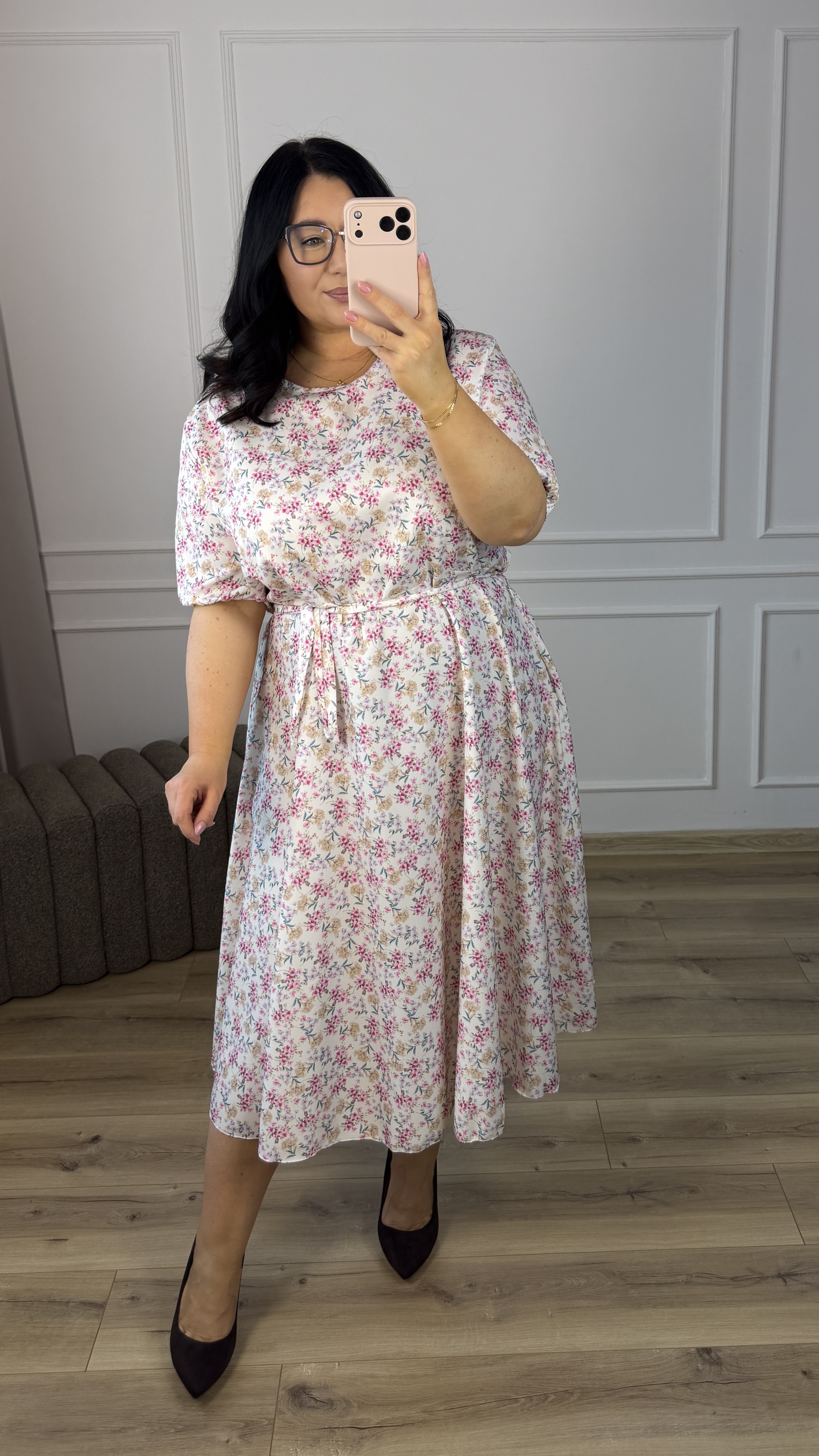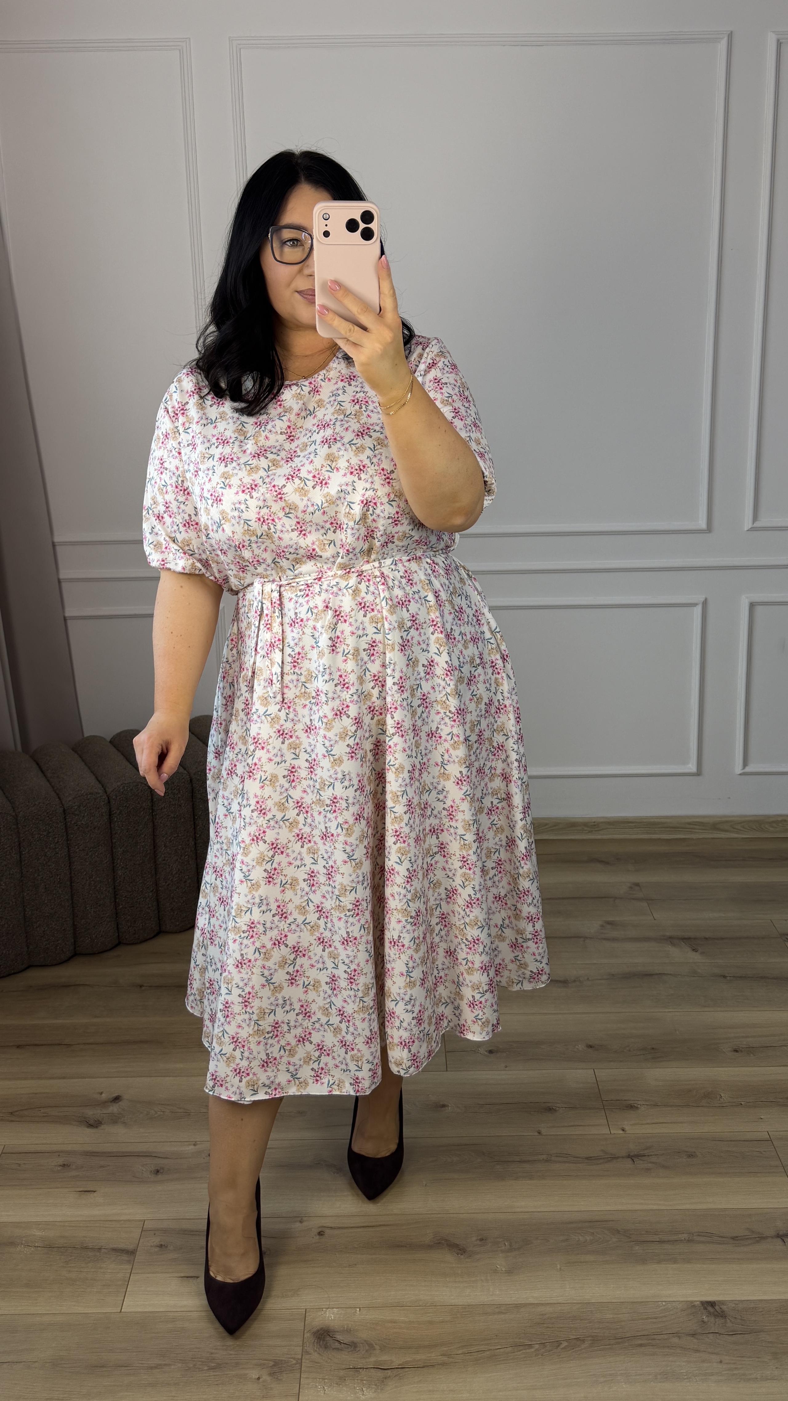 Klasyczna sukienka w kwiatki o długości midi. Spódnica szyta z koła przez co ładnie się układa. Okrągły dekolt oraz wiązany pasek w pasie. Krótki bufkowy rękaw zakończony gumką, przez co można dostosować jego długość wg. preferencji. Sukienka dzięki swojej uniwersalności idealnie sprawdzi się na co dzień jak i również na większe wyjścia.