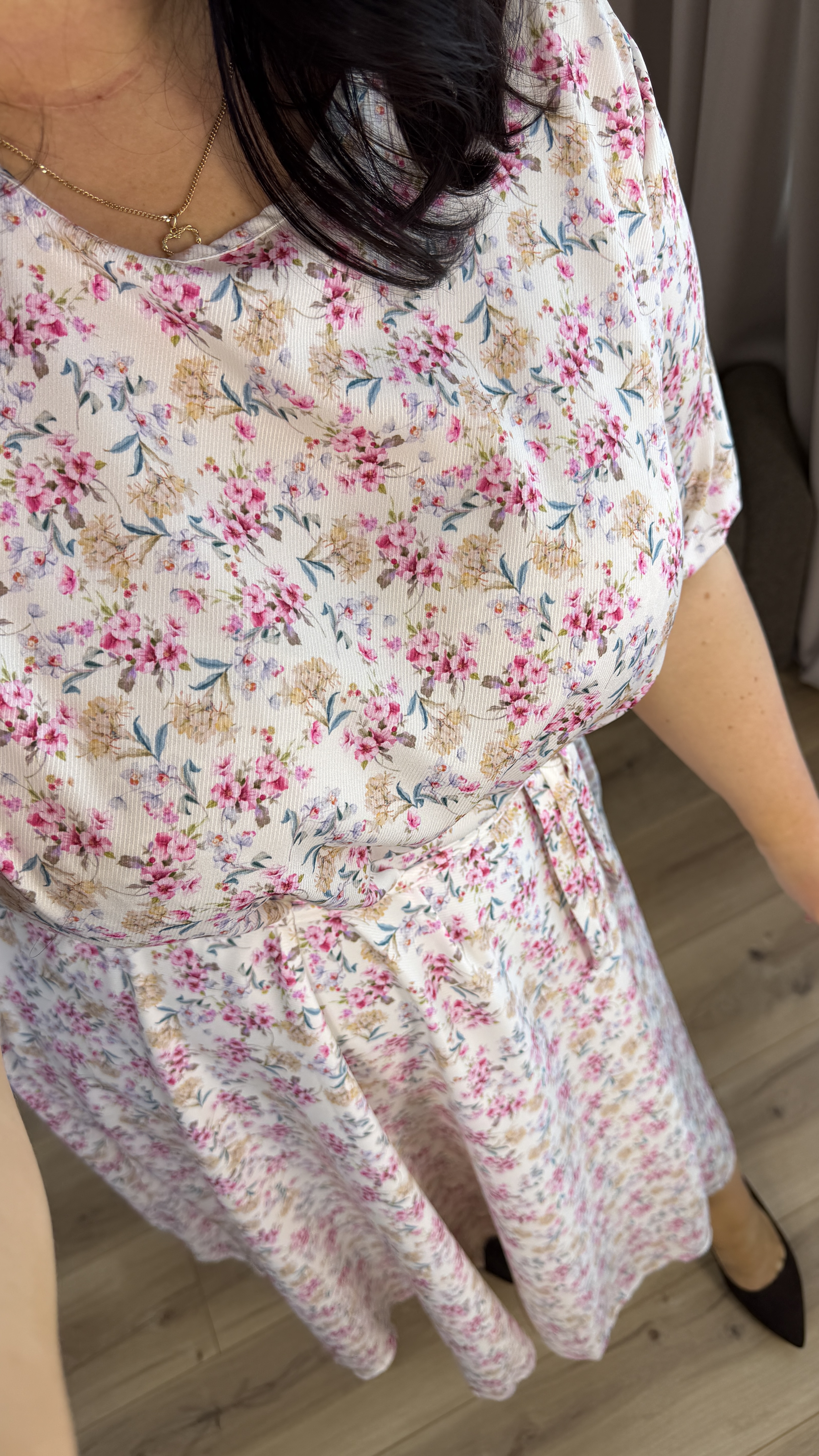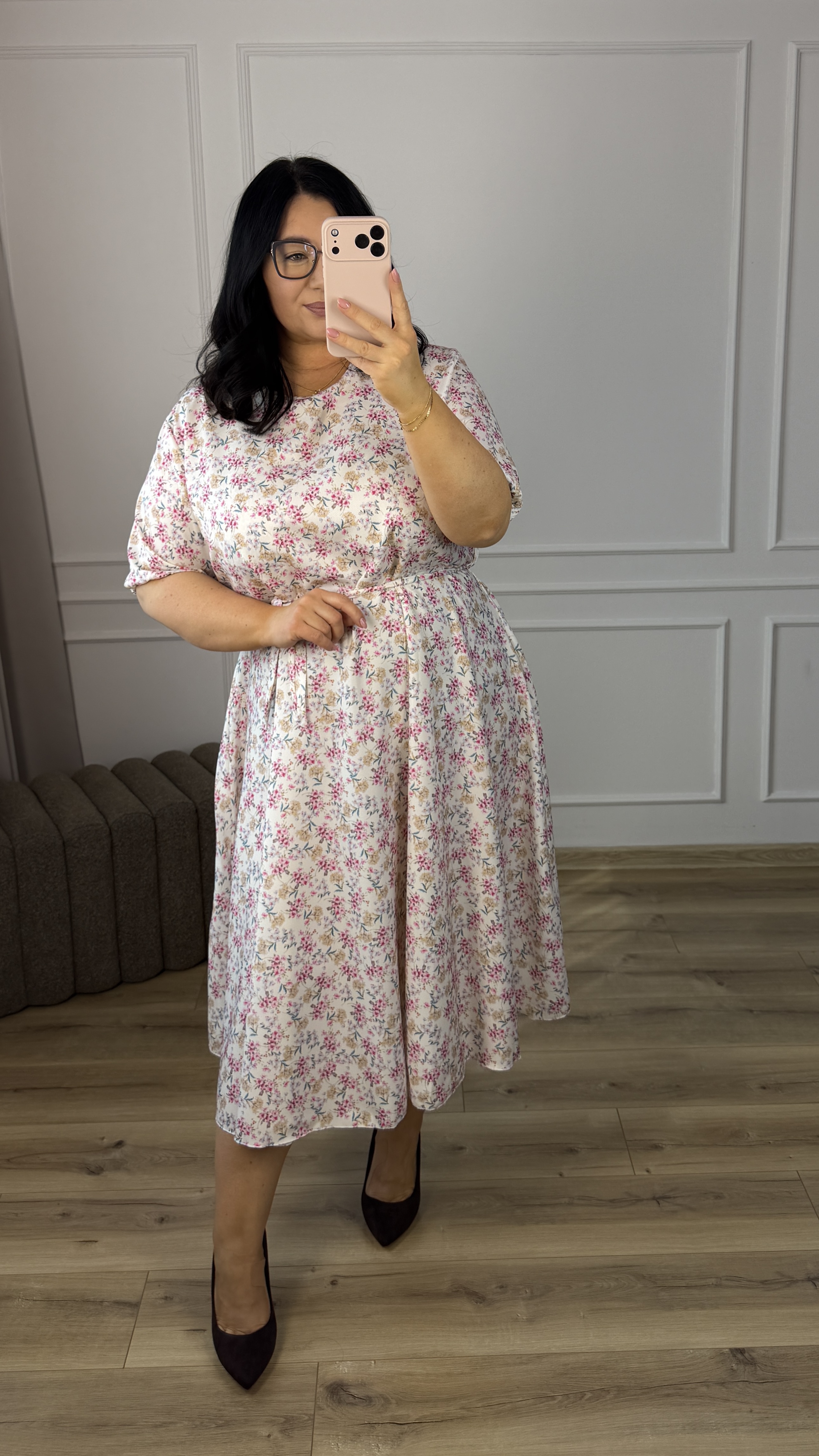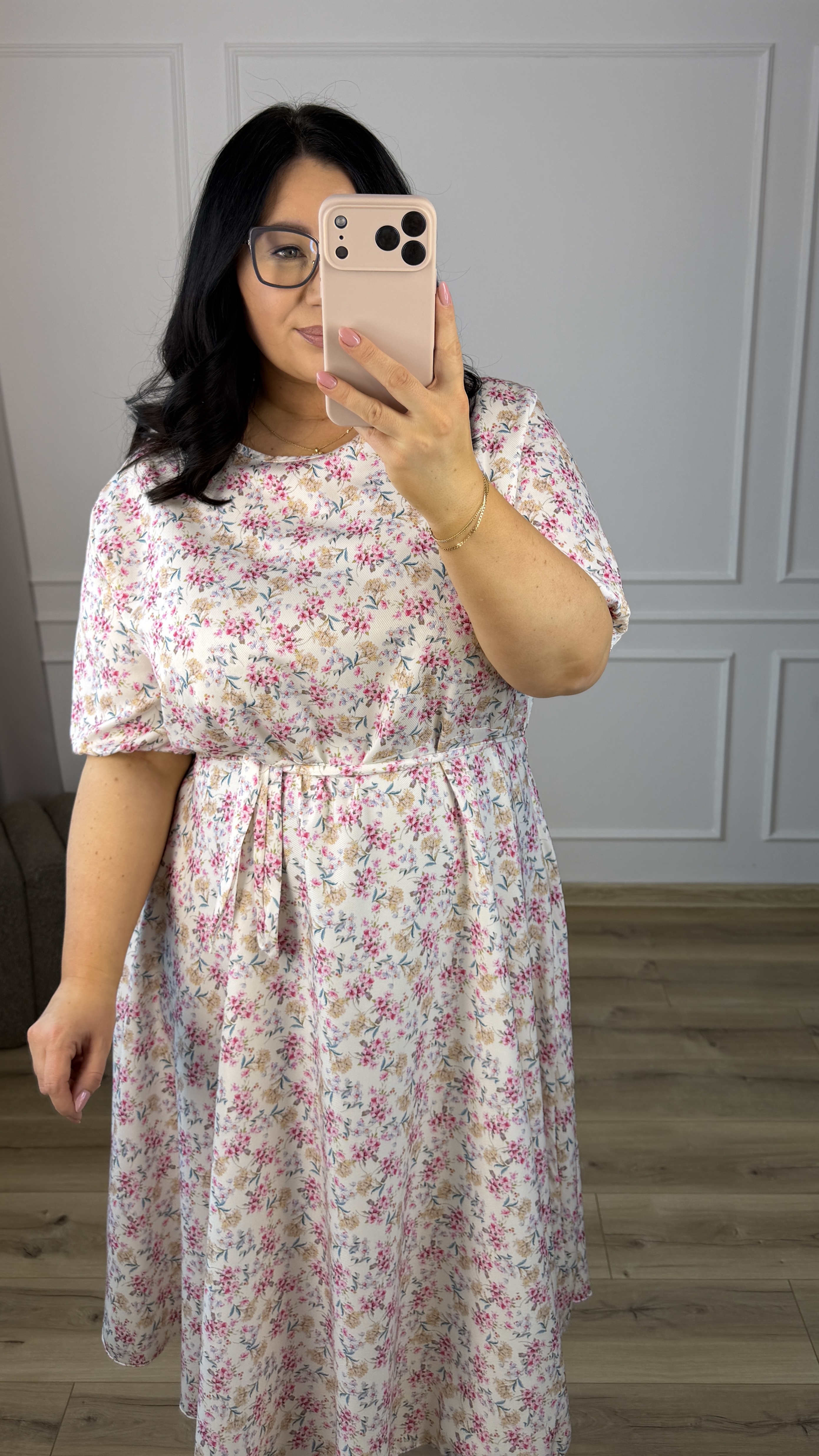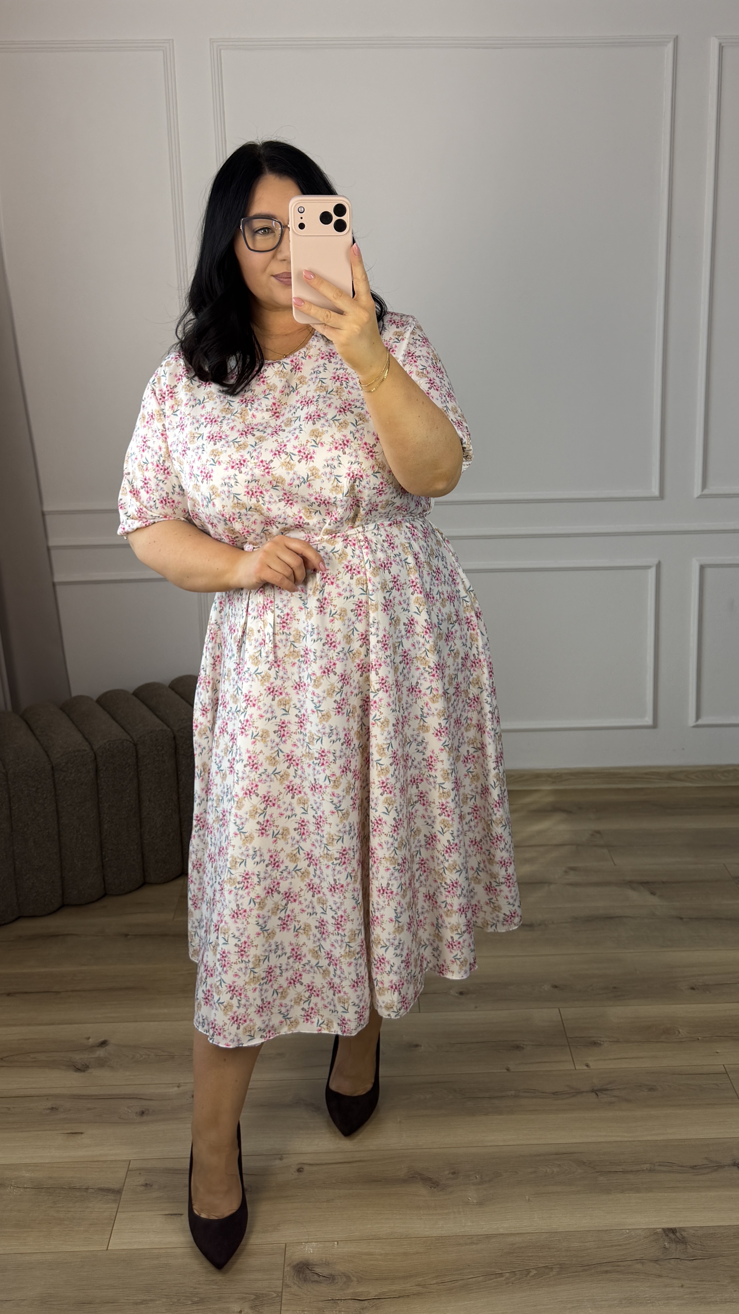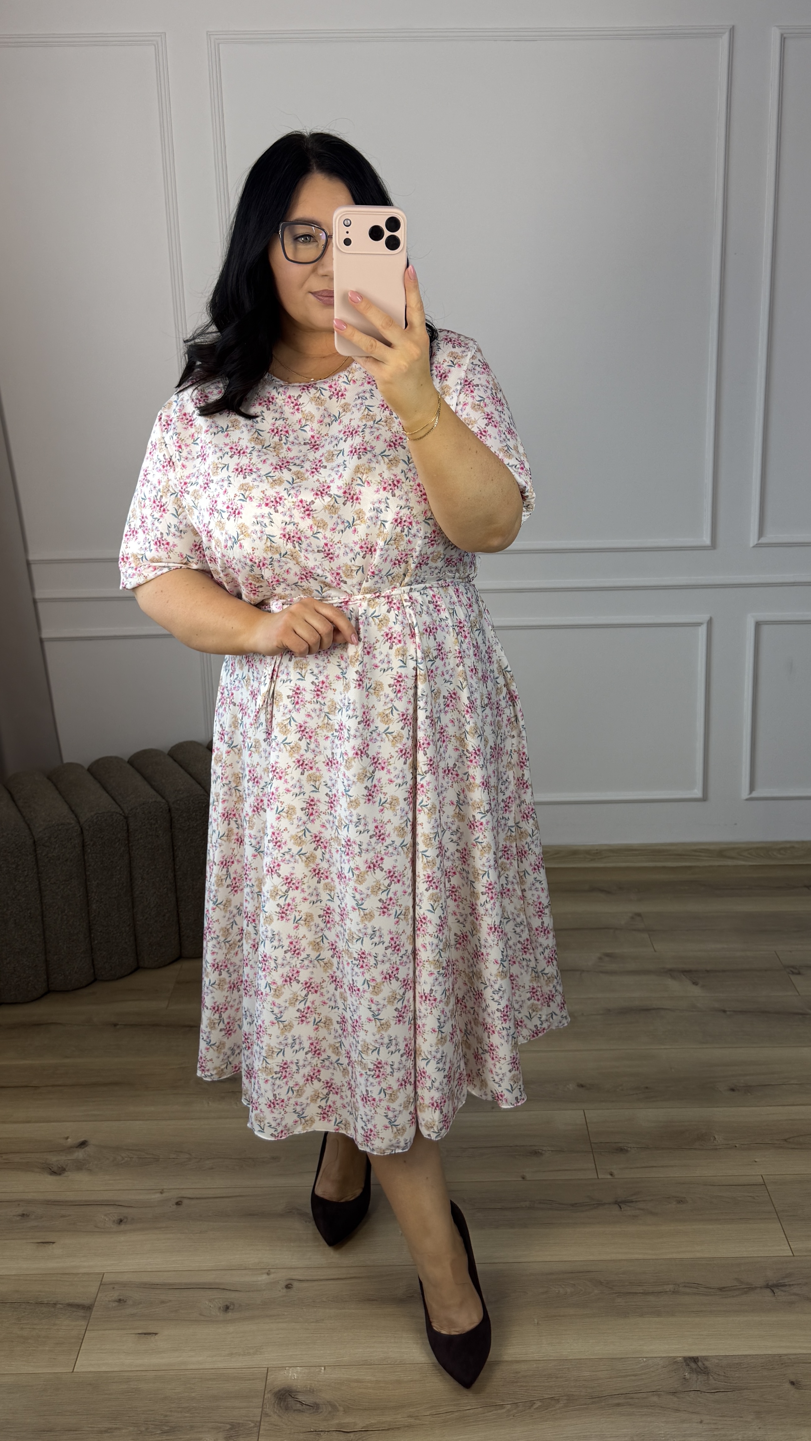 Klasyczna sukienka w kwiatki o długości midi. Spódnica szyta z koła przez co ładnie się układa. Okrągły dekolt oraz wiązany pasek w pasie. Krótki bufkowy rękaw zakończony gumką, przez co można dostosować jego długość wg. preferencji. Sukienka dzięki swojej uniwersalności idealnie sprawdzi się na co dzień jak i również na większe wyjścia.