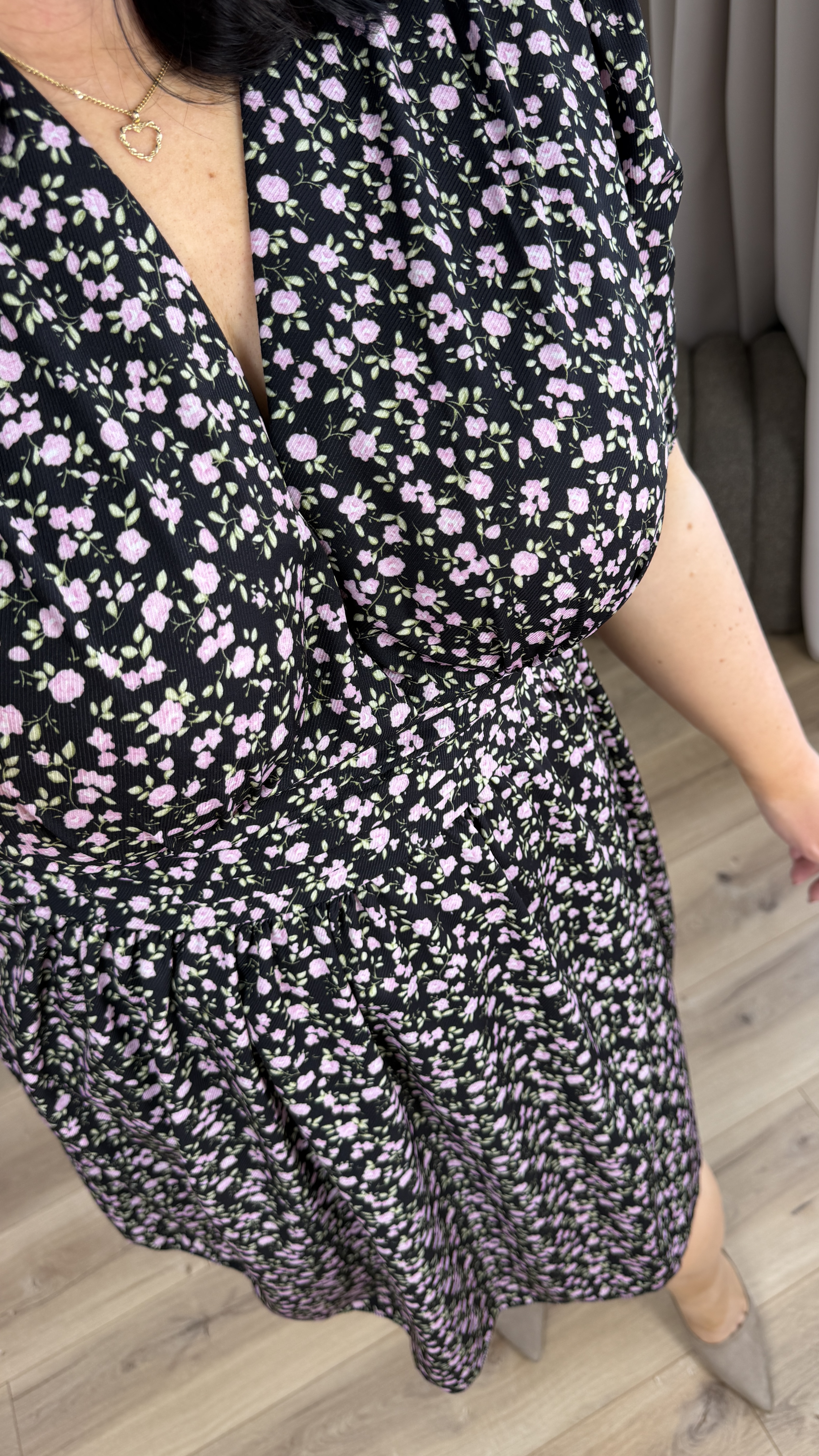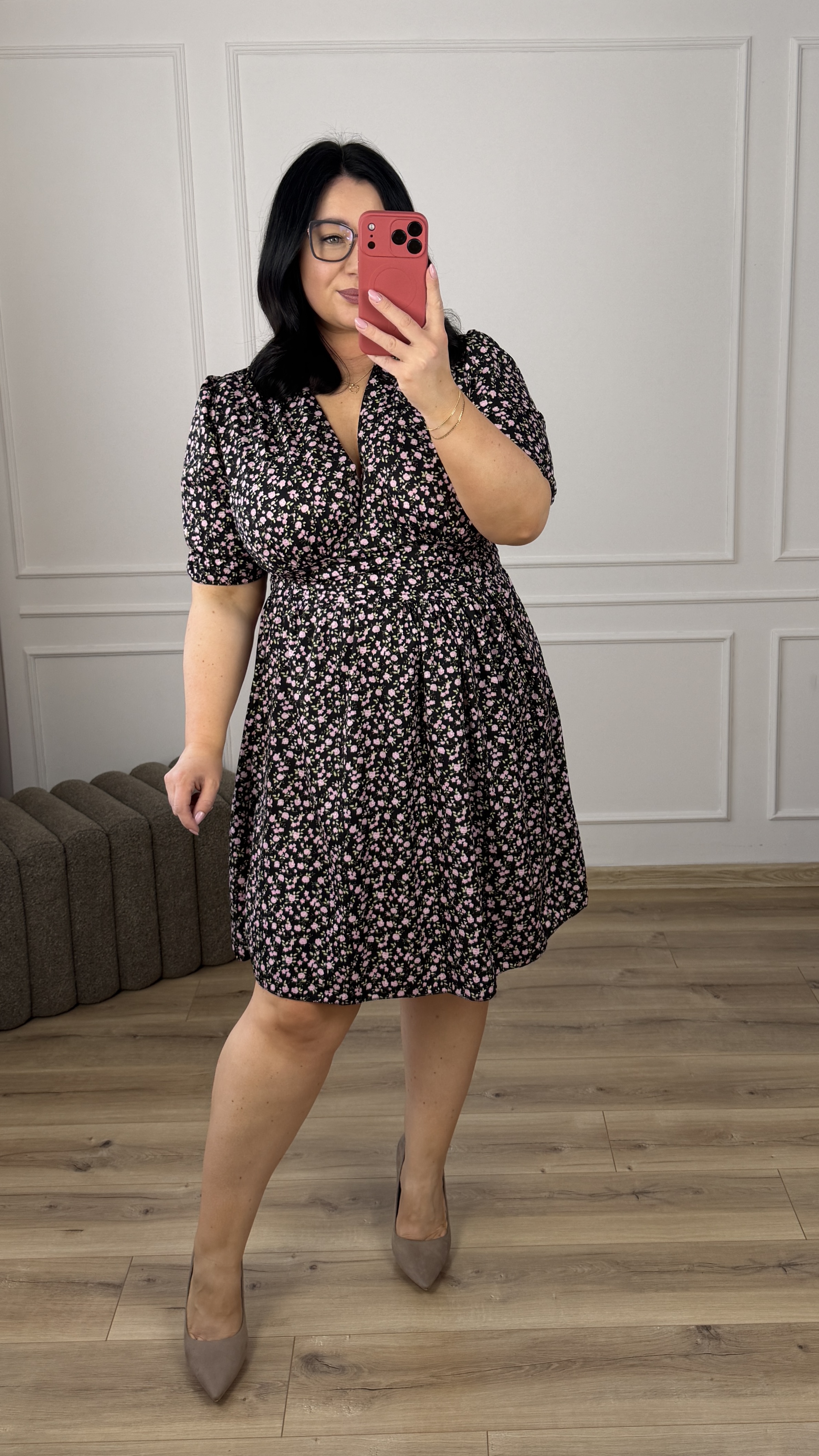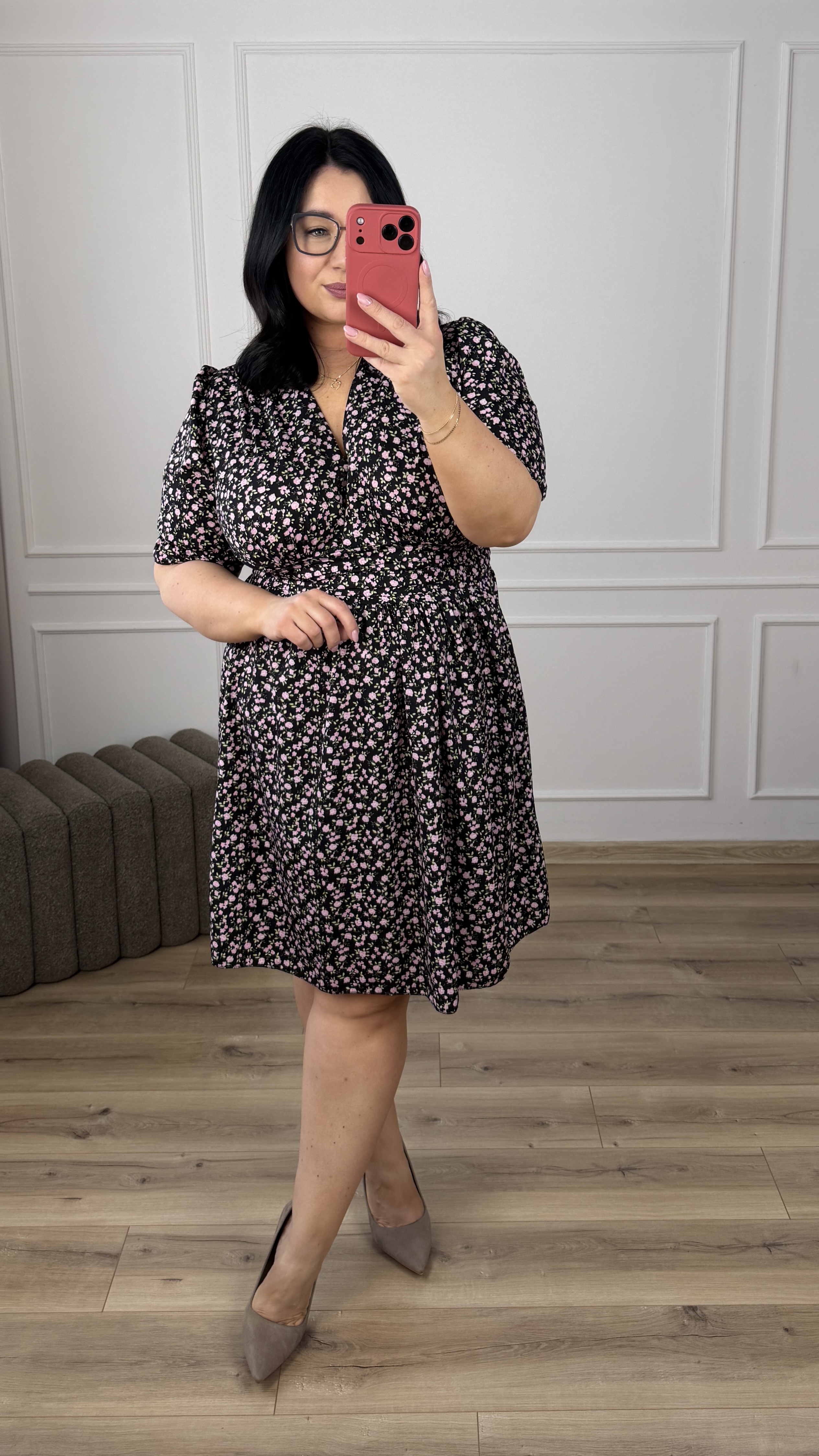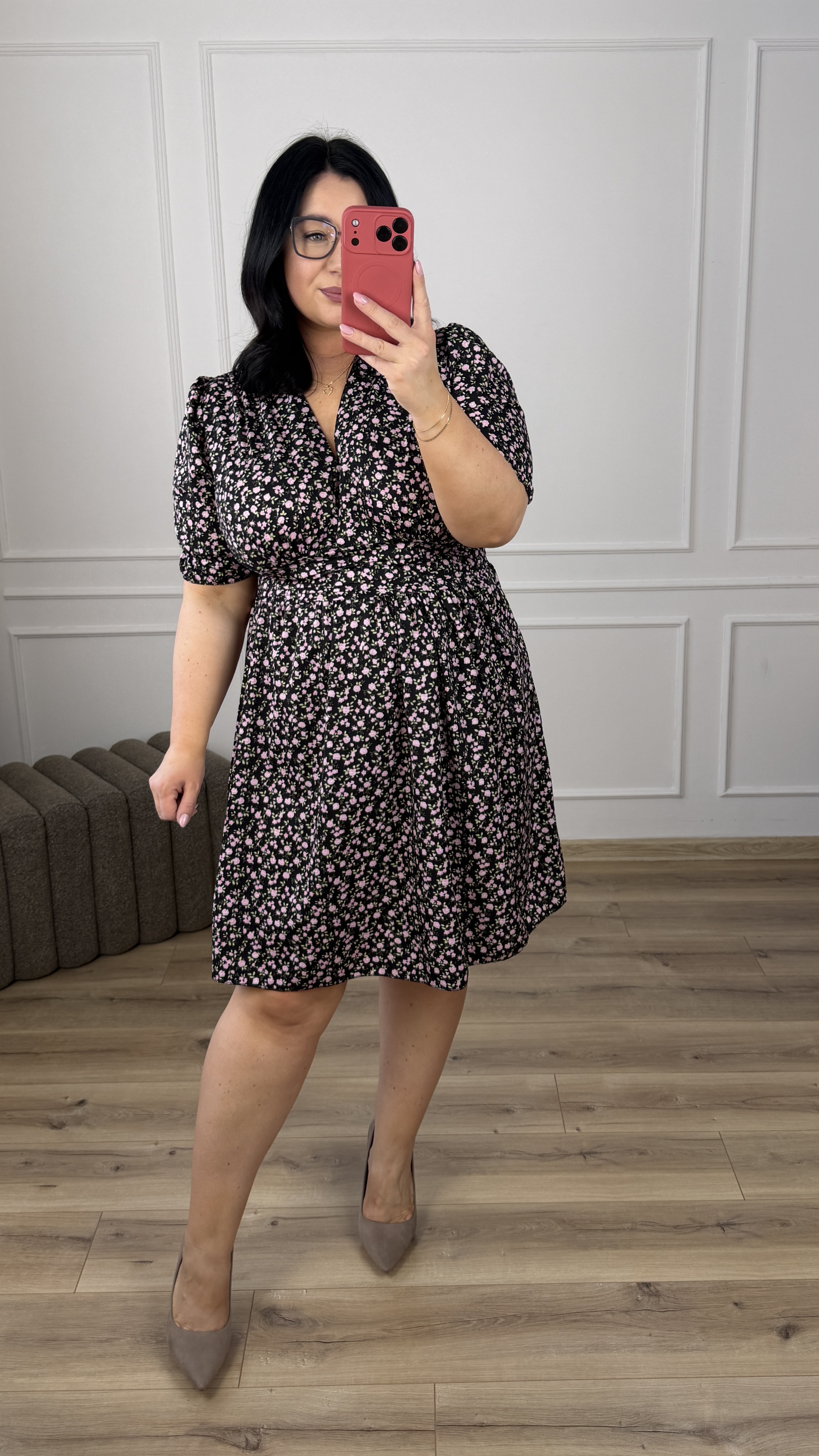 Sukienka długości mini o prostym kroju. Posiada zakładany dekolt oraz drapowanie materiału w pasie przez co ładnie ją podkreśla. Sukienka dopasowuje się w pasie dzięki gumce z tyłu. Model o luźniejszym kształcie przez co doskonale sprawdzi się również na ciążowe brzuszki, zapewniając wygodę i styl. To uniwersalna sukienka idealna zarówno na co dzień, jak i na bardziej eleganckie okazje.