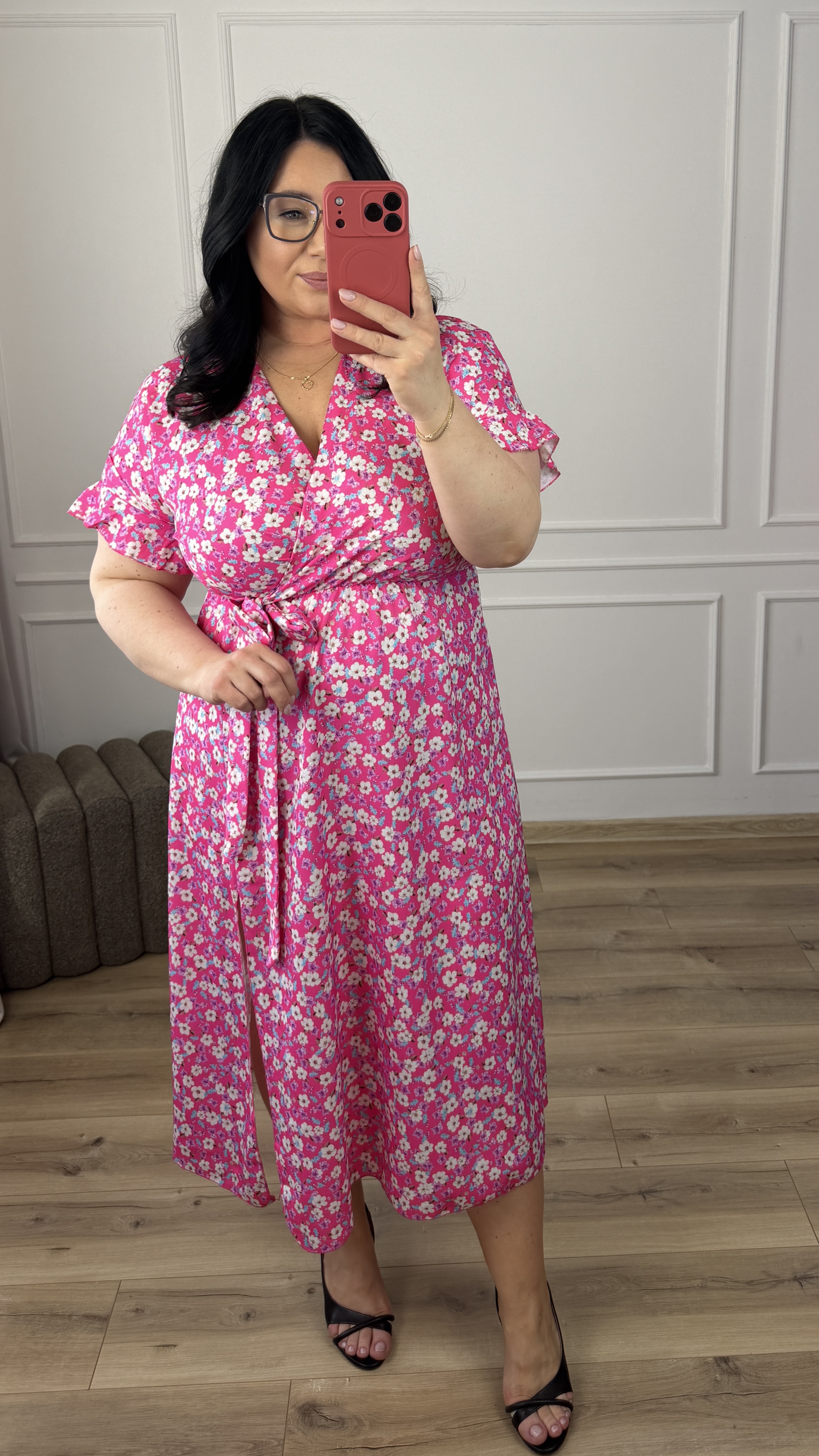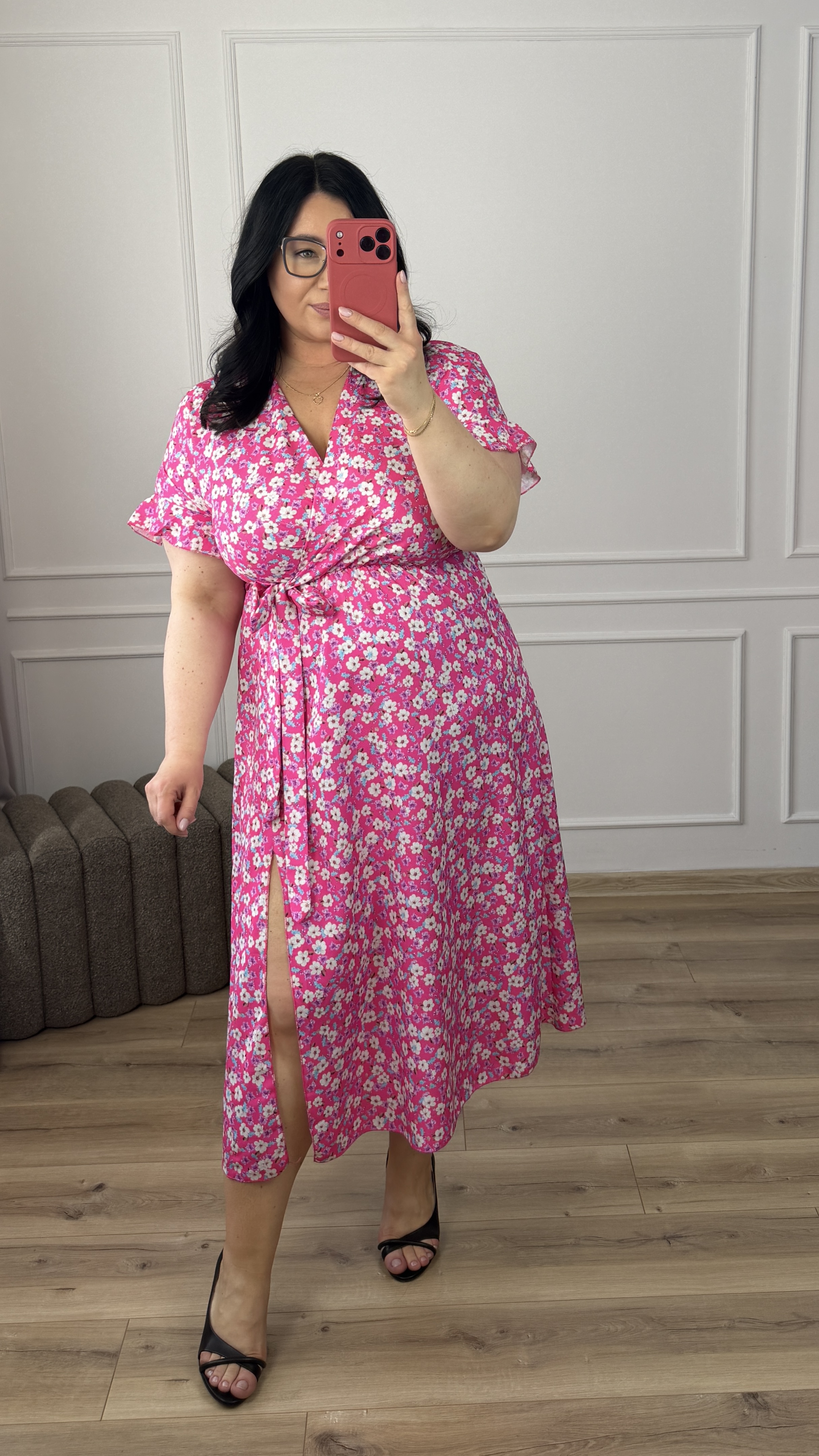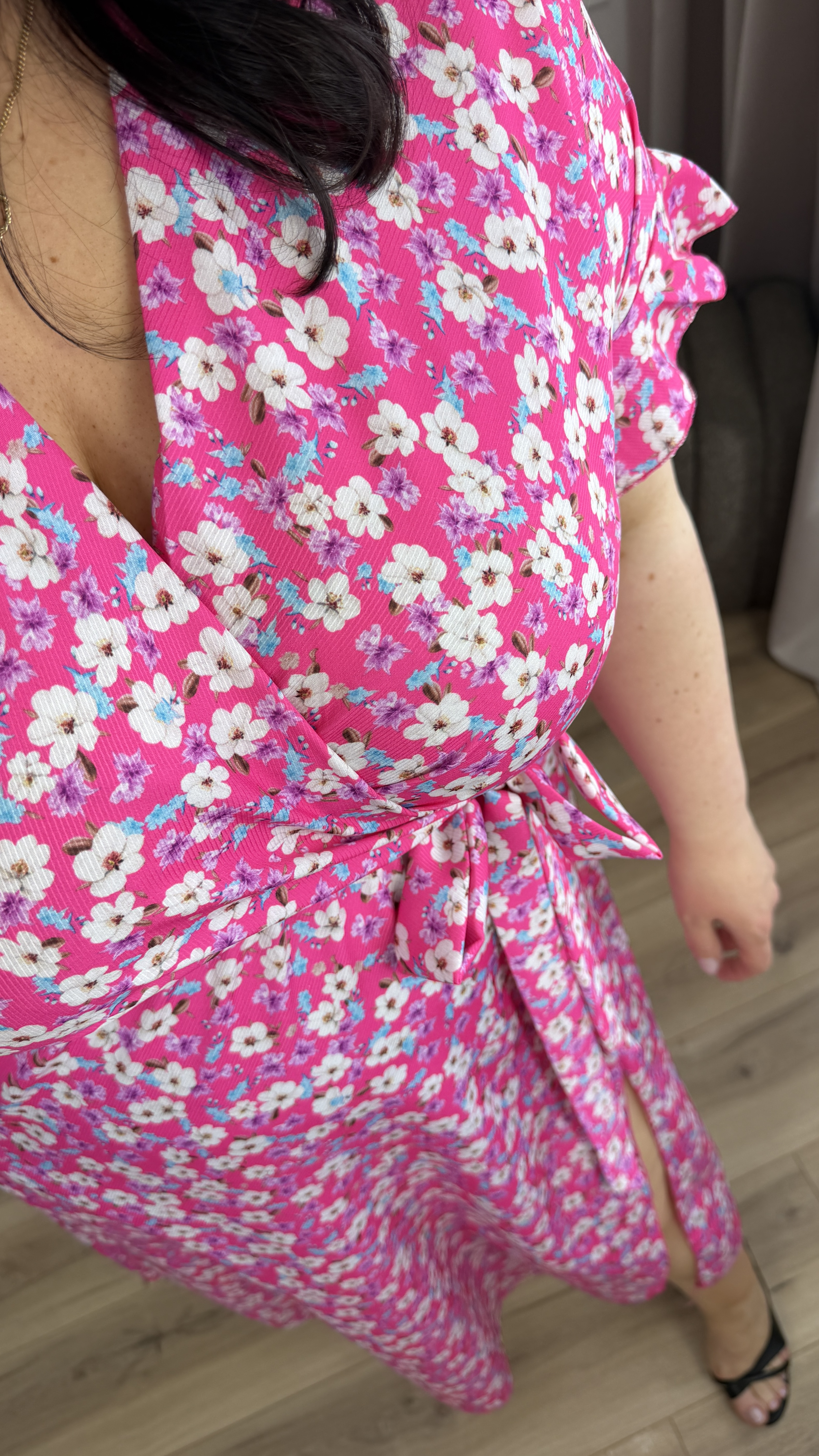 Prosta klasyczna sukienka w kwiatowy wzór. Spódnica długości midi z rozcięciem z przodu. Sukienka posiada zakładany dekolt oraz wiązany pas z boku. Sukienka świetnie sprawdzi się na cieplejsze dni ponieważ posiada klasyczny krótki rękaw zakończony falbanką. Świetnie sprawdzi się na co dzień jak i również na większe wyjścia.