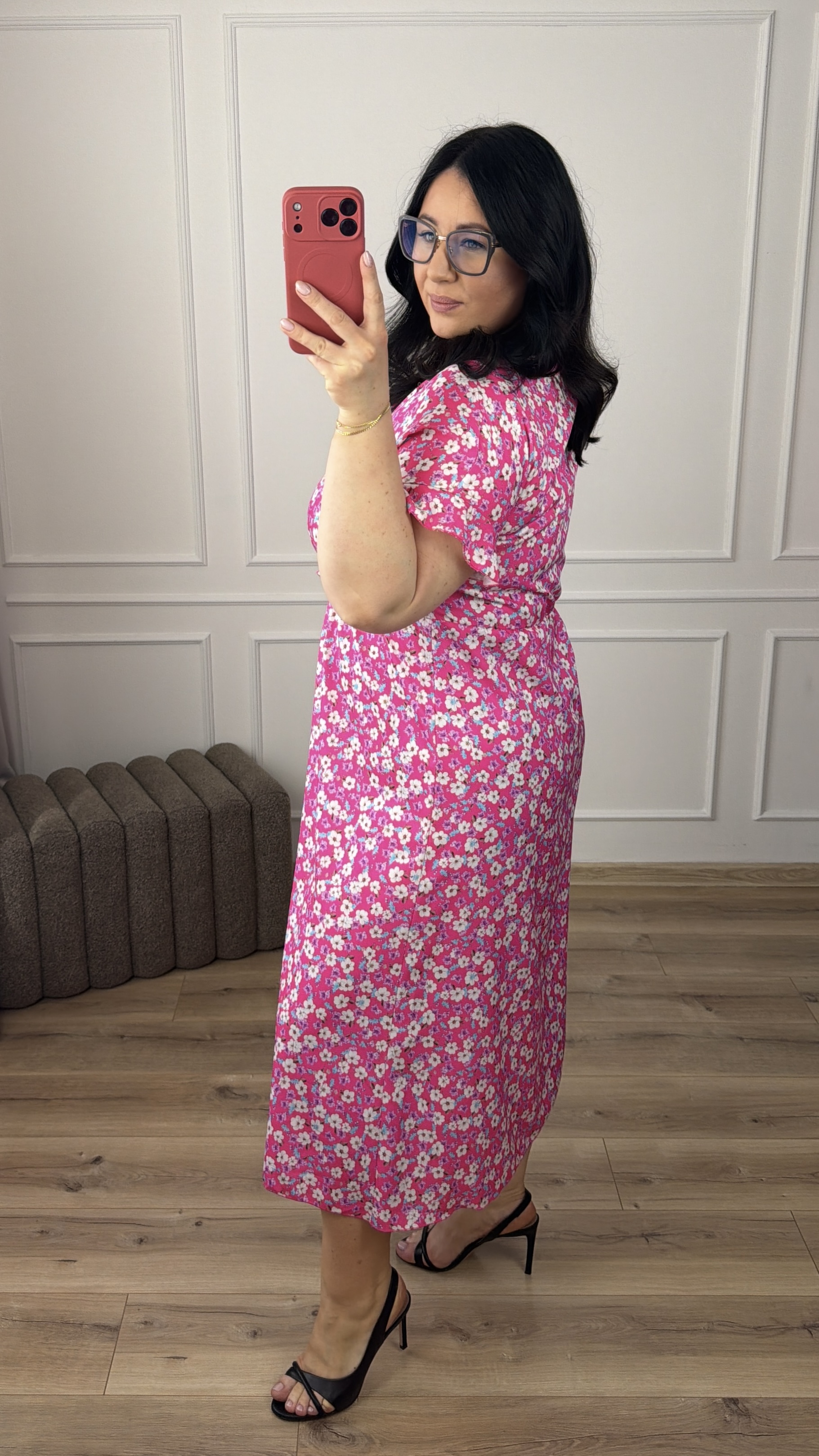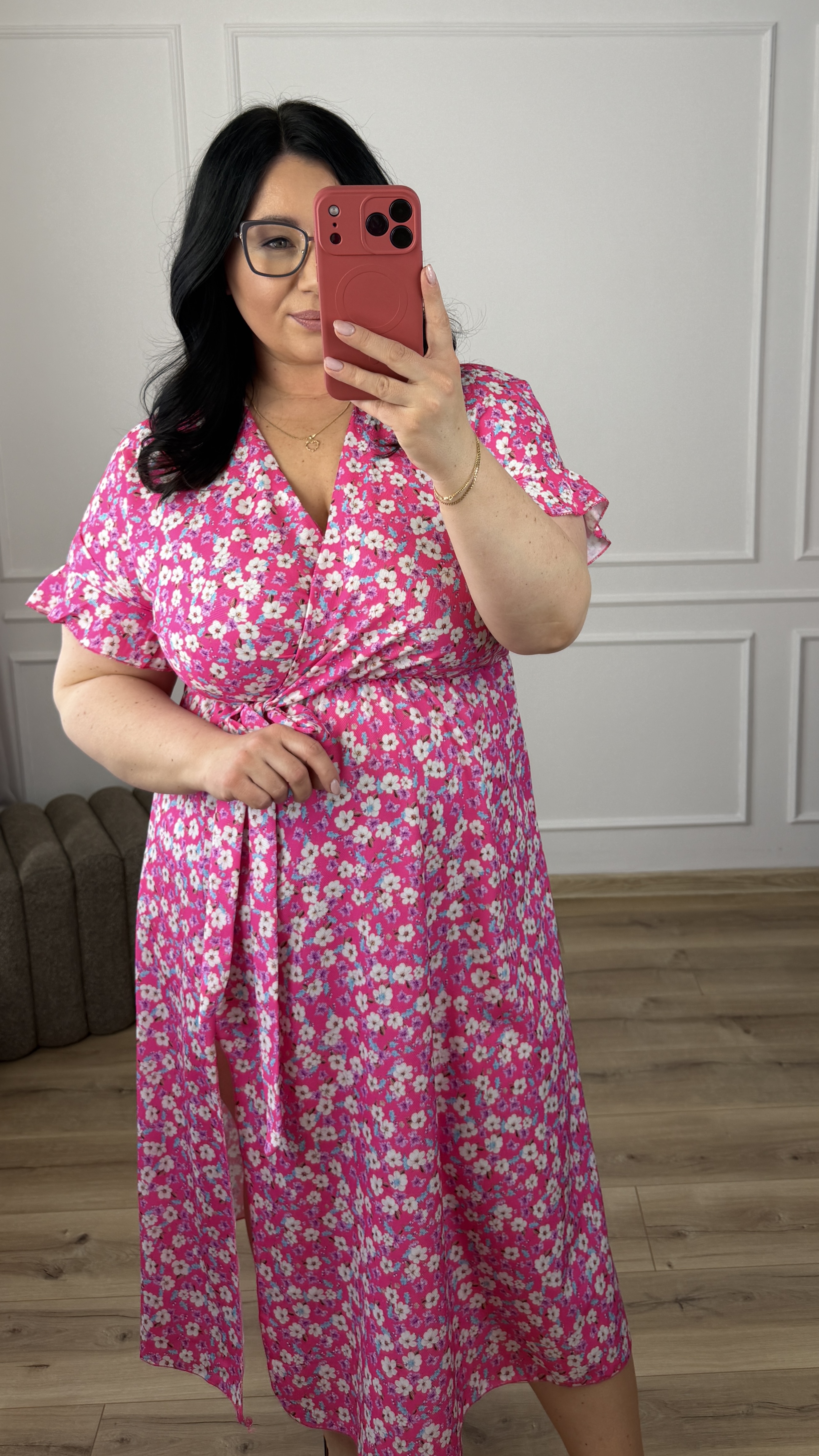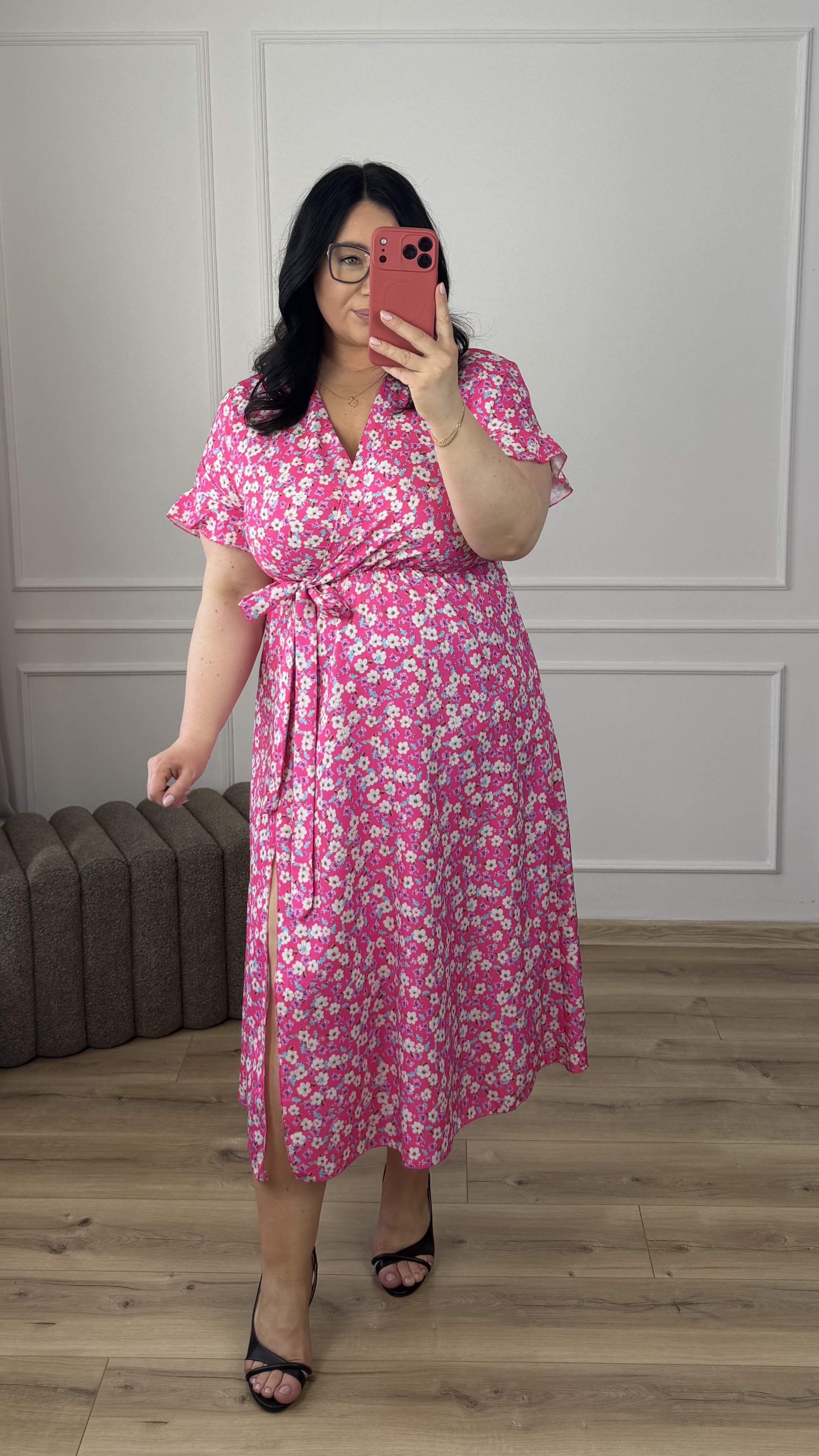 Prosta klasyczna sukienka w kwiatowy wzór. Spódnica długości midi z rozcięciem z przodu. Sukienka posiada zakładany dekolt oraz wiązany pas z boku. Sukienka świetnie sprawdzi się na cieplejsze dni ponieważ posiada klasyczny krótki rękaw zakończony falbanką. Świetnie sprawdzi się na co dzień jak i również na większe wyjścia.