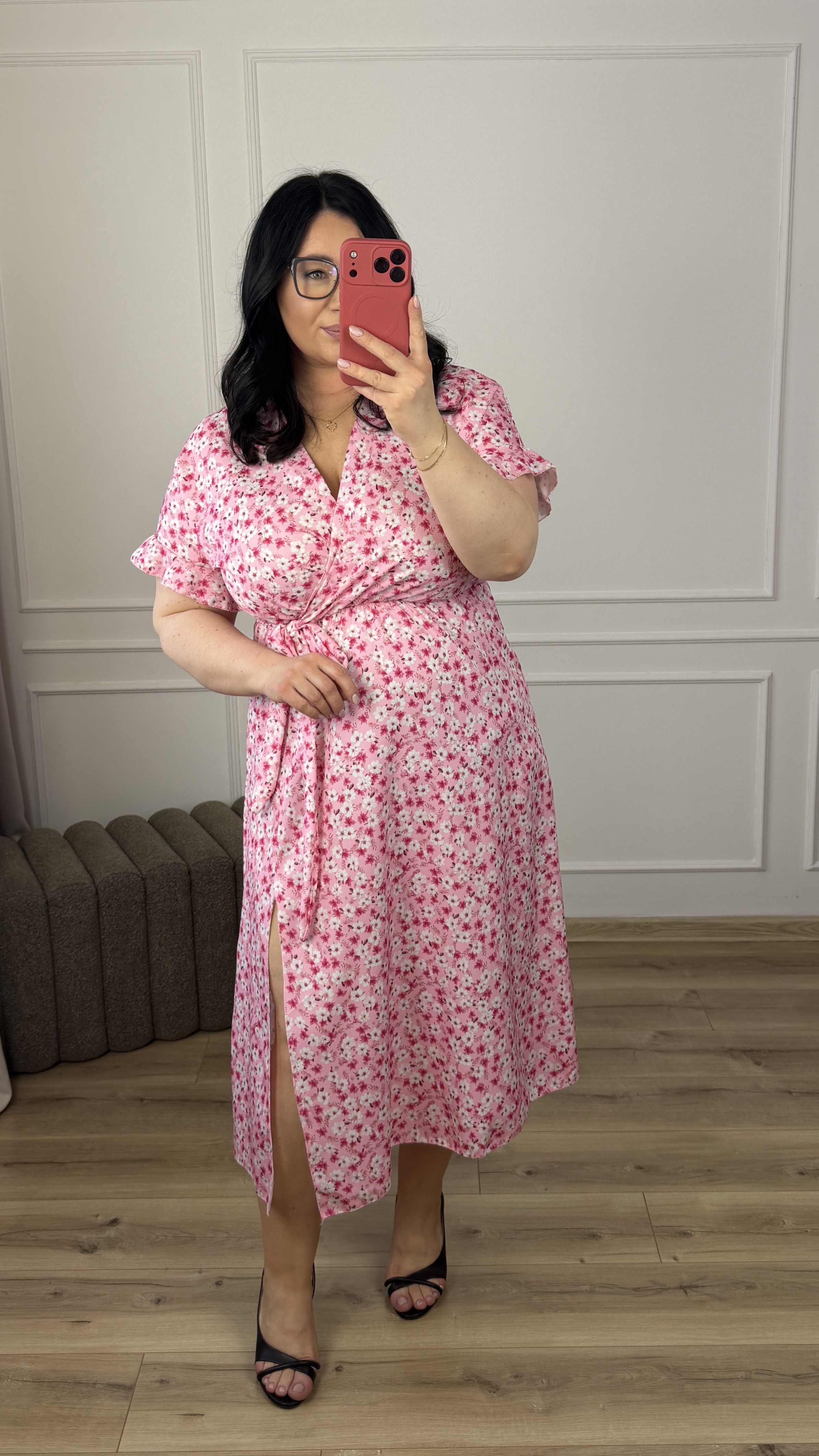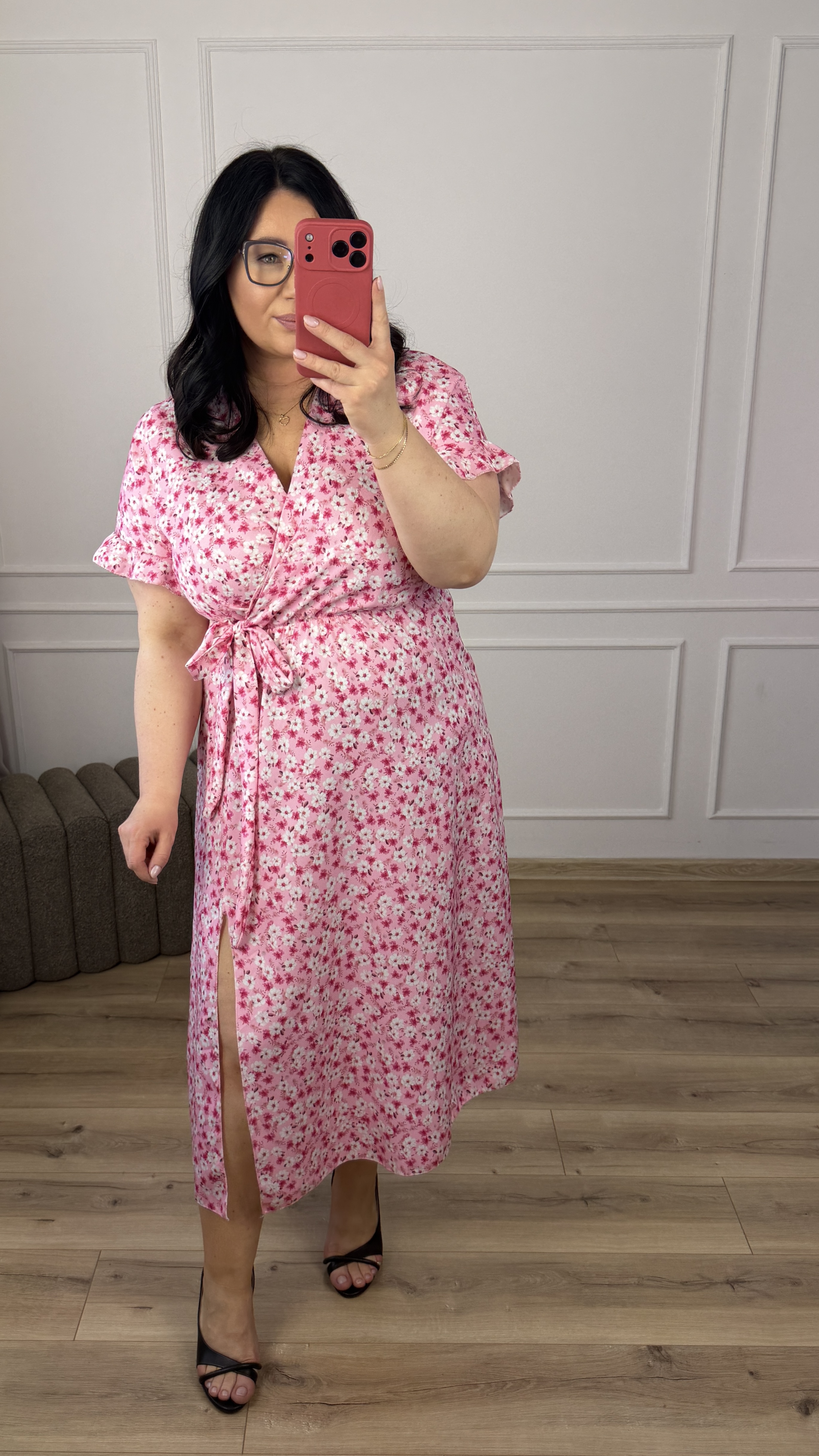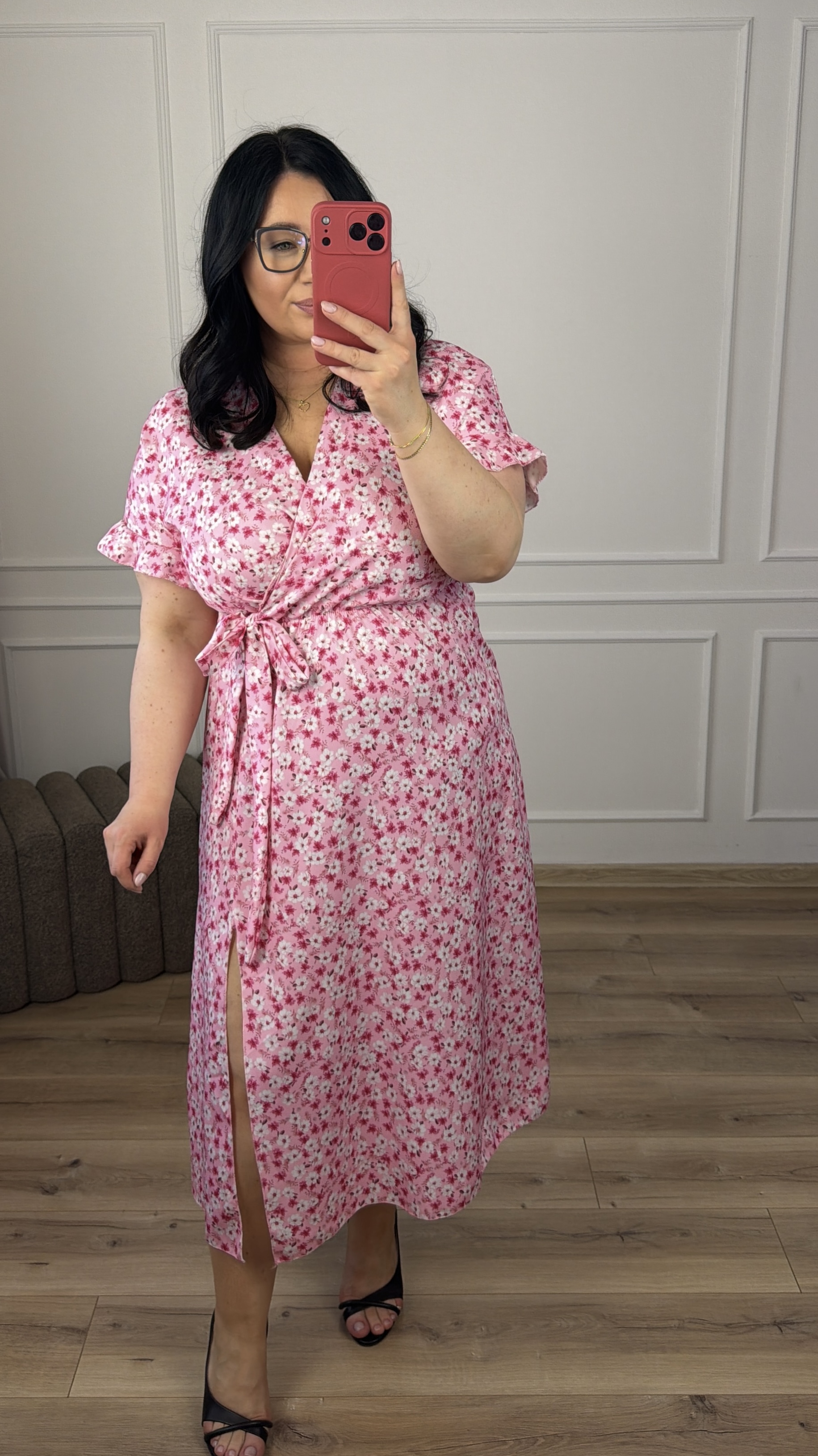 Prosta klasyczna sukienka w kwiatowy wzór. Spódnica długości midi z rozcięciem z przodu. Sukienka posiada zakładany dekolt oraz wiązany pas z boku. Sukienka świetnie sprawdzi się na cieplejsze dni ponieważ posiada klasyczny krótki rękaw zakończony falbanką. Świetnie sprawdzi się na co dzień jak i również na większe wyjścia.