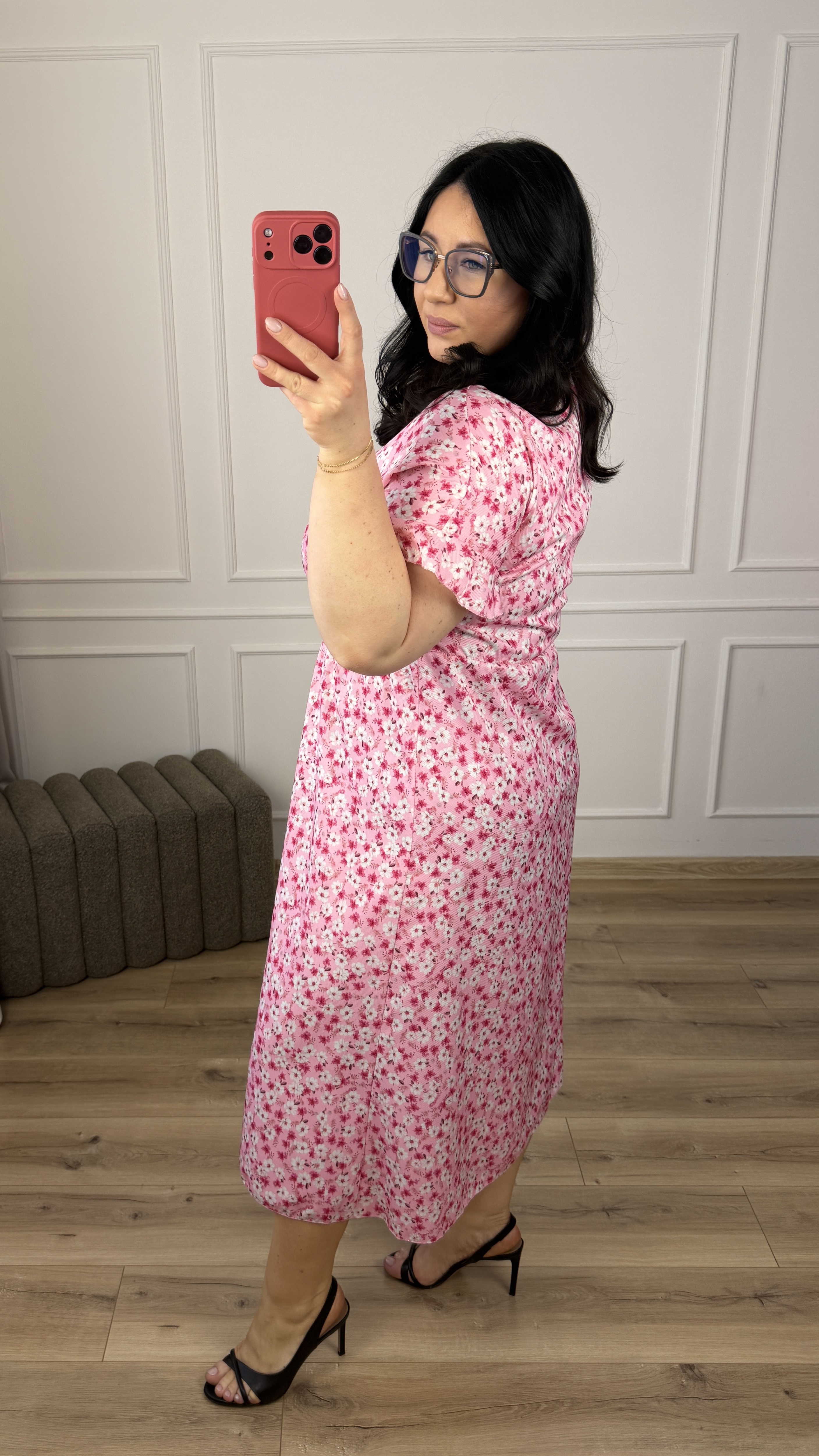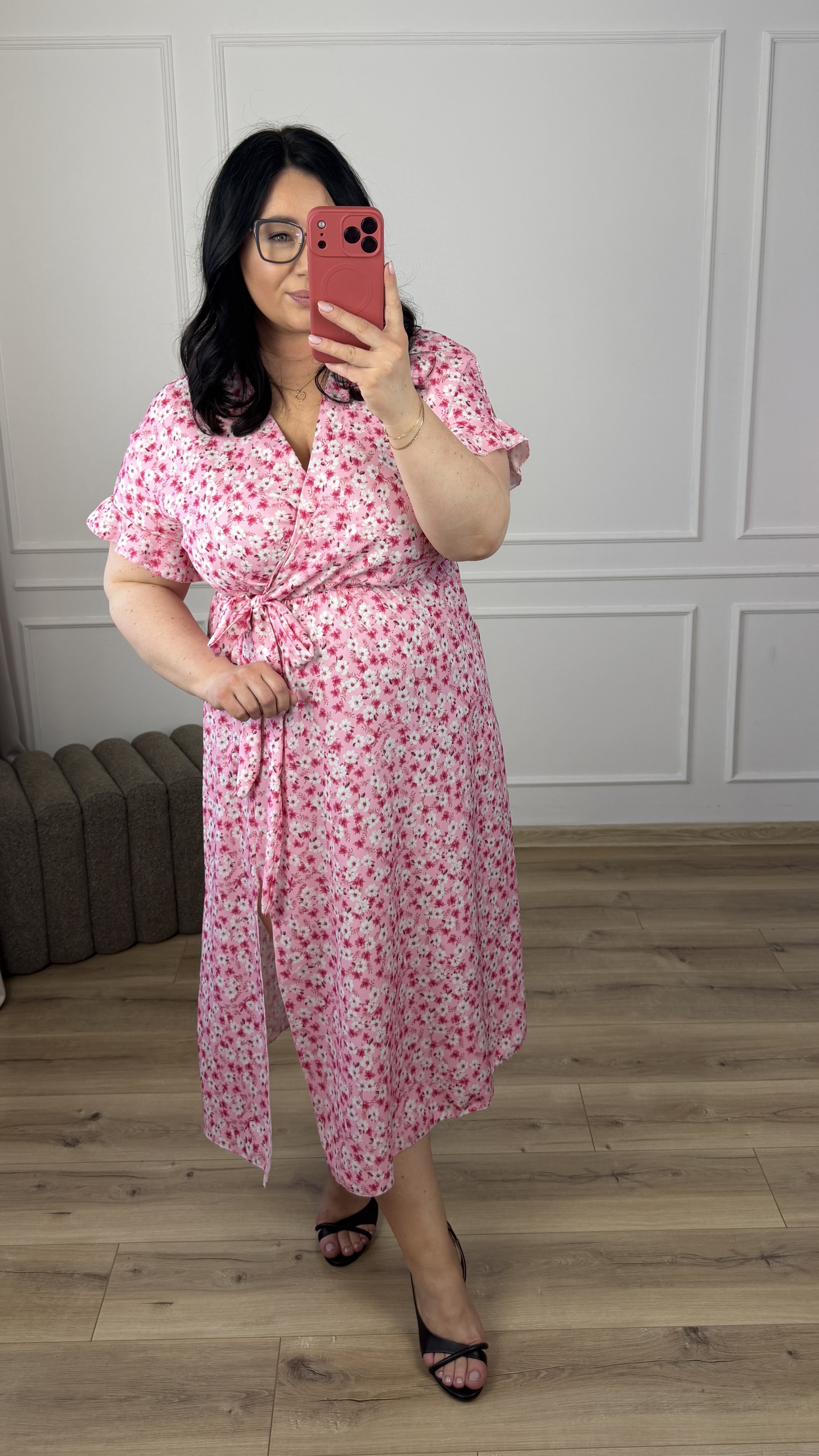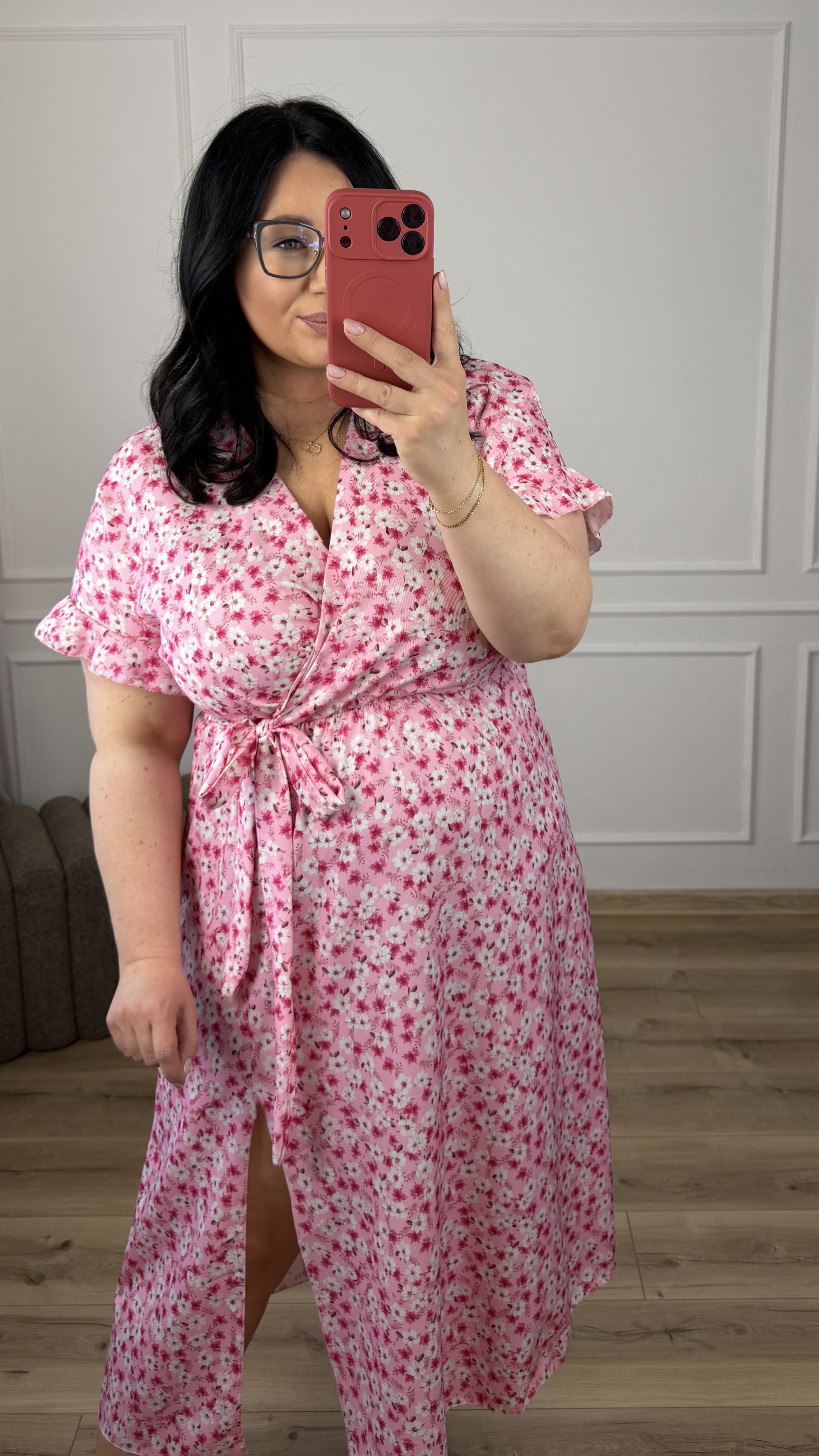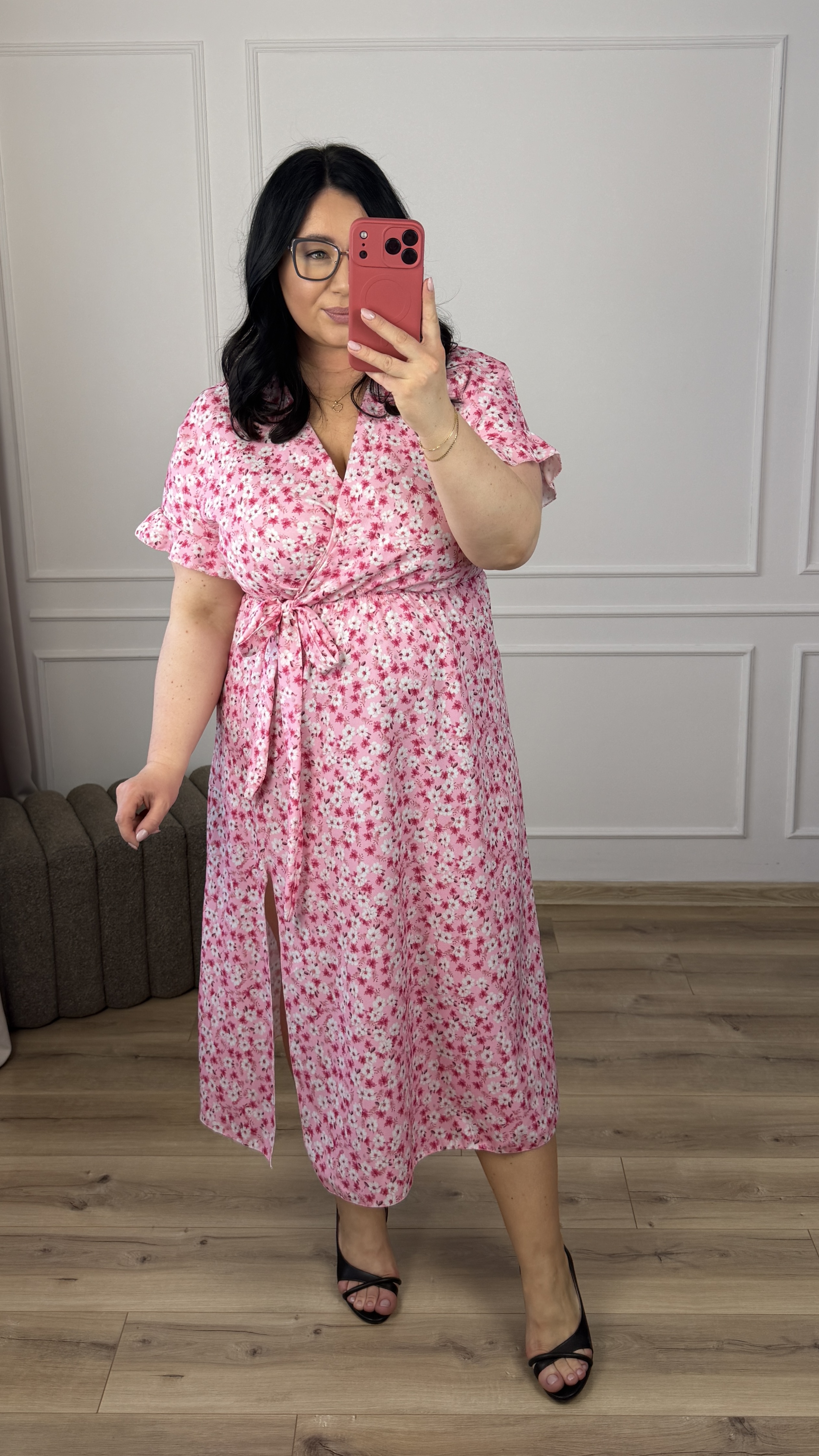 Prosta klasyczna sukienka w kwiatowy wzór. Spódnica długości midi z rozcięciem z przodu. Sukienka posiada zakładany dekolt oraz wiązany pas z boku. Sukienka świetnie sprawdzi się na cieplejsze dni ponieważ posiada klasyczny krótki rękaw zakończony falbanką. Świetnie sprawdzi się na co dzień jak i również na większe wyjścia.