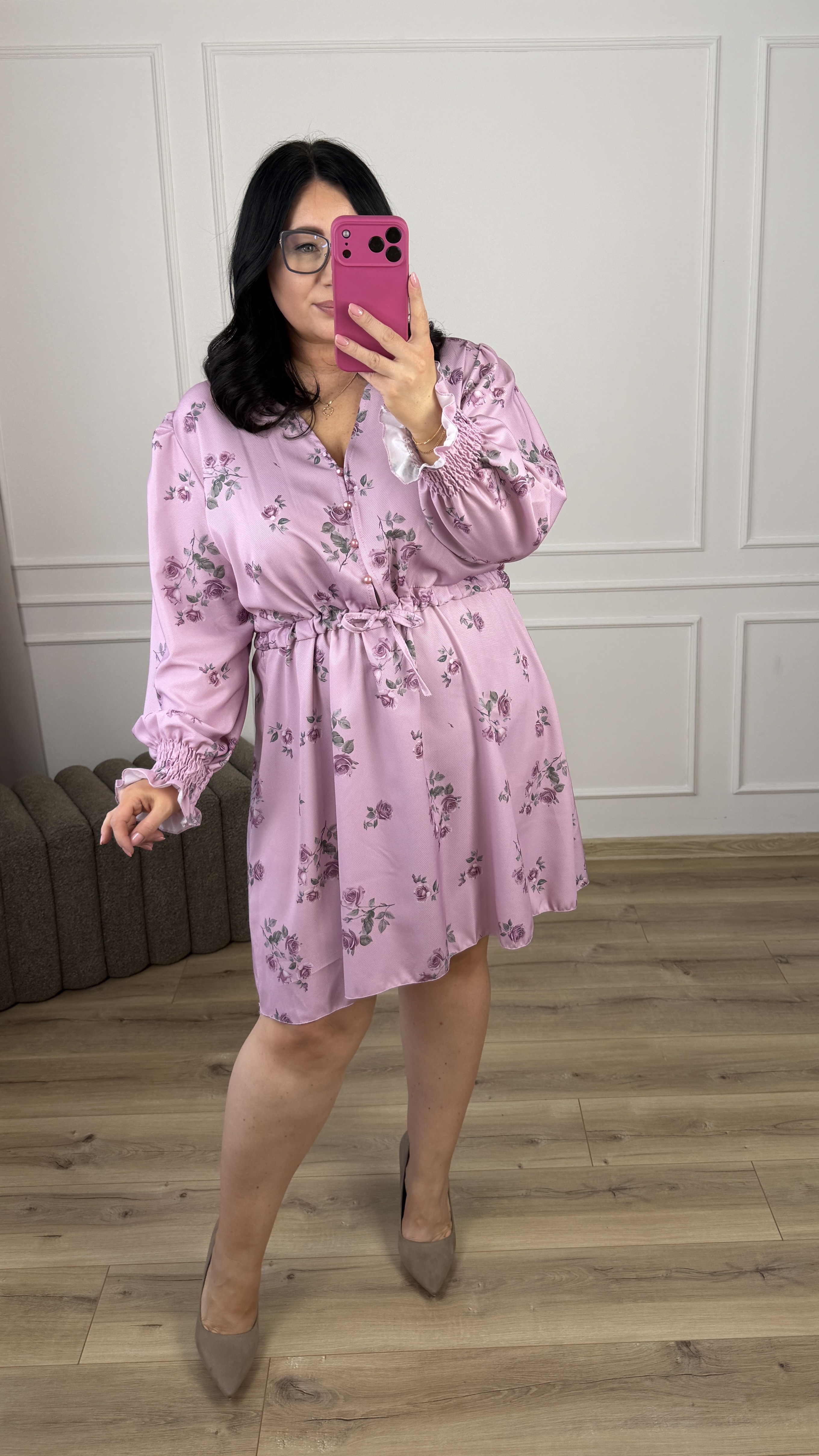 Sukienka mini o prostym kroju delikatnie rozkloszowanym ku dołowi. Dekolt zapinany na guziczki. W pasie przeszyta listwa materiału z wiązanym troczkiem. Długi rękaw zakończony gumeczkami z delikatną falbanką. Spódnica delikatnie rozkloszowana o długości mini.