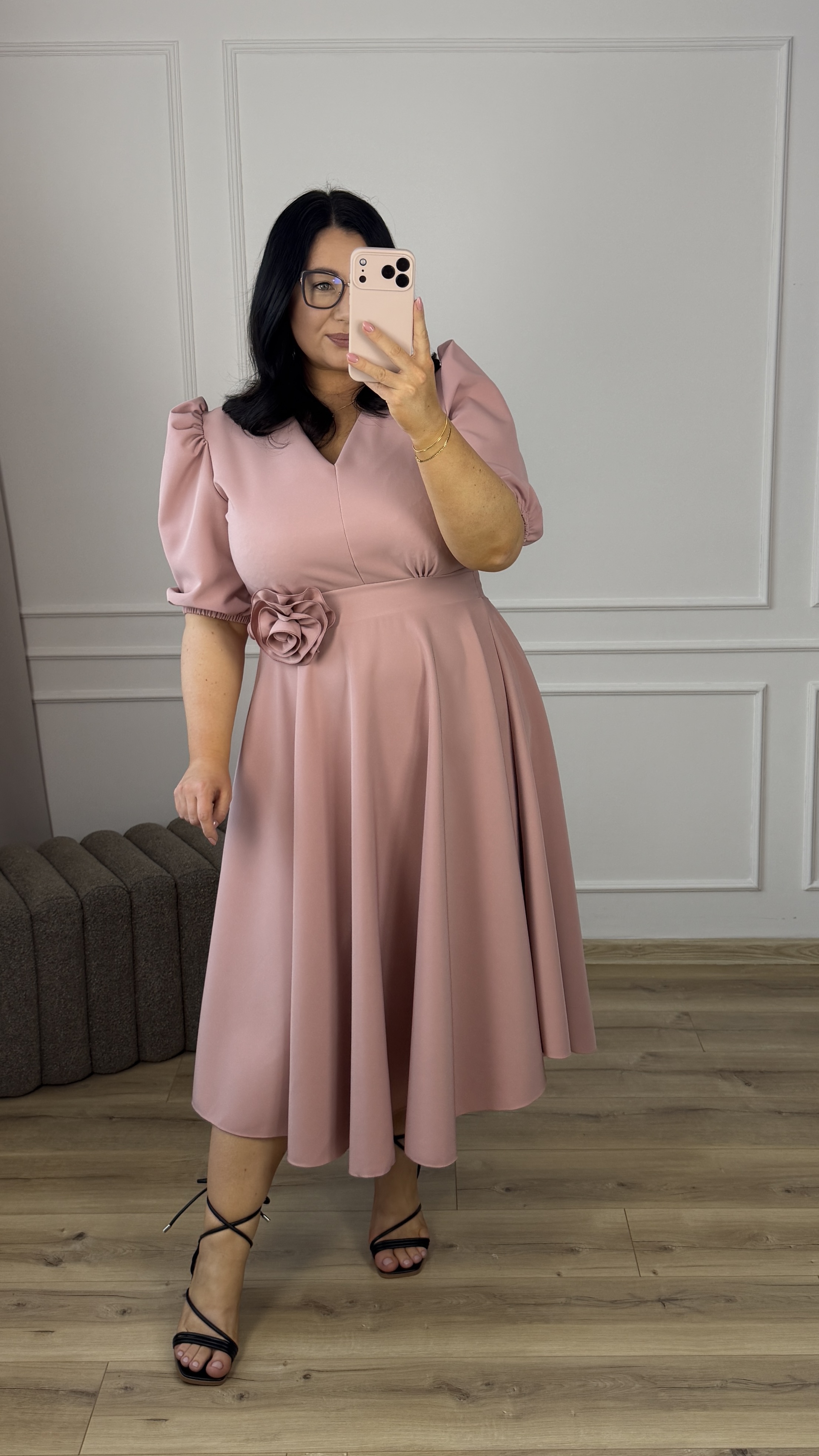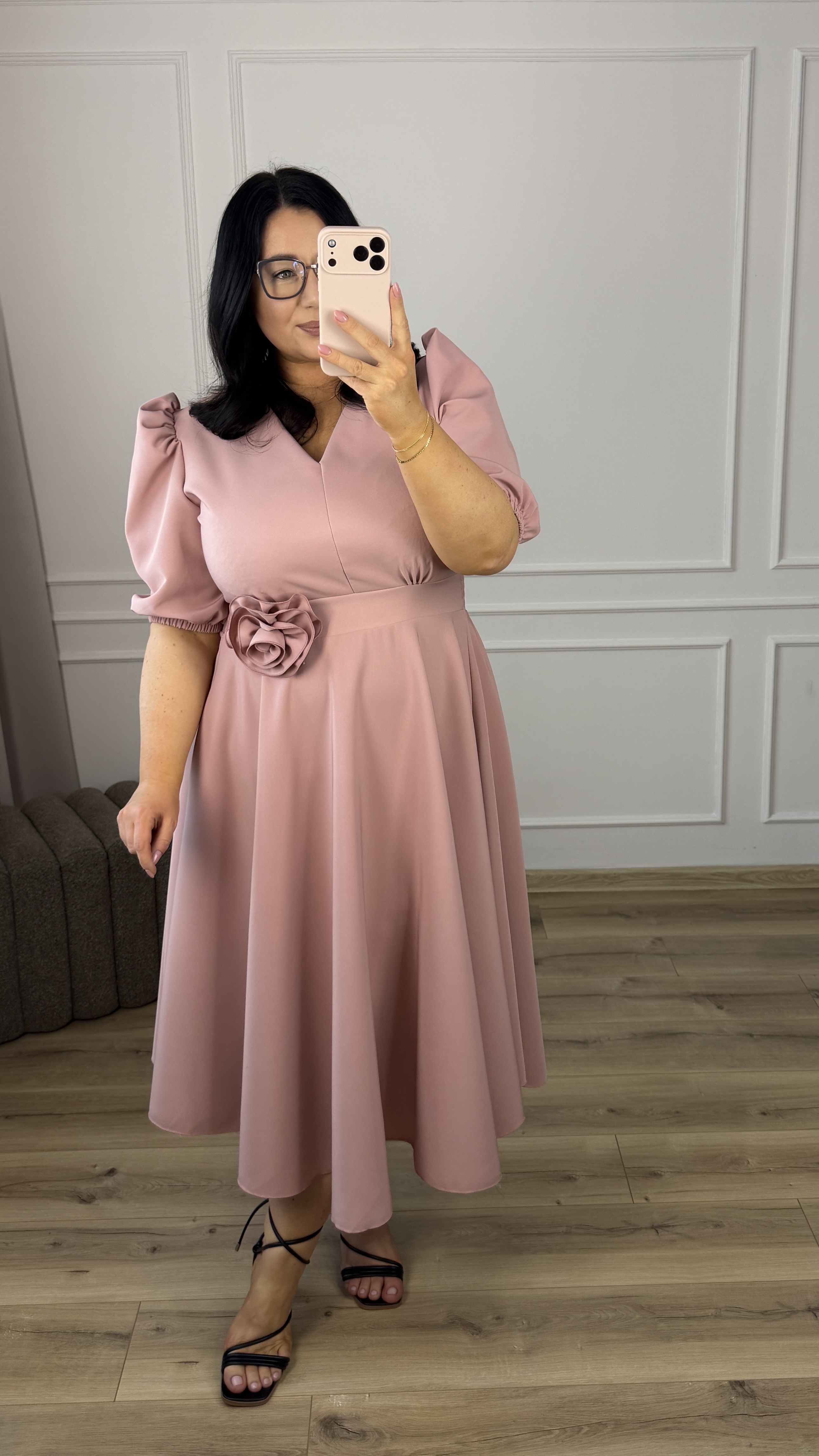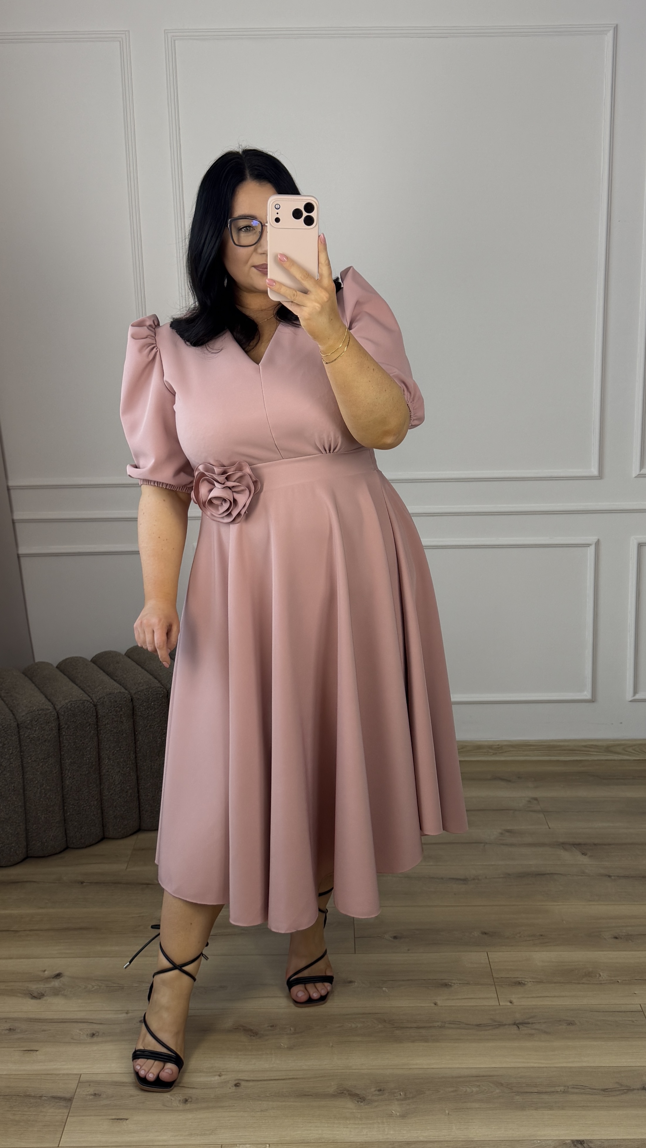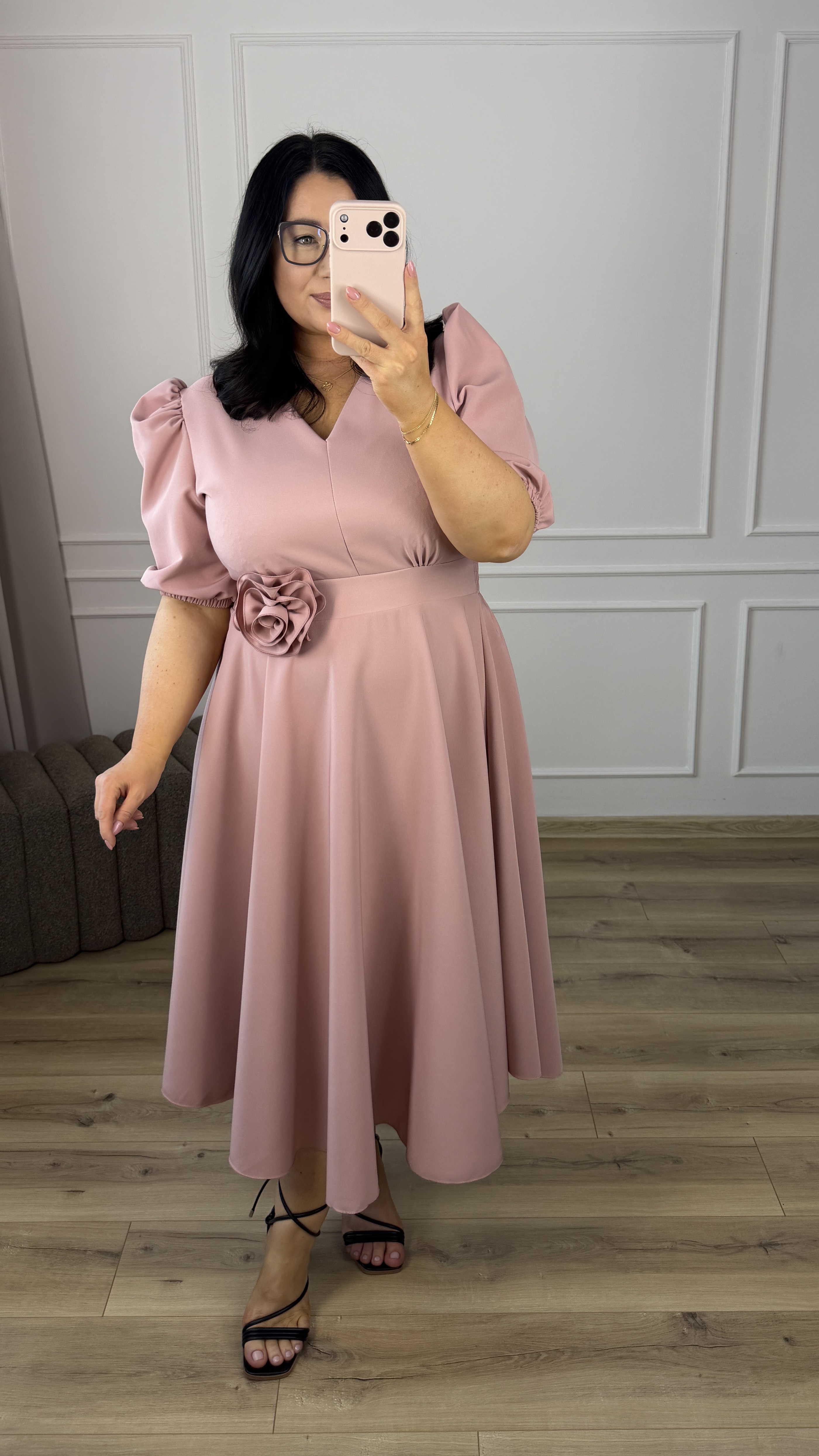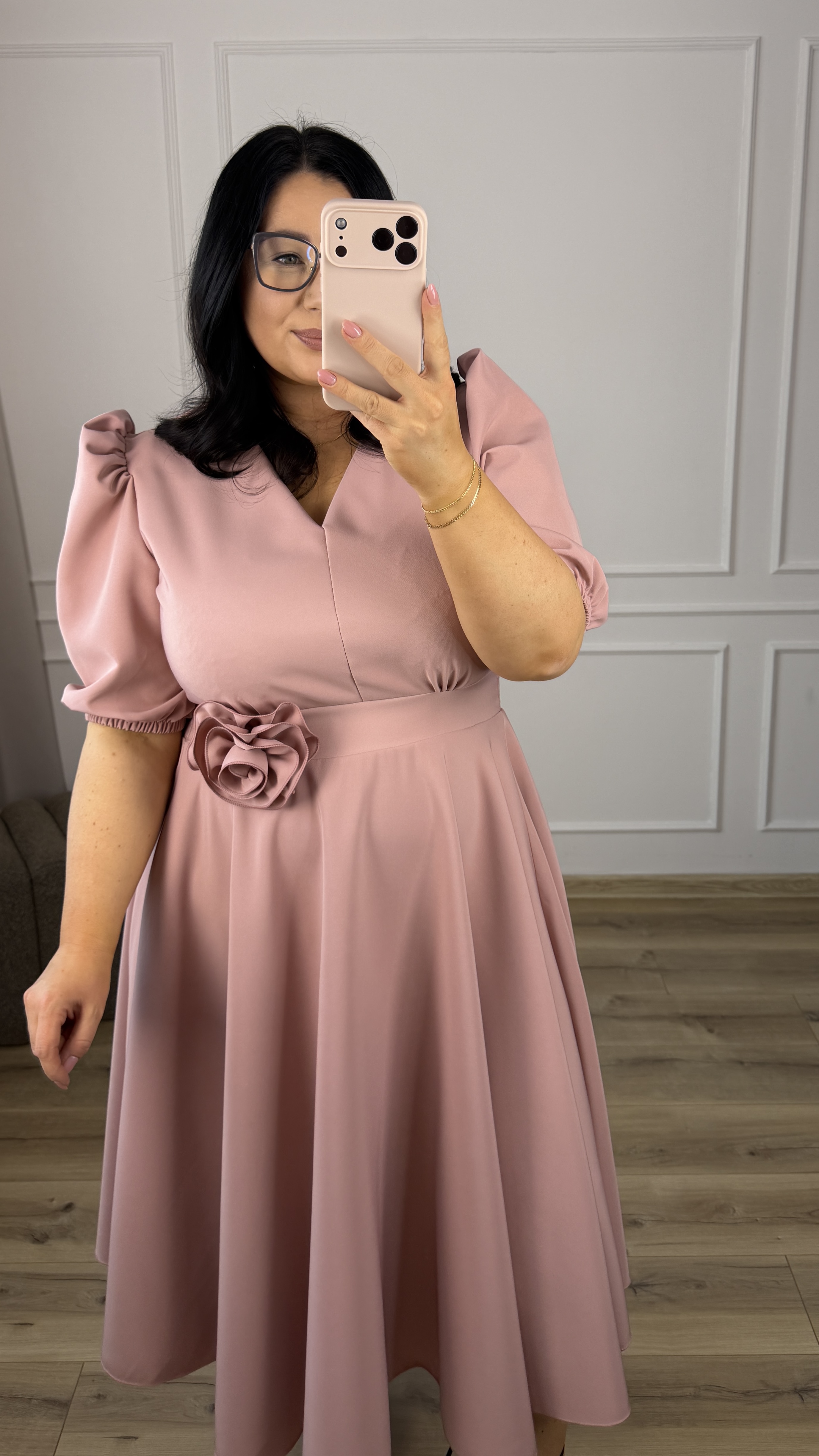 Elegancka sukienka okazjonalna długości midi. Model z ozdobną różą którą można odpiąć i przypiąć w wygodnym dla siebie miejscu. Krótki rękaw typu bufka pięknie podkreśla ramiona. Delikatny dekolt w V oraz podkreślony pas idealnie modelują sylwetkę (z tyłu gumka, dzięki czemu dopasowuje się do sylwetki). Spódnica długości midi o rozkloszowanej formie świetnie ukrywa niedoskonałości figury. Model dzięki eleganckiej formie idealnie sprawdzi się na imprezę okazjonalną typu: chrzest, komunia czy wesele.