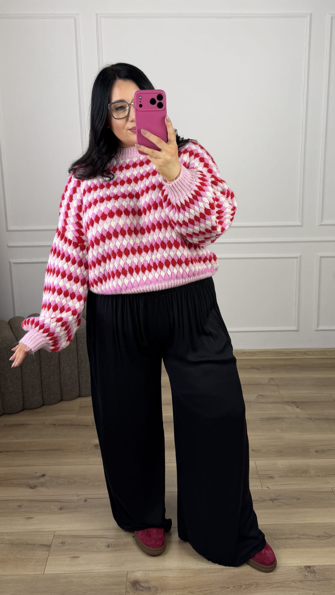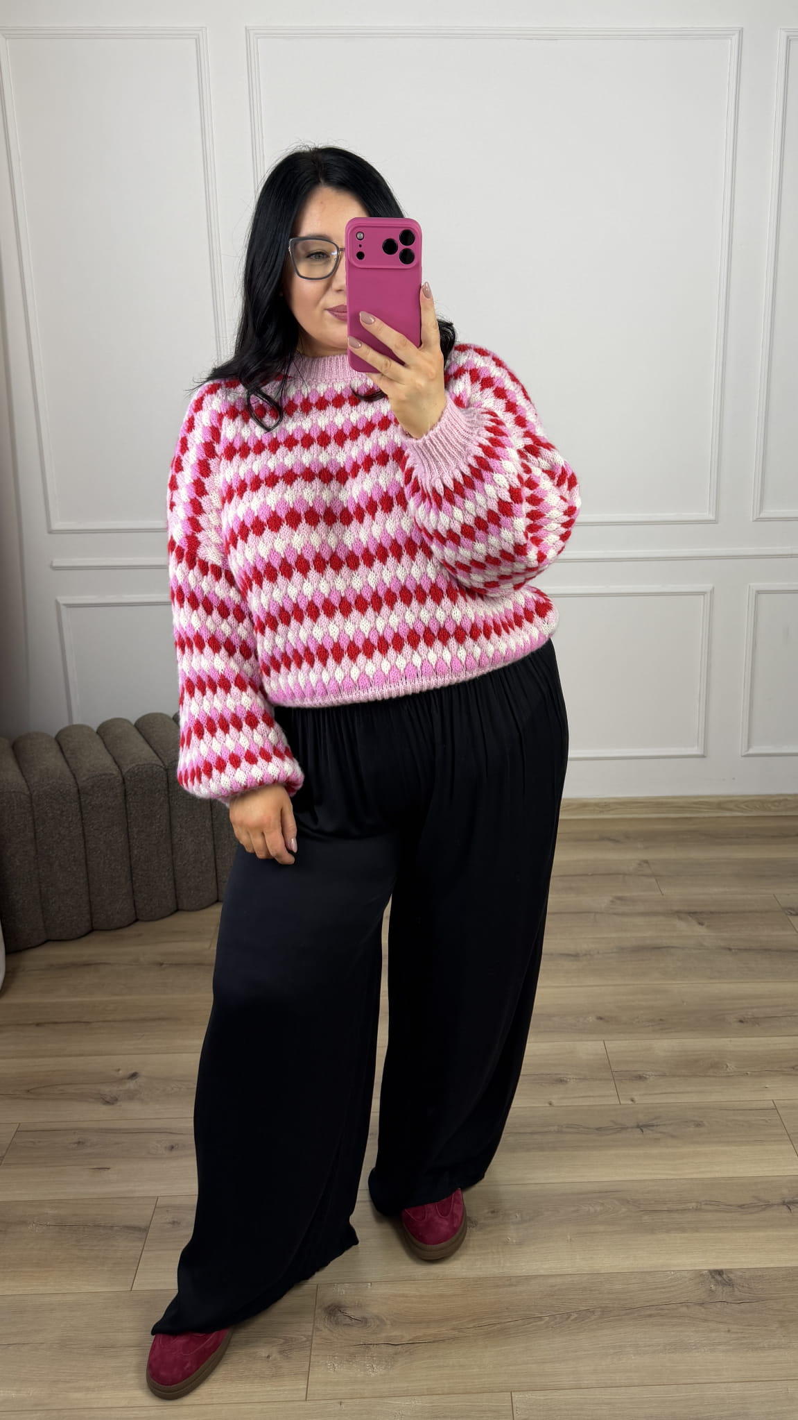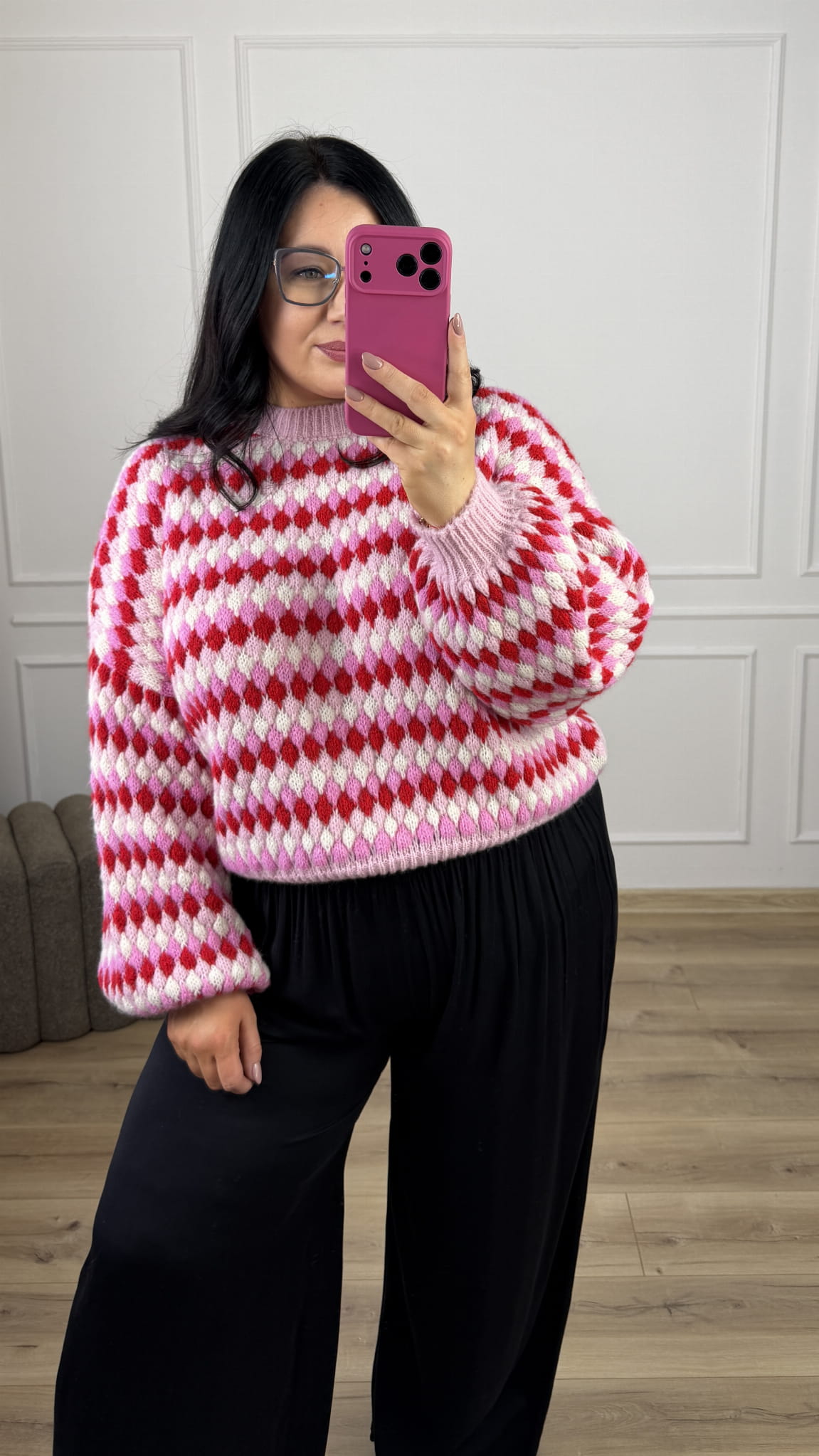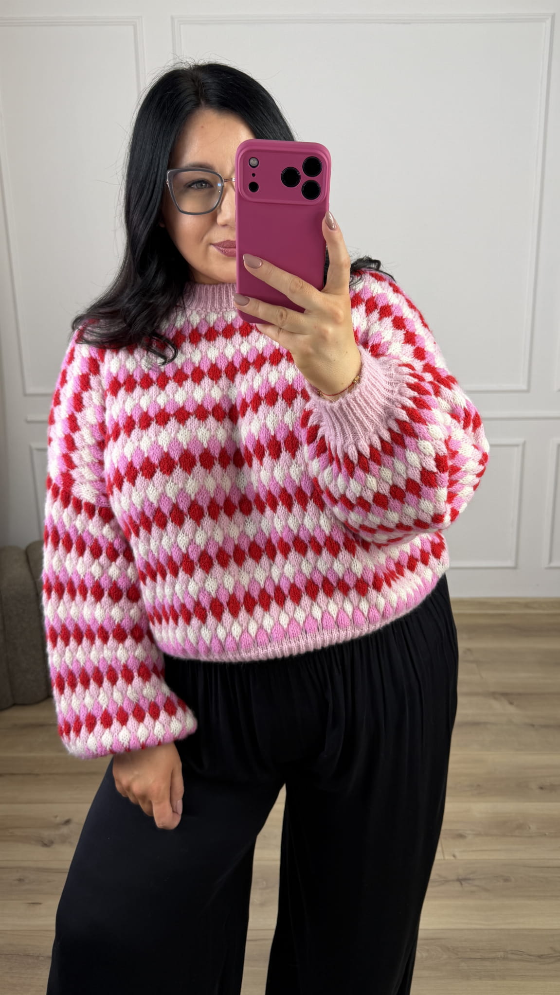 Efektowny sweter o mięsistym splocie. Posiada okrągły delikatny dekolt, długi rozszerzany rękaw - zakończony mankietem. Luźny krój oversize. Sweter dzięki połączeniu kolorów idealnie wpisuje się na wiosnę 2026