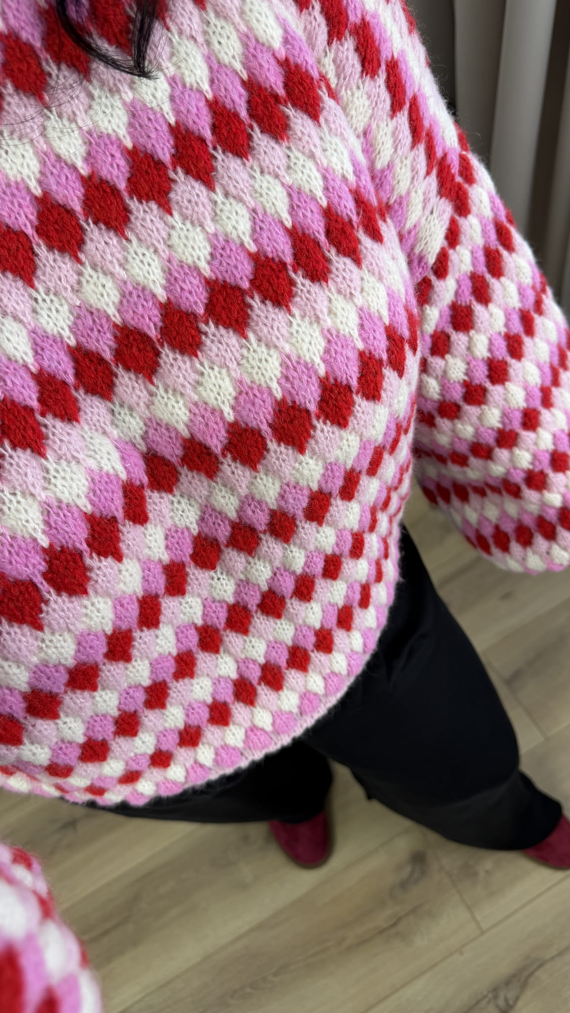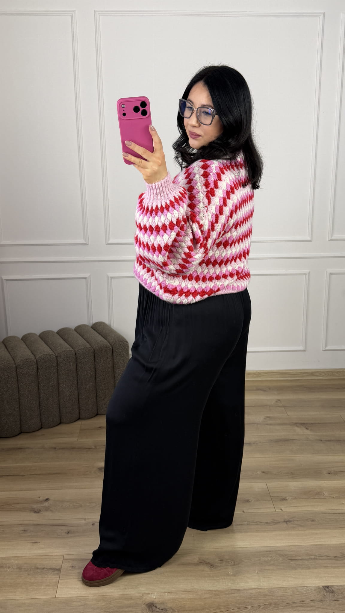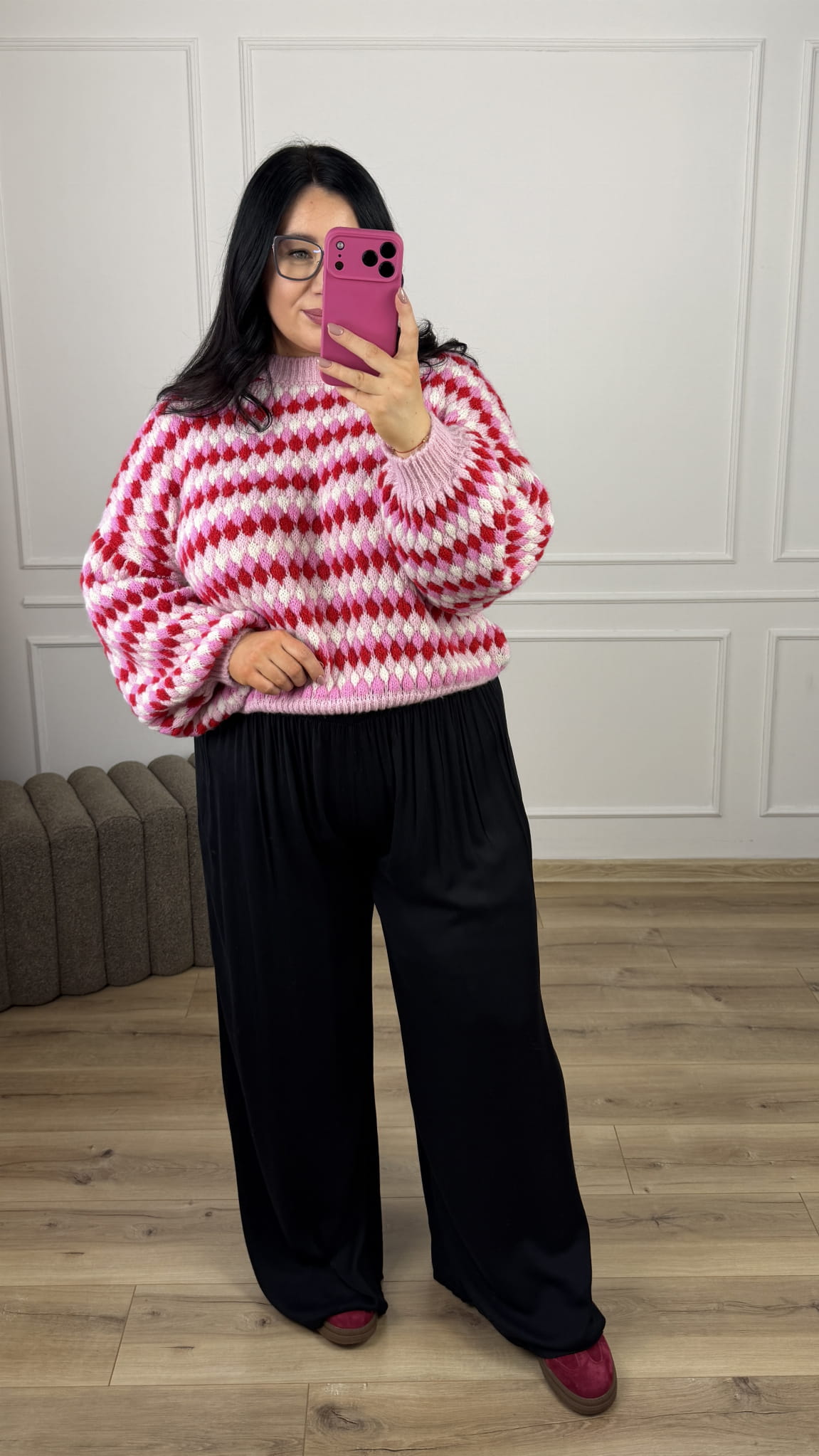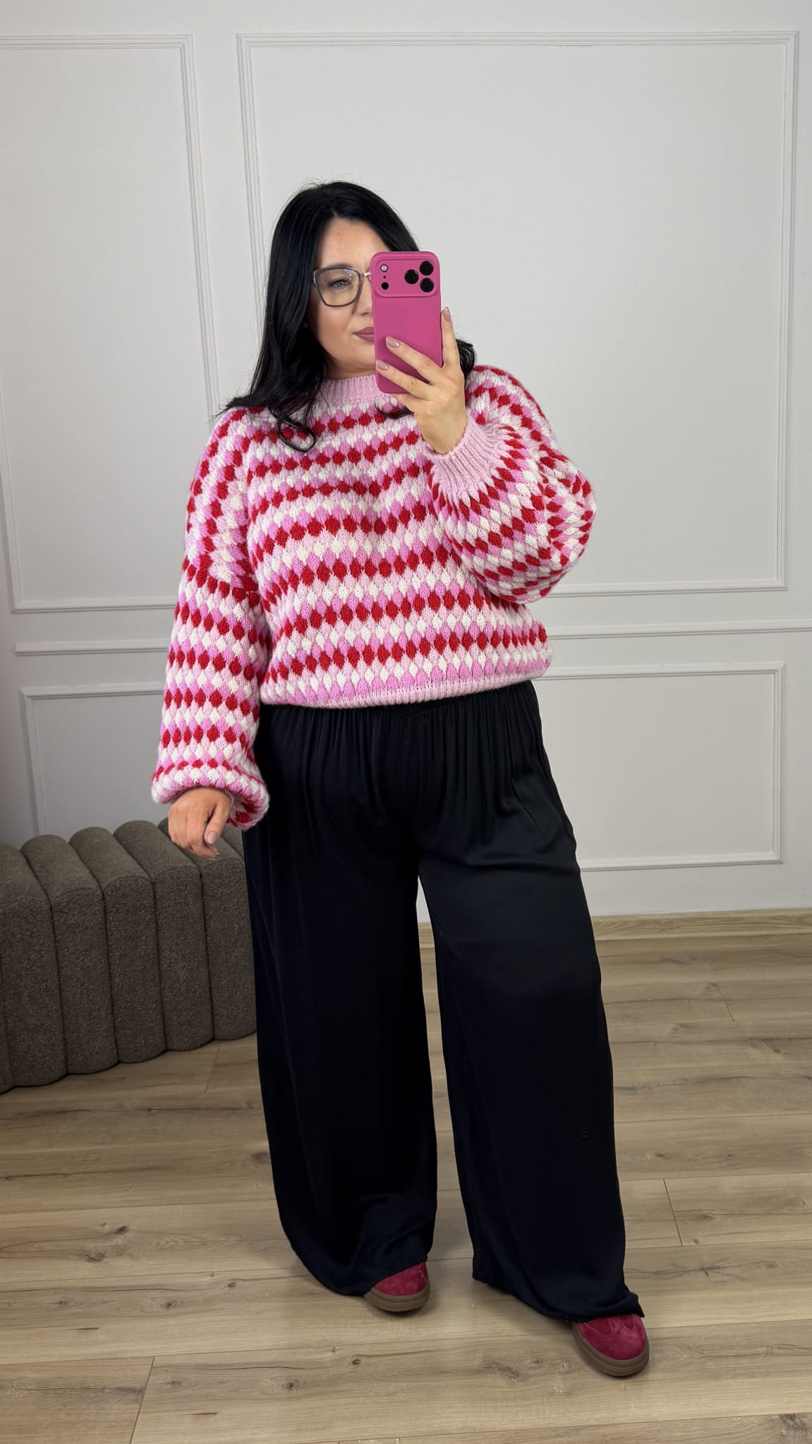 Efektowny sweter o mięsistym splocie. Posiada okrągły delikatny dekolt, długi rozszerzany rękaw - zakończony mankietem. Luźny krój oversize. Sweter dzięki połączeniu kolorów idealnie wpisuje się na wiosnę 2026