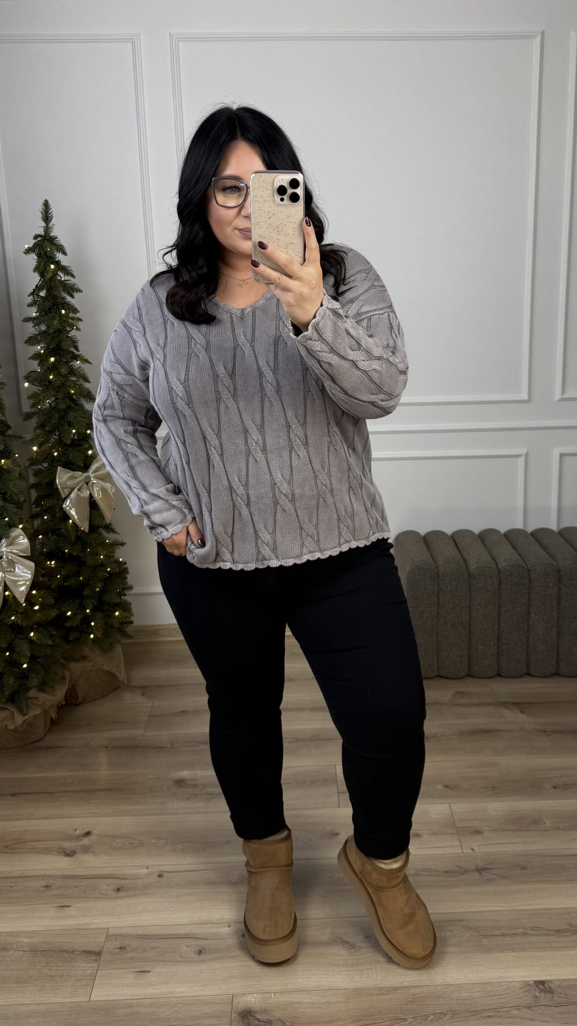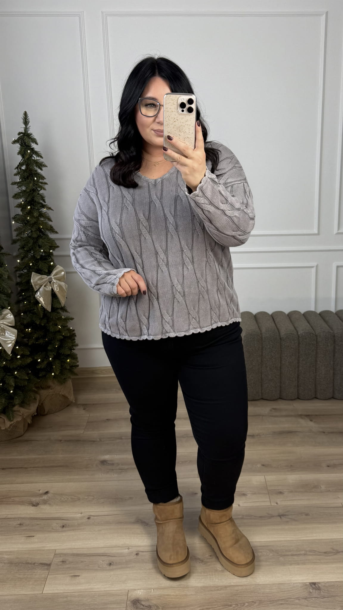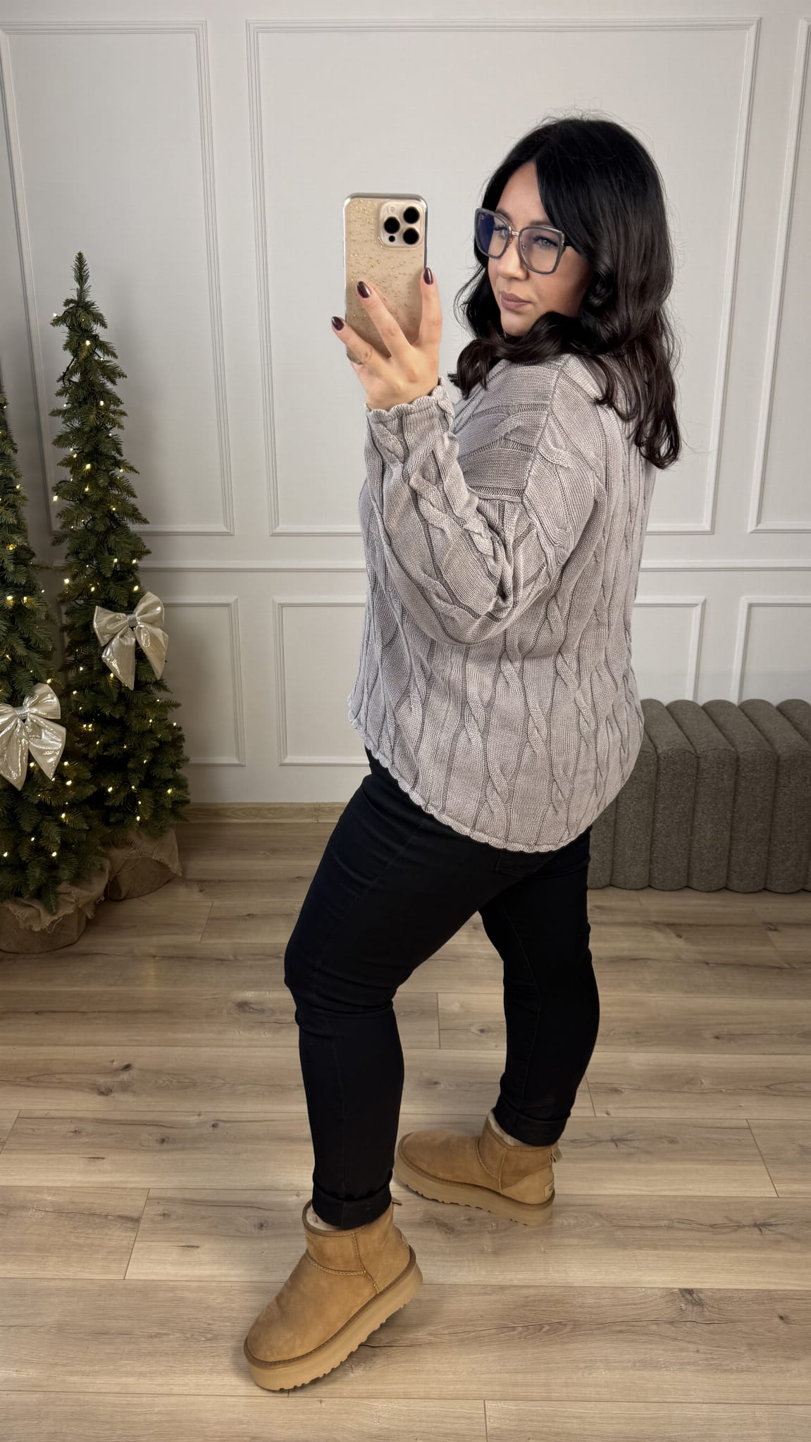 Świetny dekatyzowany sweter z ozdobnym splotem to idealna propozycja na zimowe dni. Sweter z dekoltem typu serek, zakładany przez głowę z falbankowym wykończeniem. Sweter posiada idealny skład 100% bawełna oraz ozdobny splot, który dodaje mu struktury i stylowego charakteru.
