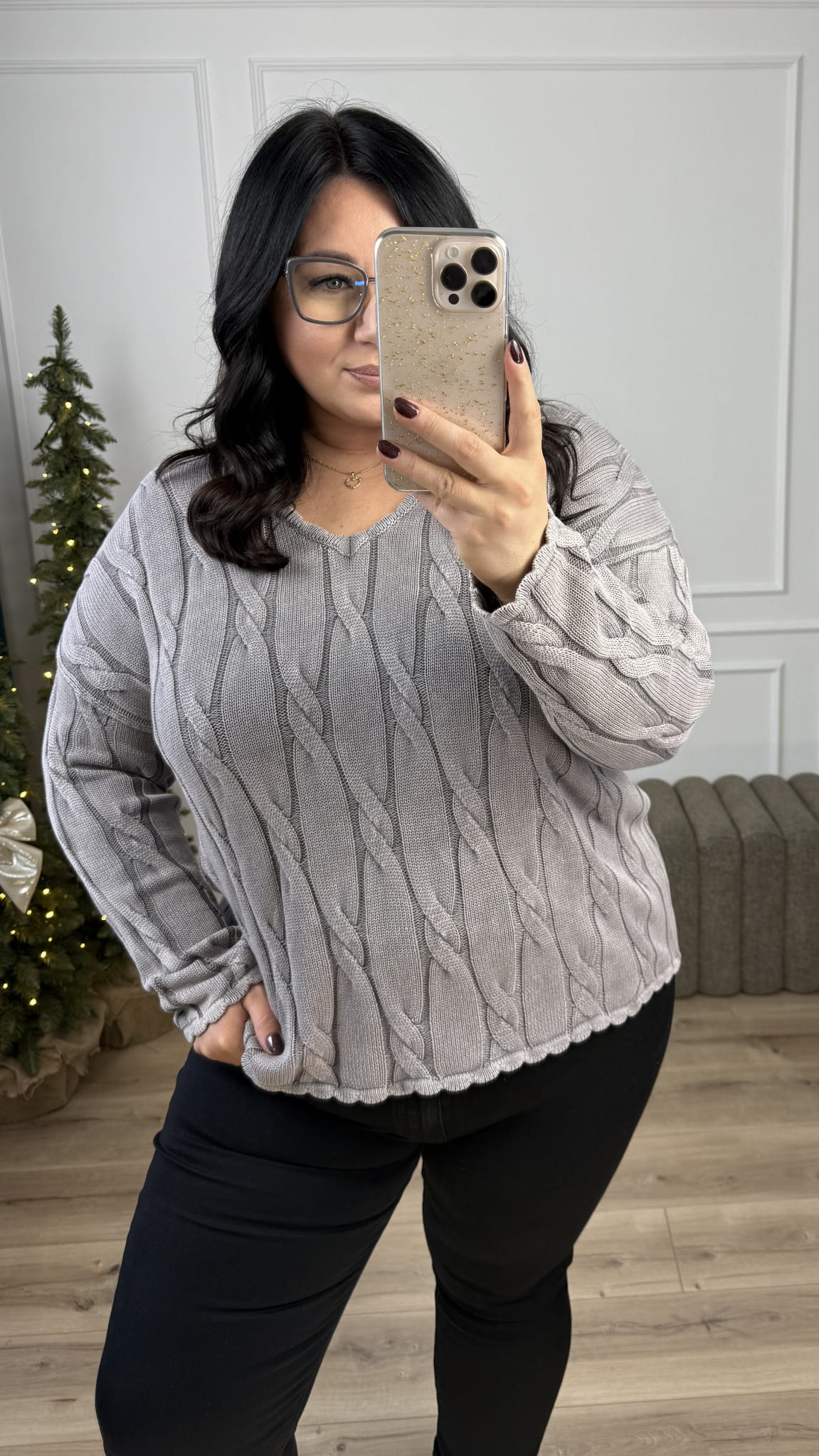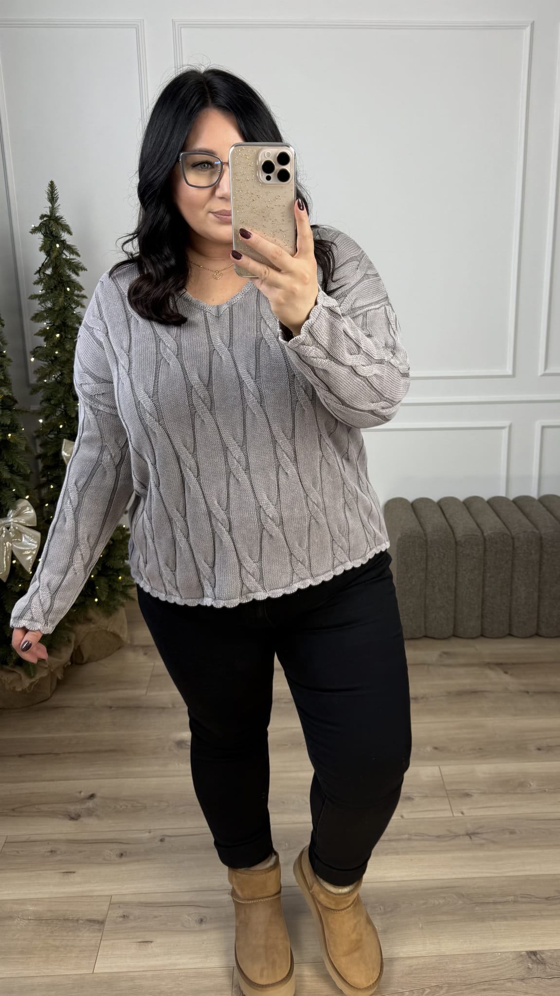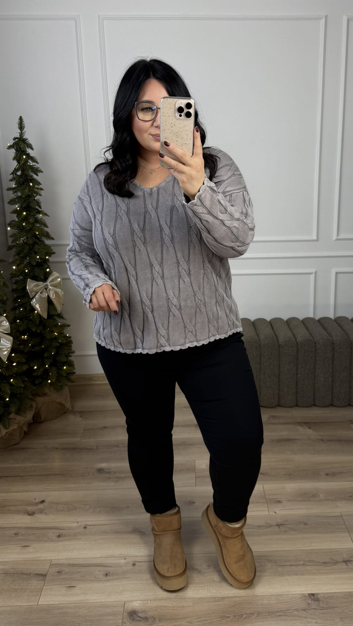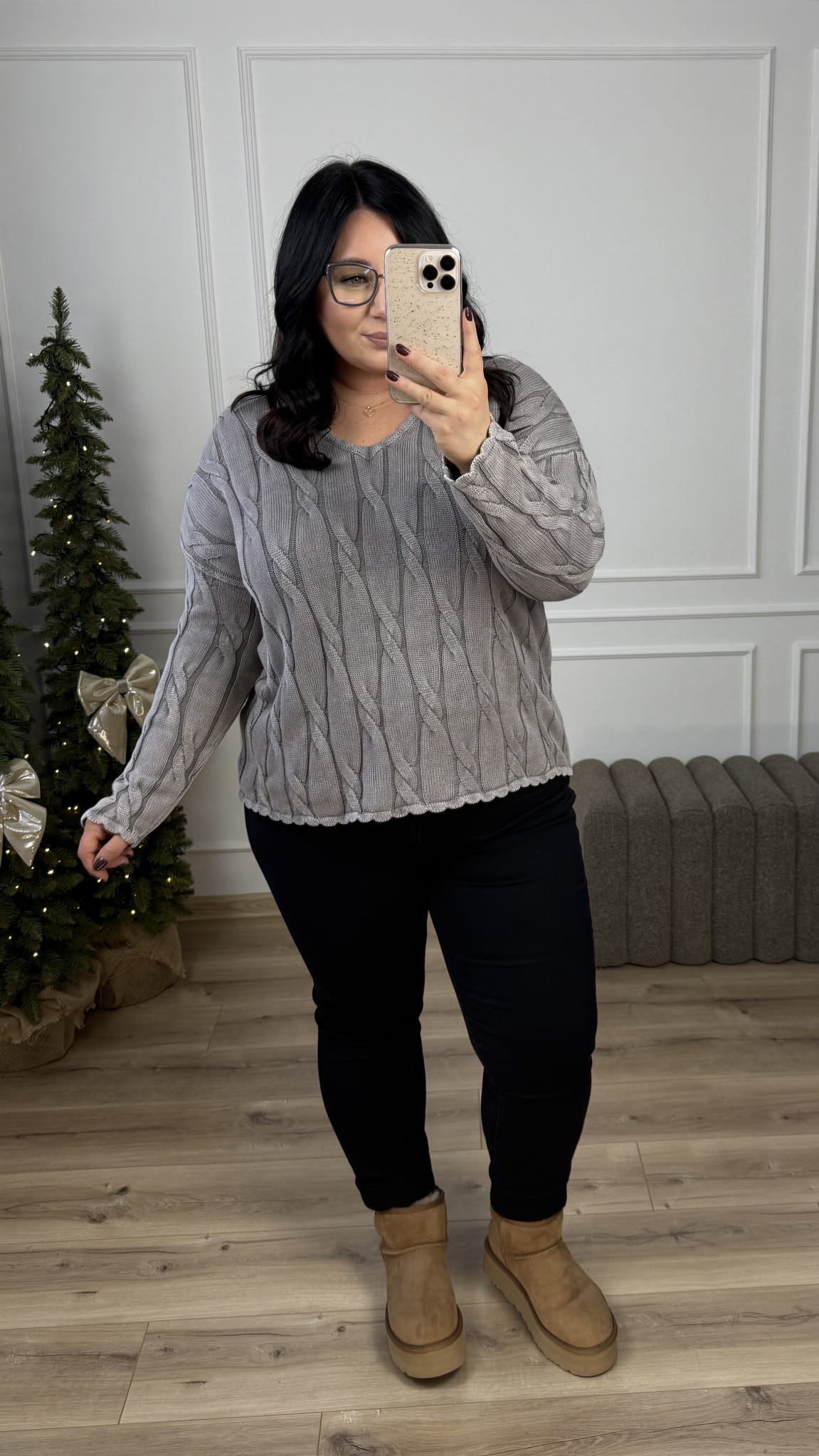 Świetny dekatyzowany sweter z ozdobnym splotem to idealna propozycja na zimowe dni. Sweter z dekoltem typu serek, zakładany przez głowę z falbankowym wykończeniem. Sweter posiada idealny skład 100% bawełna oraz ozdobny splot, który dodaje mu struktury i stylowego charakteru.