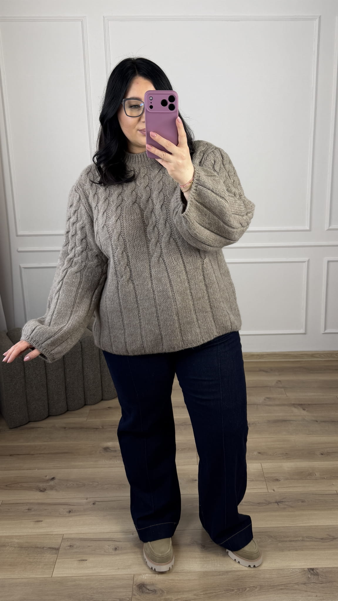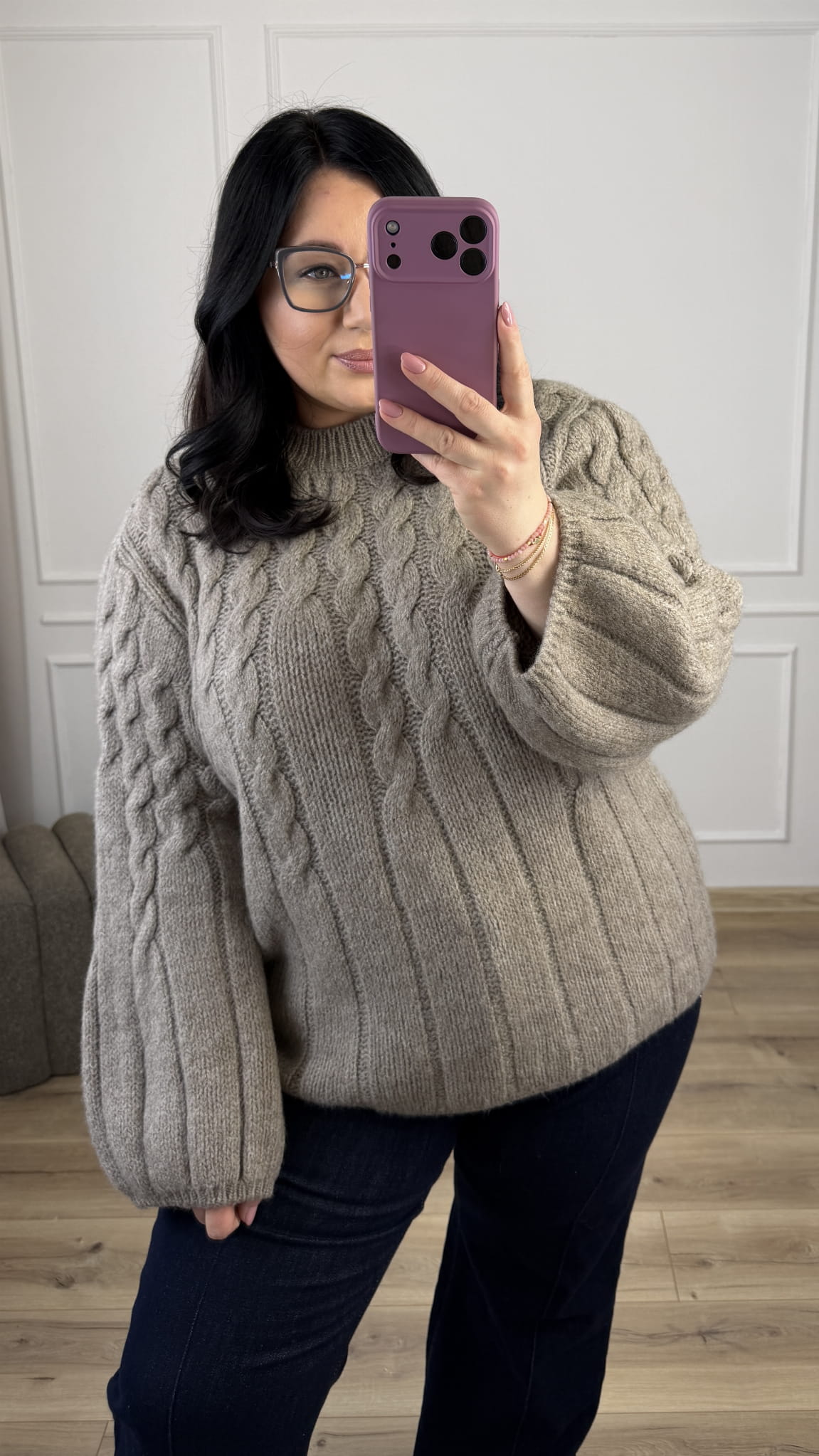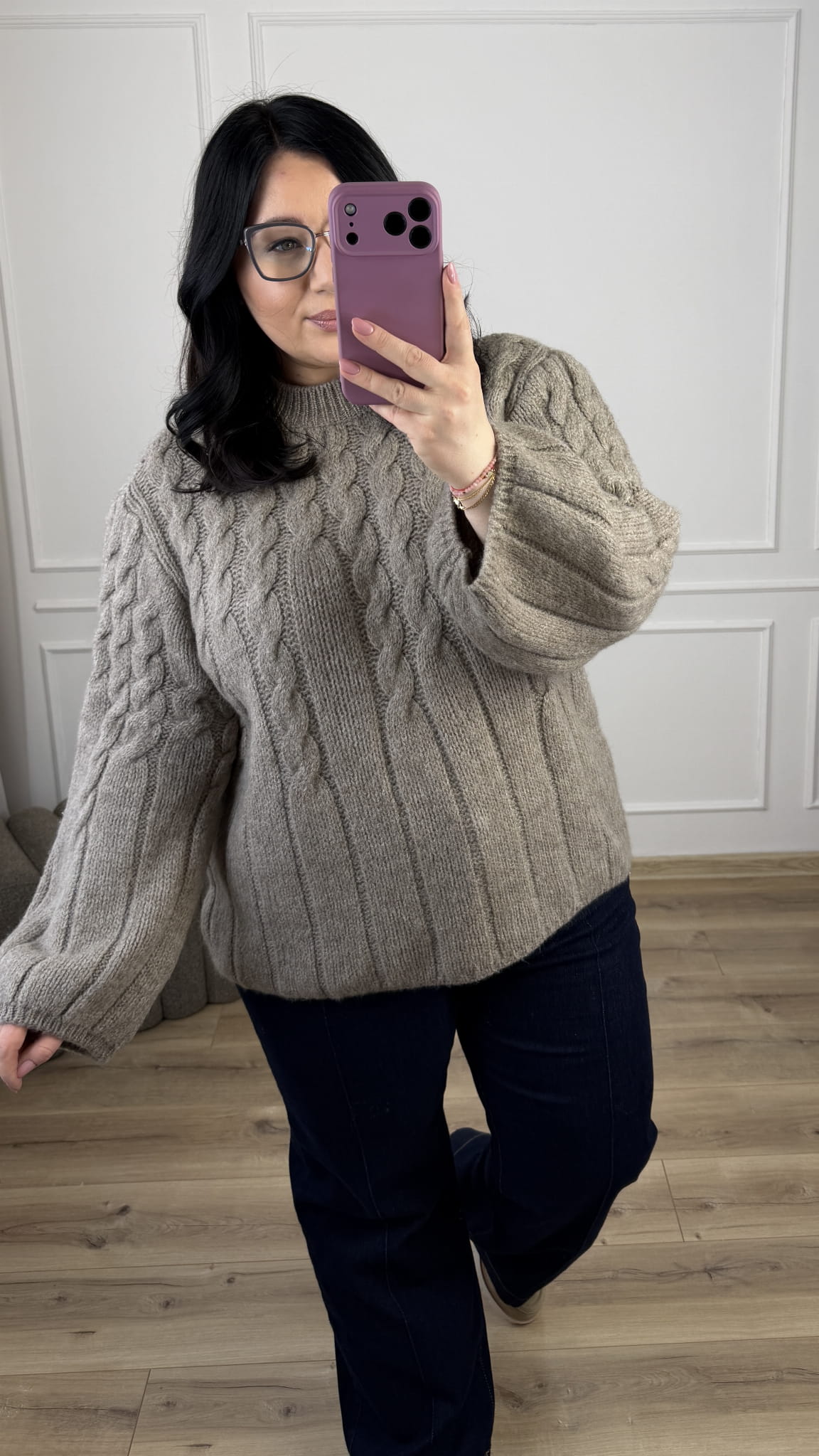 Dłuższy sweter z wełną sprawdzi się idealnie w obecnym sezonie zimowo/wiosennym. Sweter posiada łańcuszkowy splot oraz długi rękaw typu dzwonek. Model świetnie sprawdzi się w połączeniu z jeansami czy też z legginsami, ze względu na swoją długość