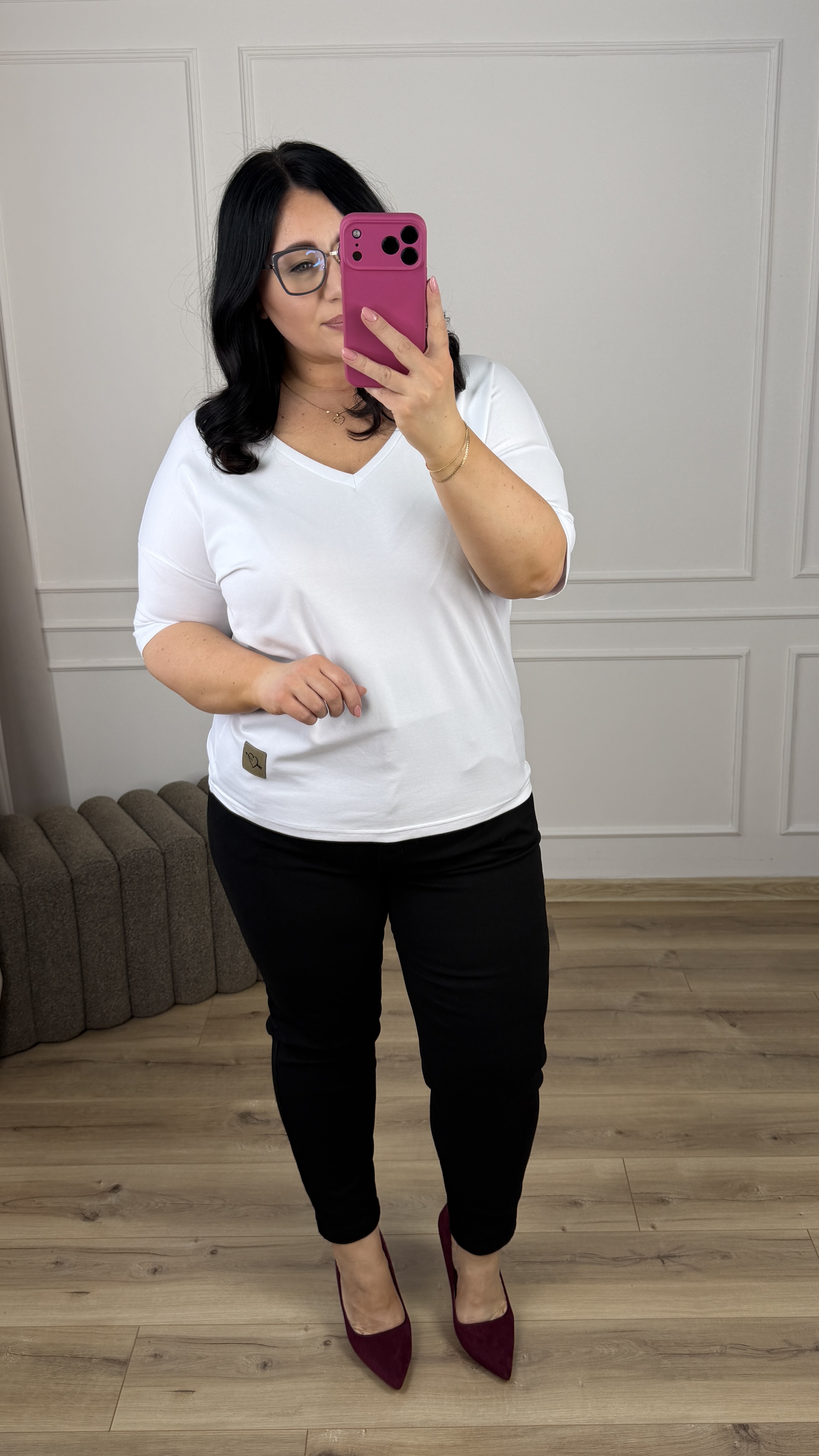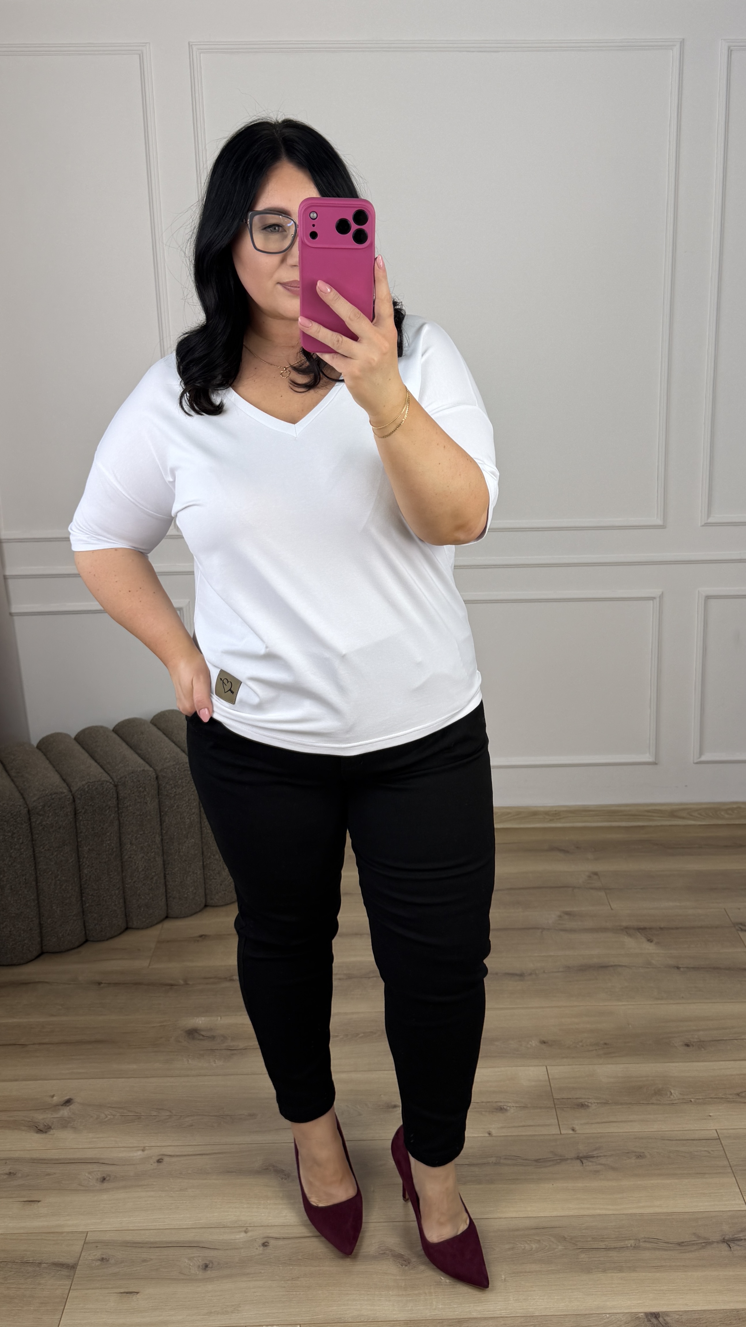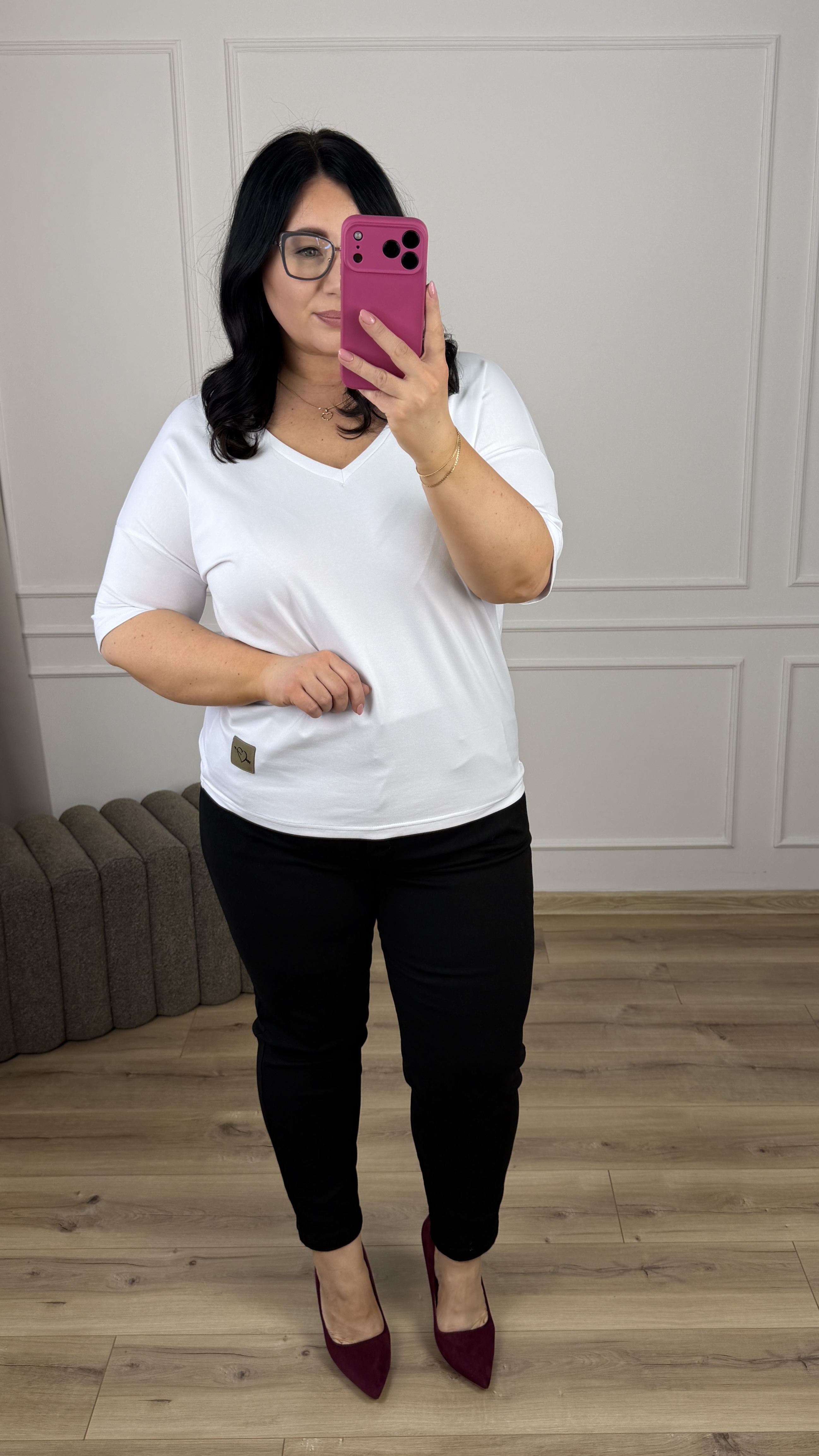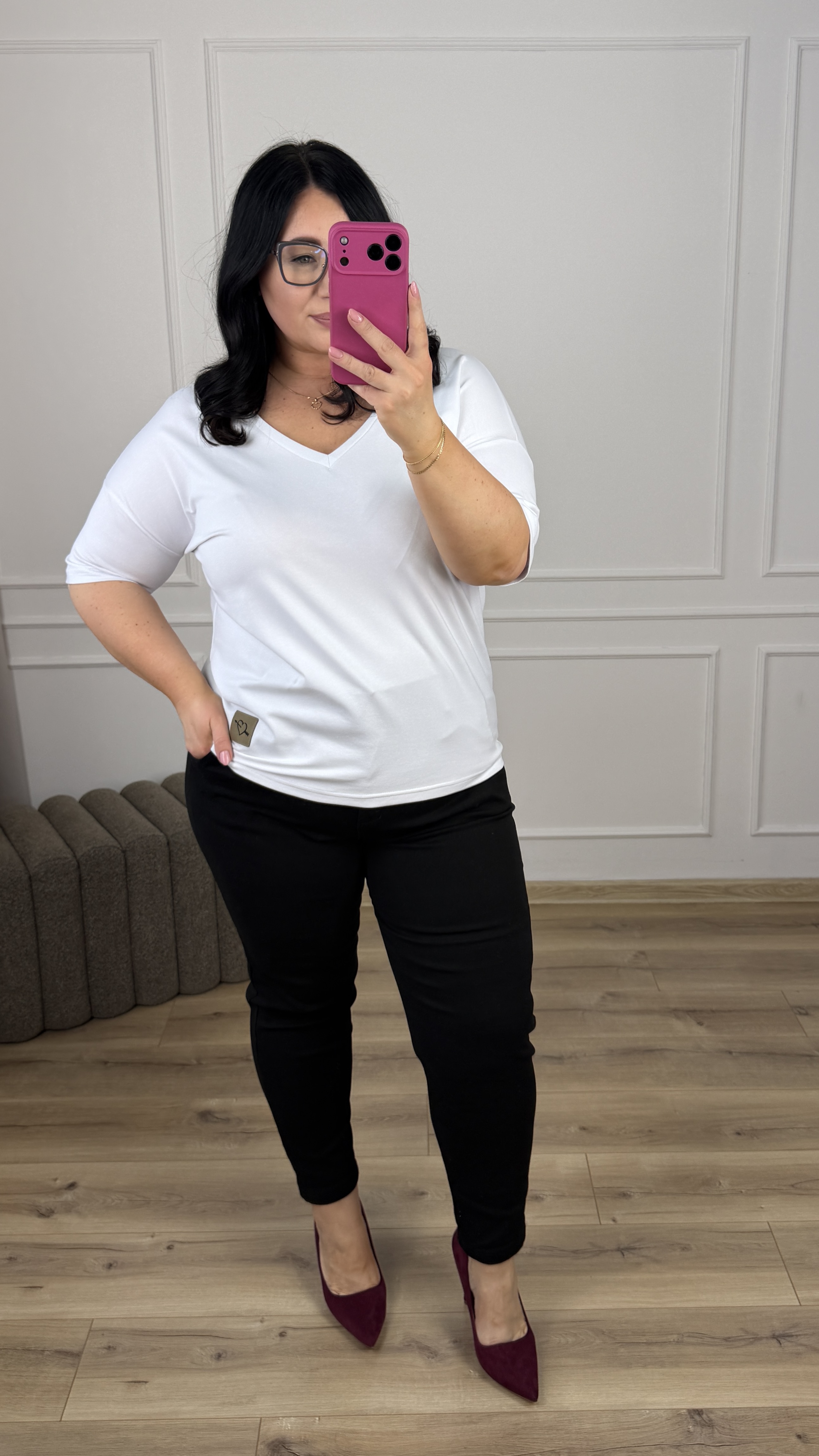 Klasyczny t-shirt grubszej bawełny polskiego producenta. Lekko zwężany ku dołowi, dekolt w serek idealnie sprawdzi się przy większym biuście. Krótki rękaw z obniżoną linią ramion. Model dzięki swojej uniwersalności świetnie sprawdzi się jako baza do większości wiosennych stylizacji.