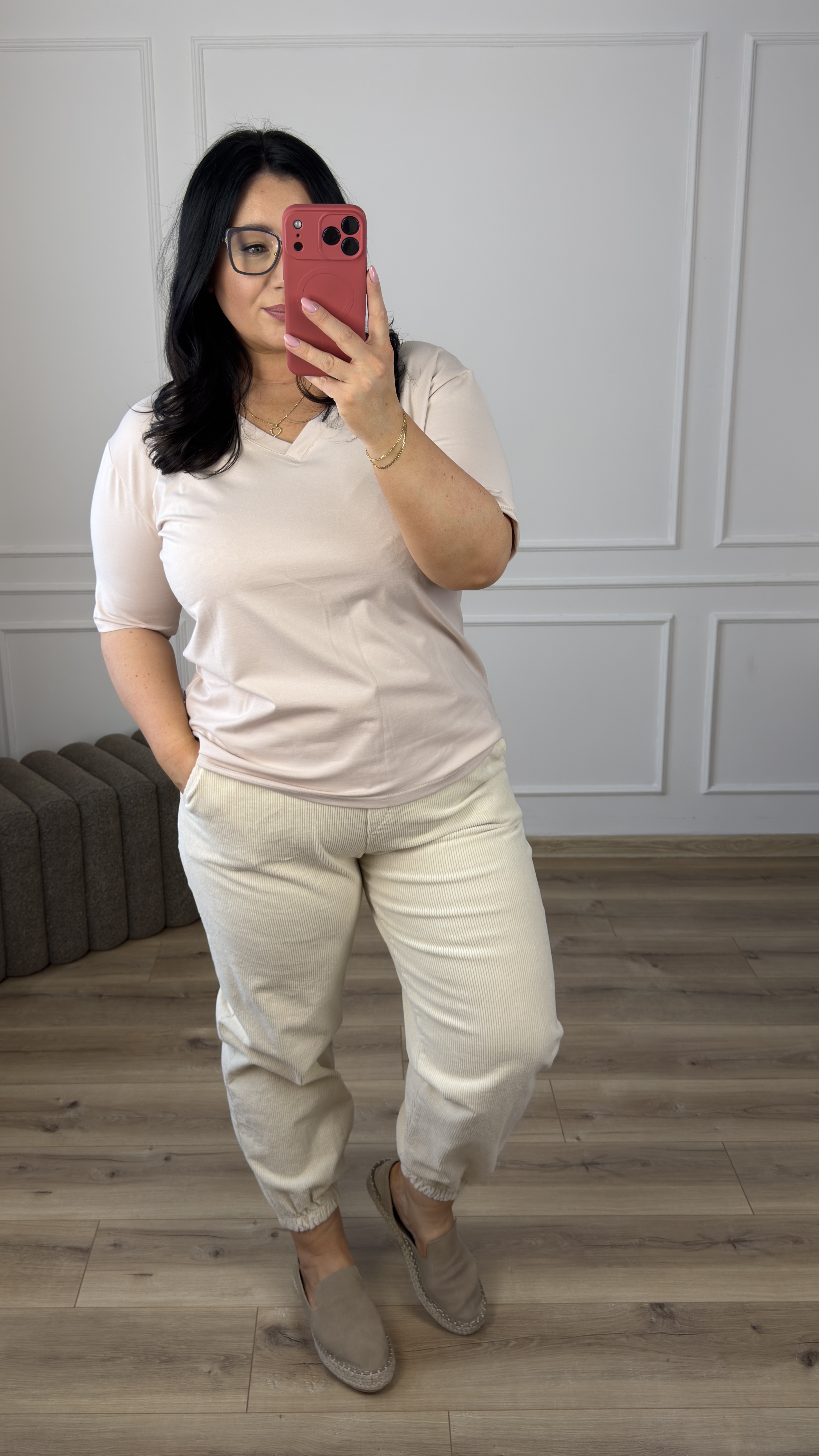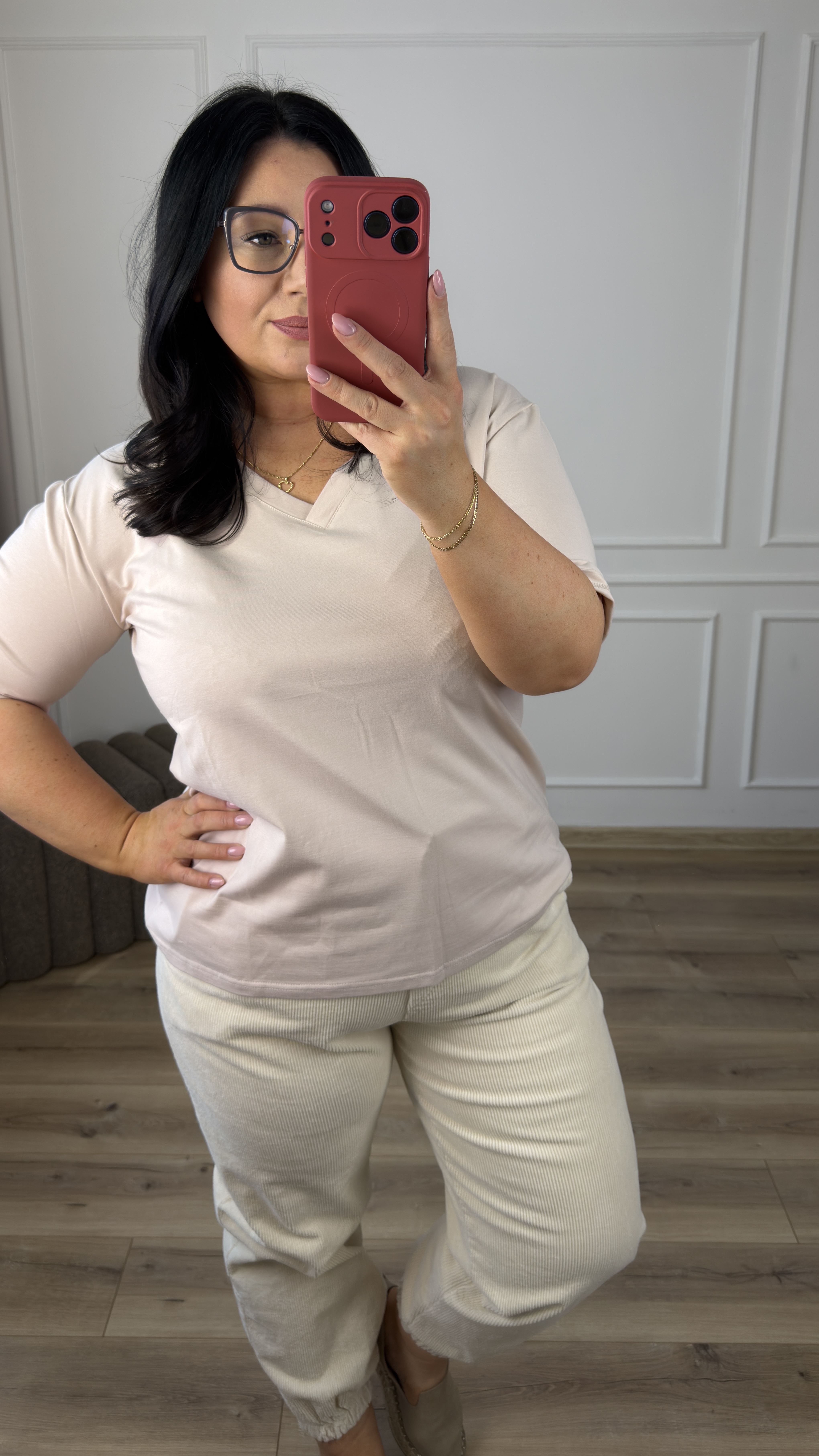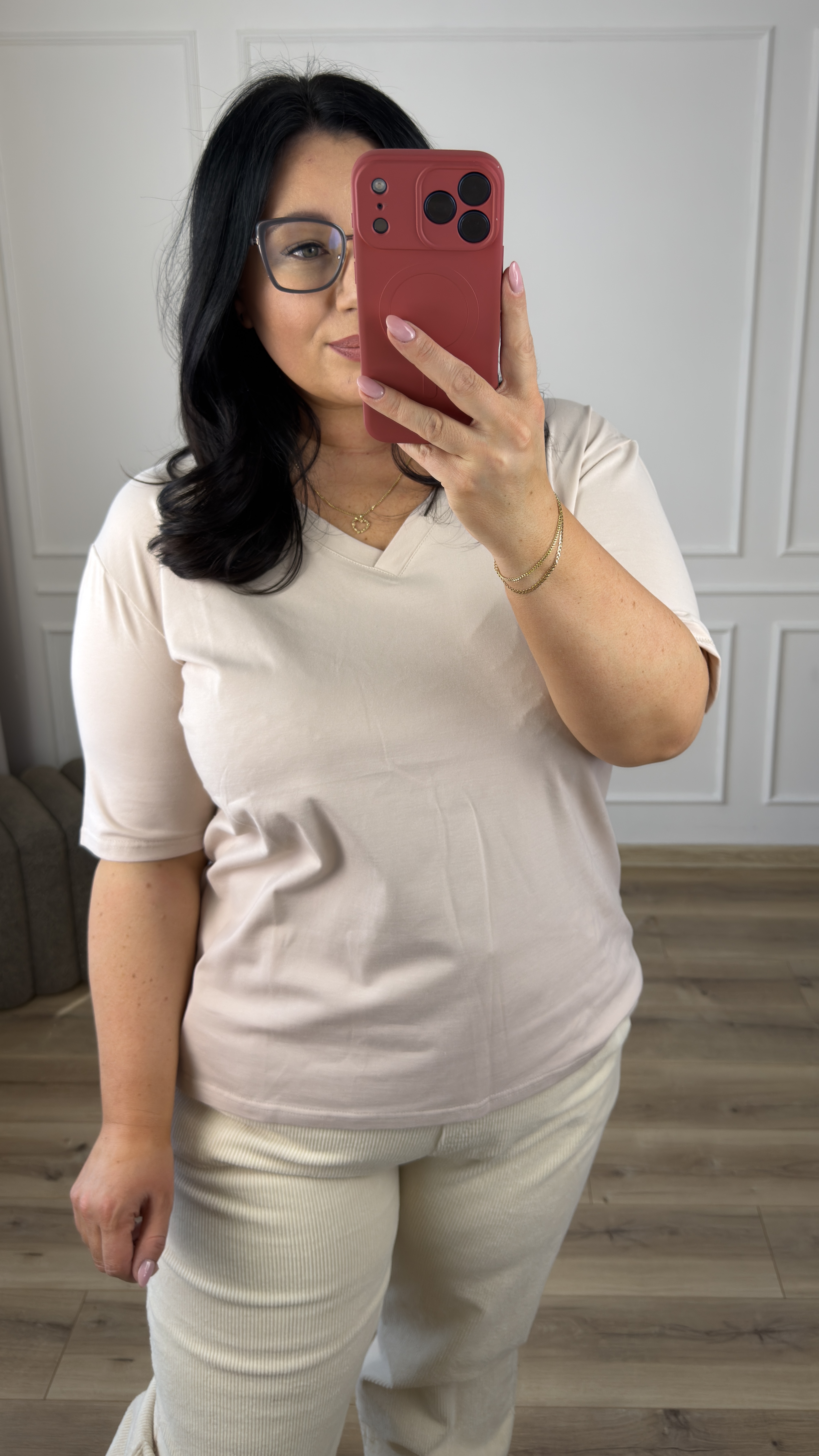 Klasyczny t-shirt grubszej bawełny polskiego producenta. O klasycznym kroju, posiada dekolt w serek idealnie sprawdzi się przy większym biuście. Krótki rękaw, dłuższy w stanie. Model dzięki swojej uniwersalności świetnie sprawdzi się jako baza do większości wiosennych stylizacji.
