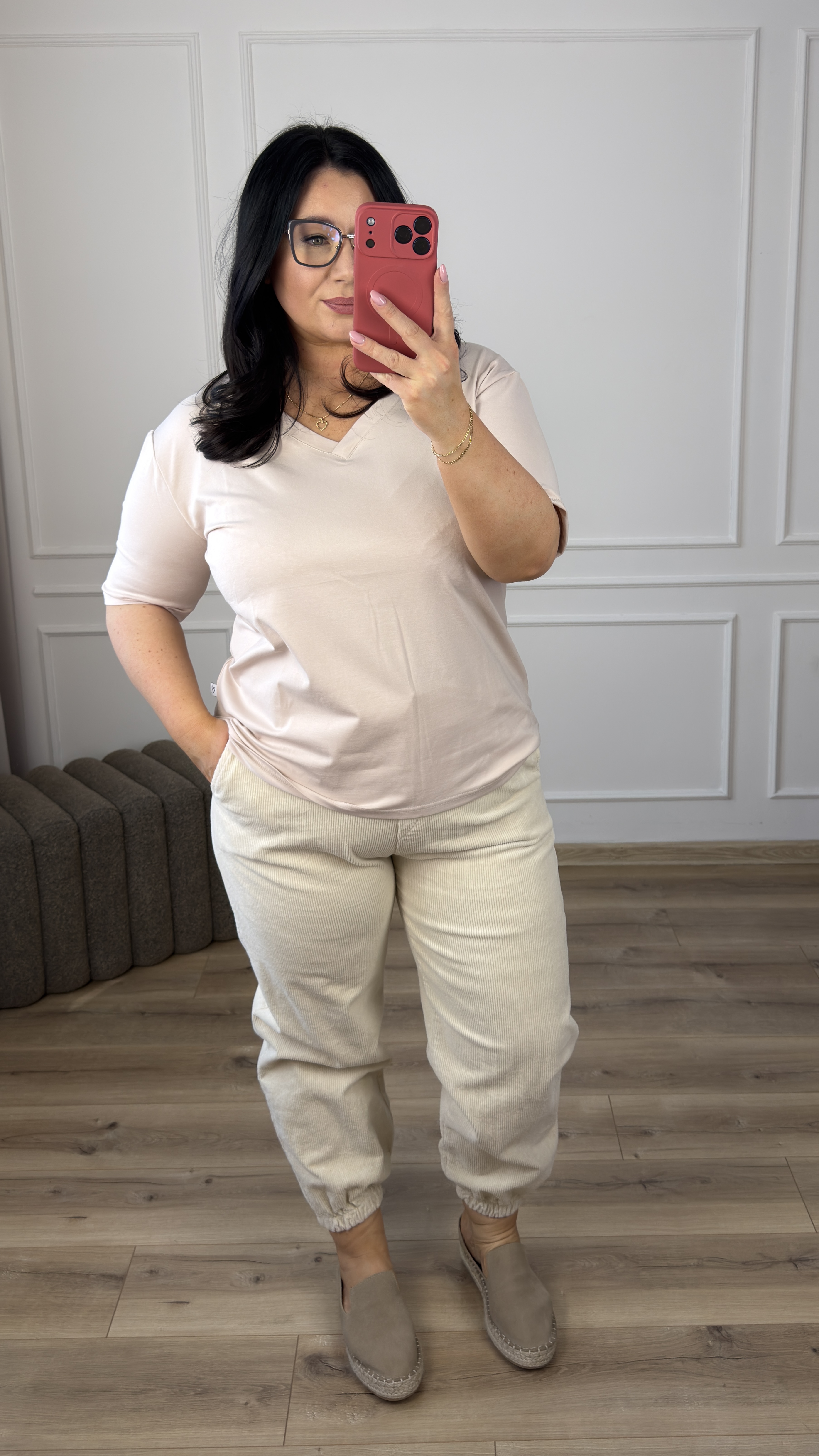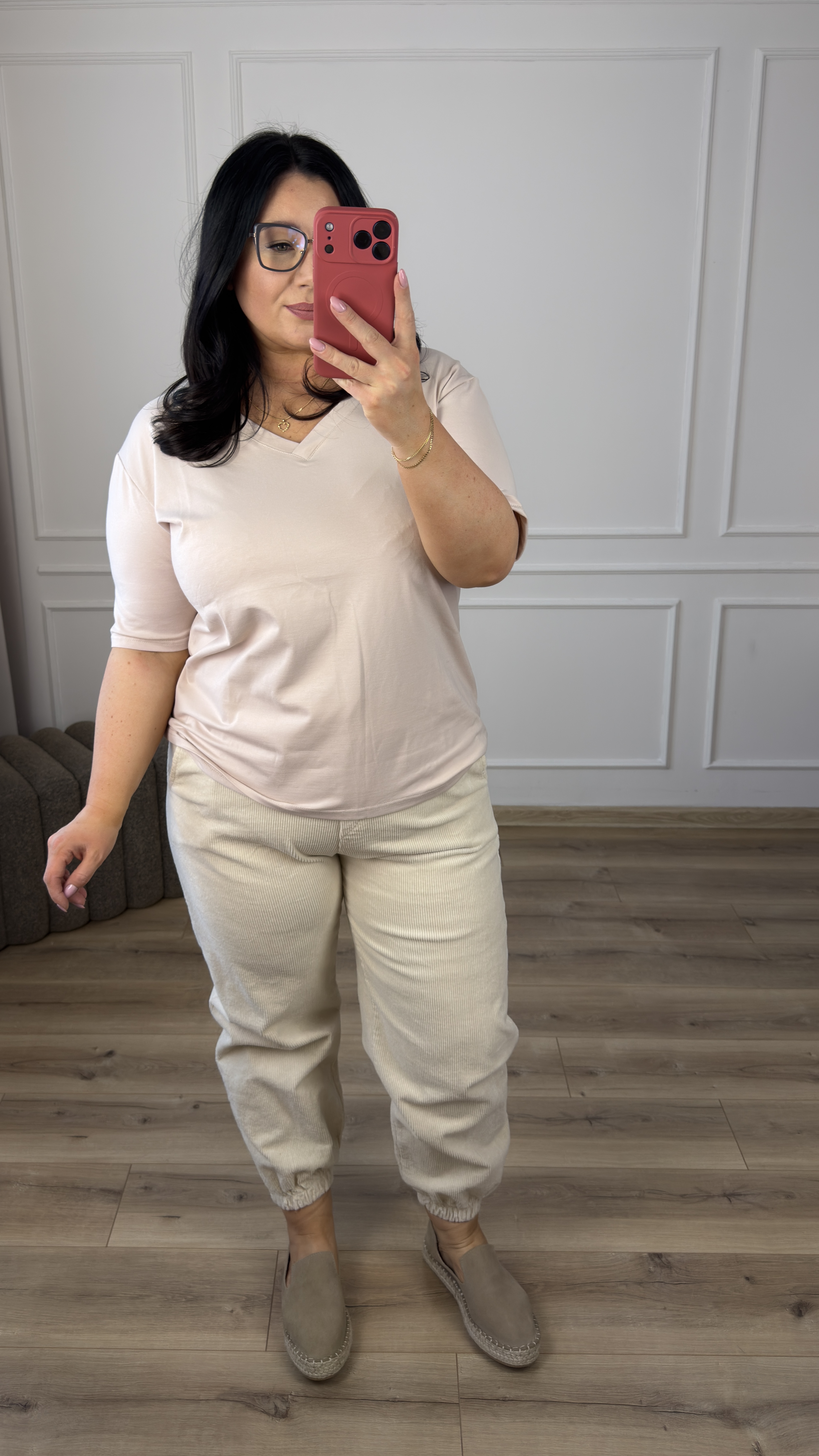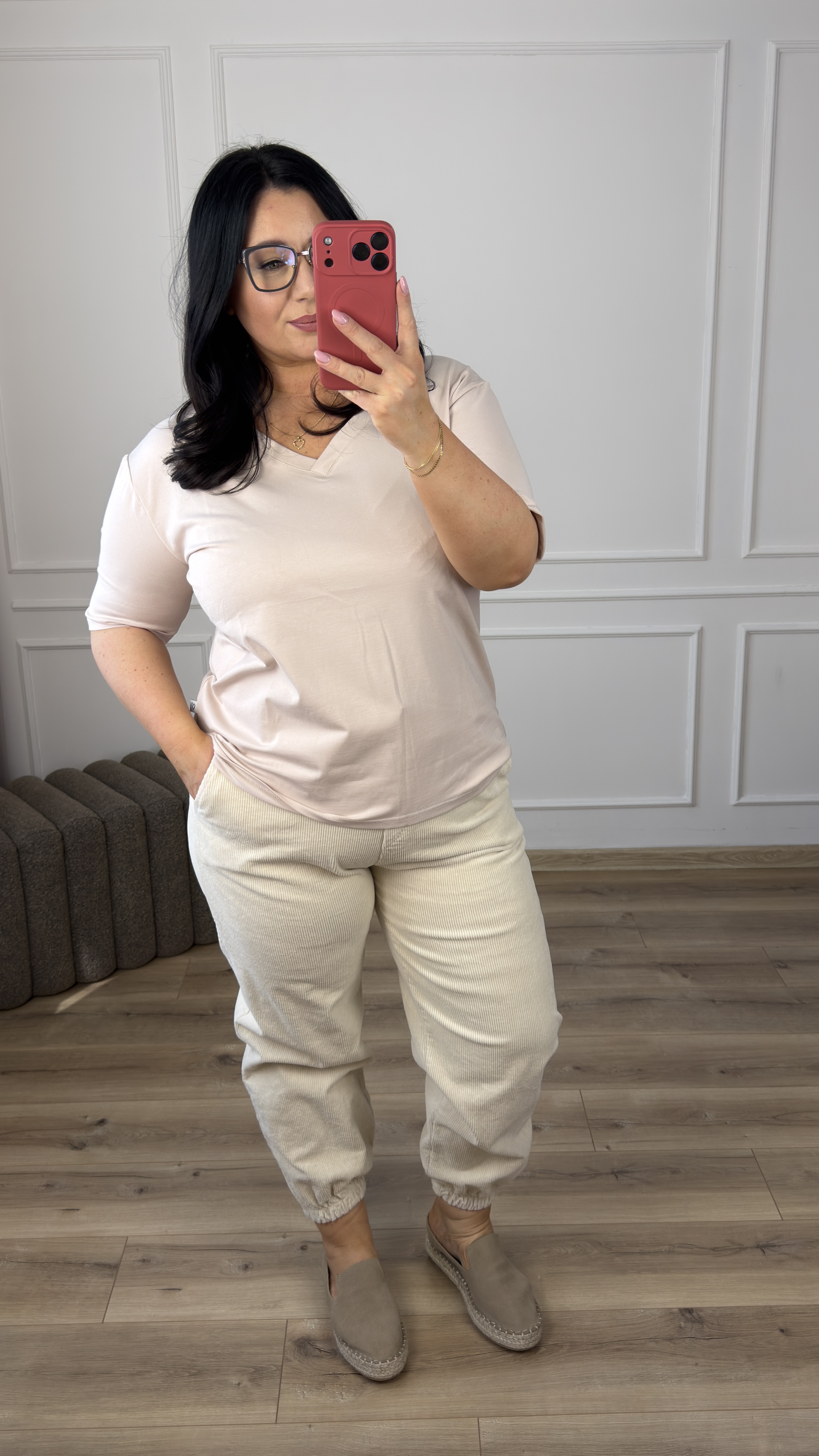 Klasyczny t-shirt grubszej bawełny polskiego producenta. O klasycznym kroju, posiada dekolt w serek idealnie sprawdzi się przy większym biuście. Krótki rękaw, dłuższy w stanie. Model dzięki swojej uniwersalności świetnie sprawdzi się jako baza do większości wiosennych stylizacji.