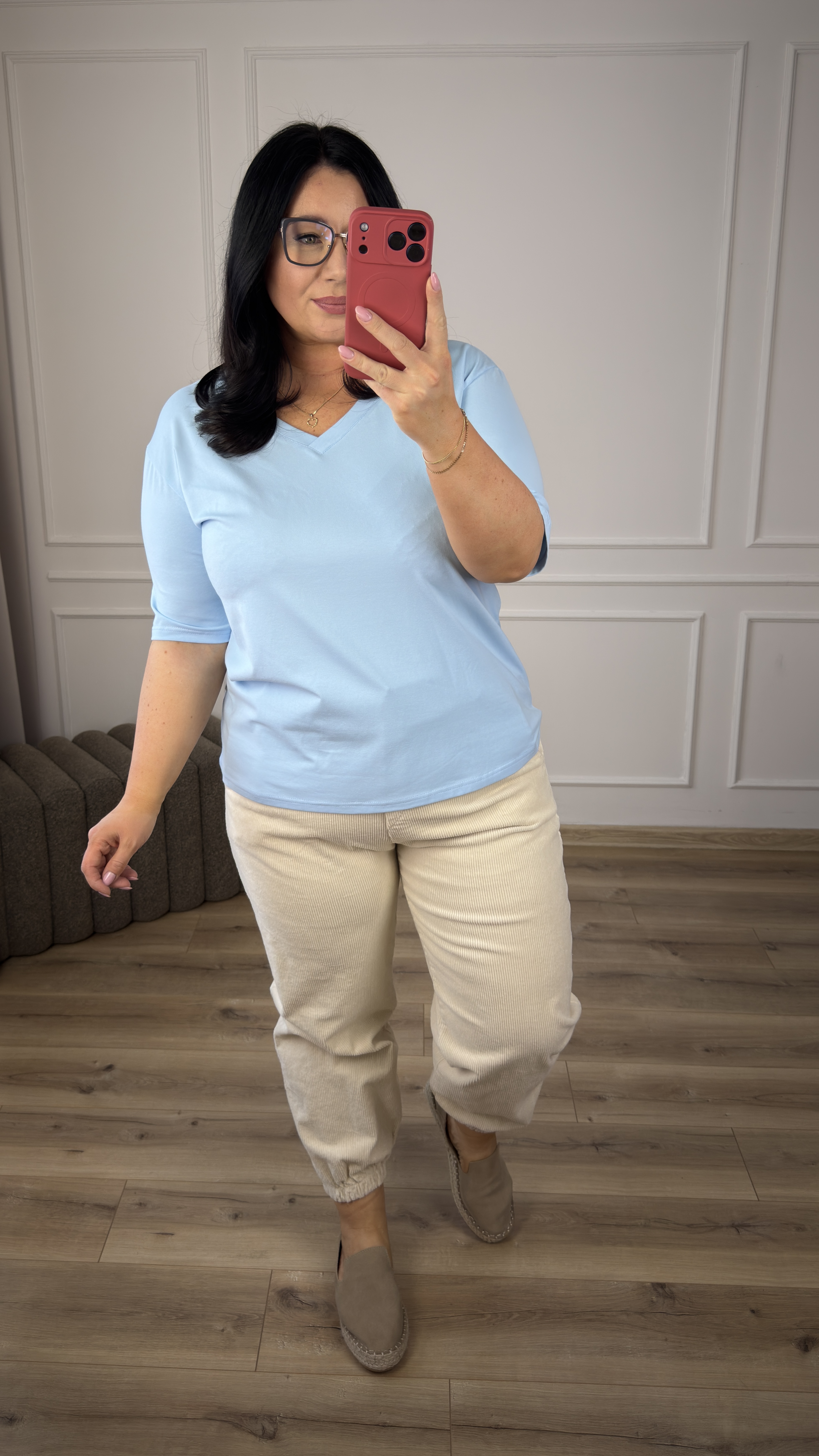 Klasyczny t-shirt grubszej bawełny polskiego producenta. O klasycznym kroju, posiada dekolt w serek idealnie sprawdzi się przy większym biuście. Krótki rękaw, dłuższy w stanie. Model dzięki swojej uniwersalności świetnie sprawdzi się jako baza do większości wiosennych stylizacji.