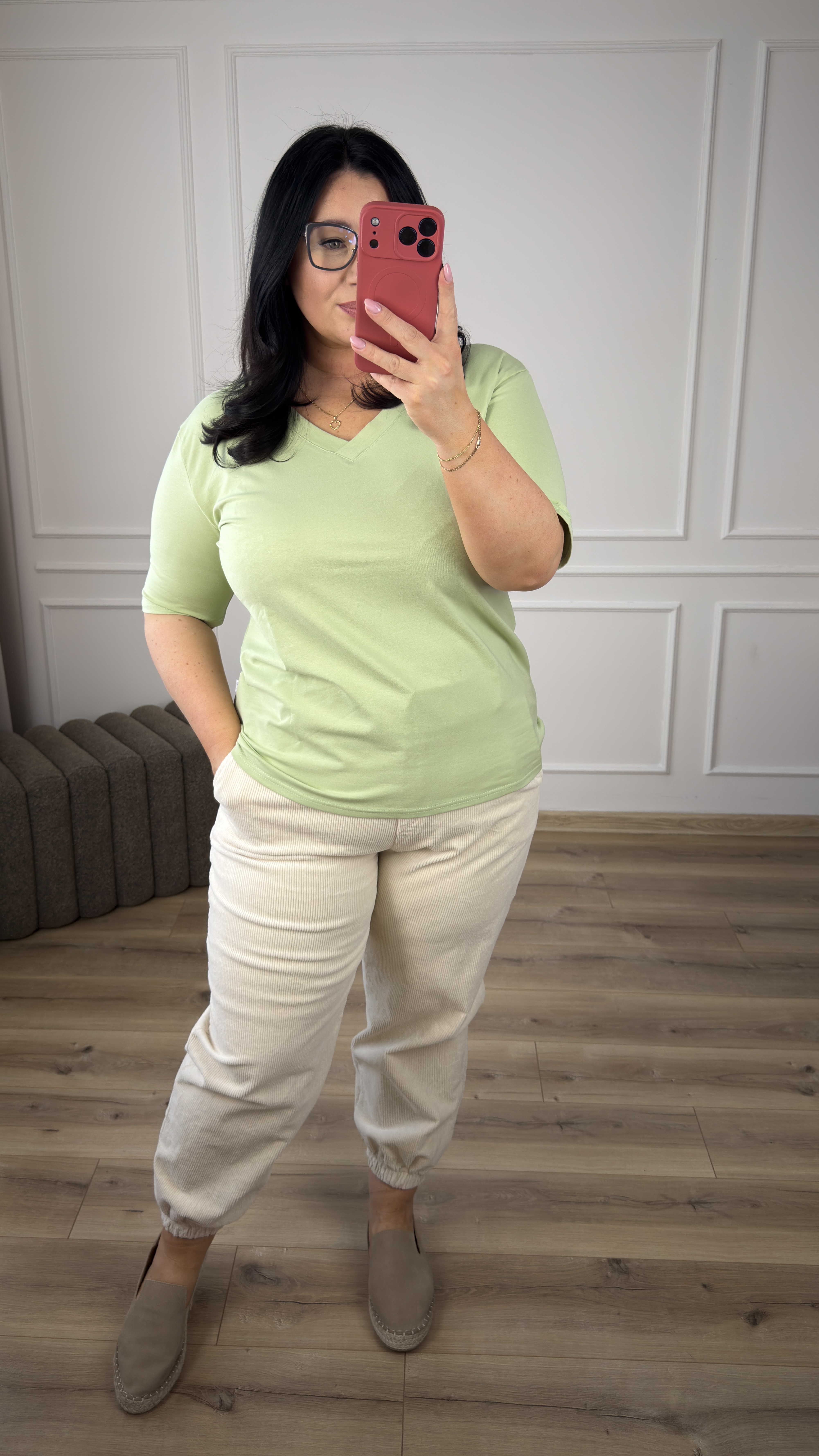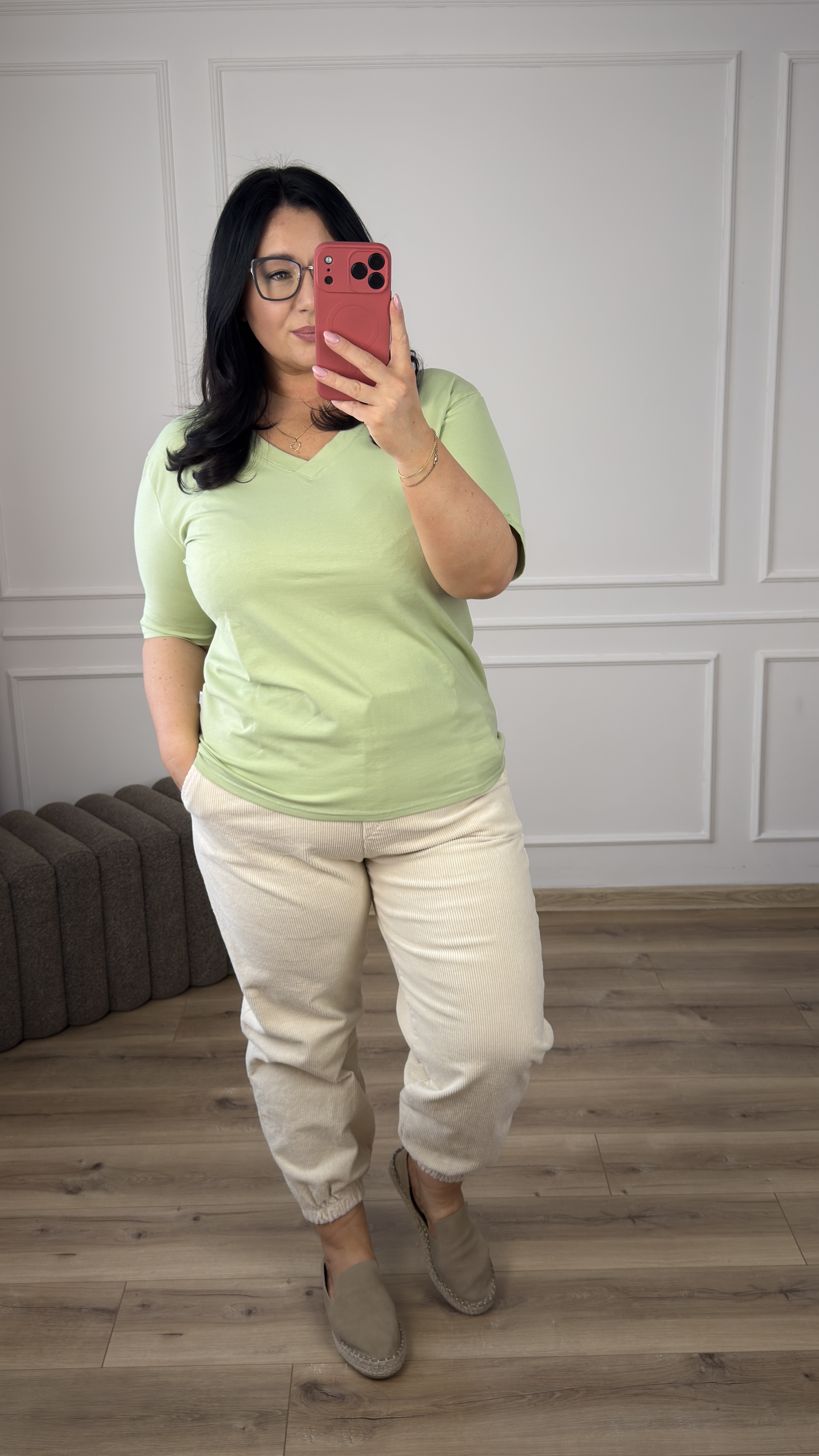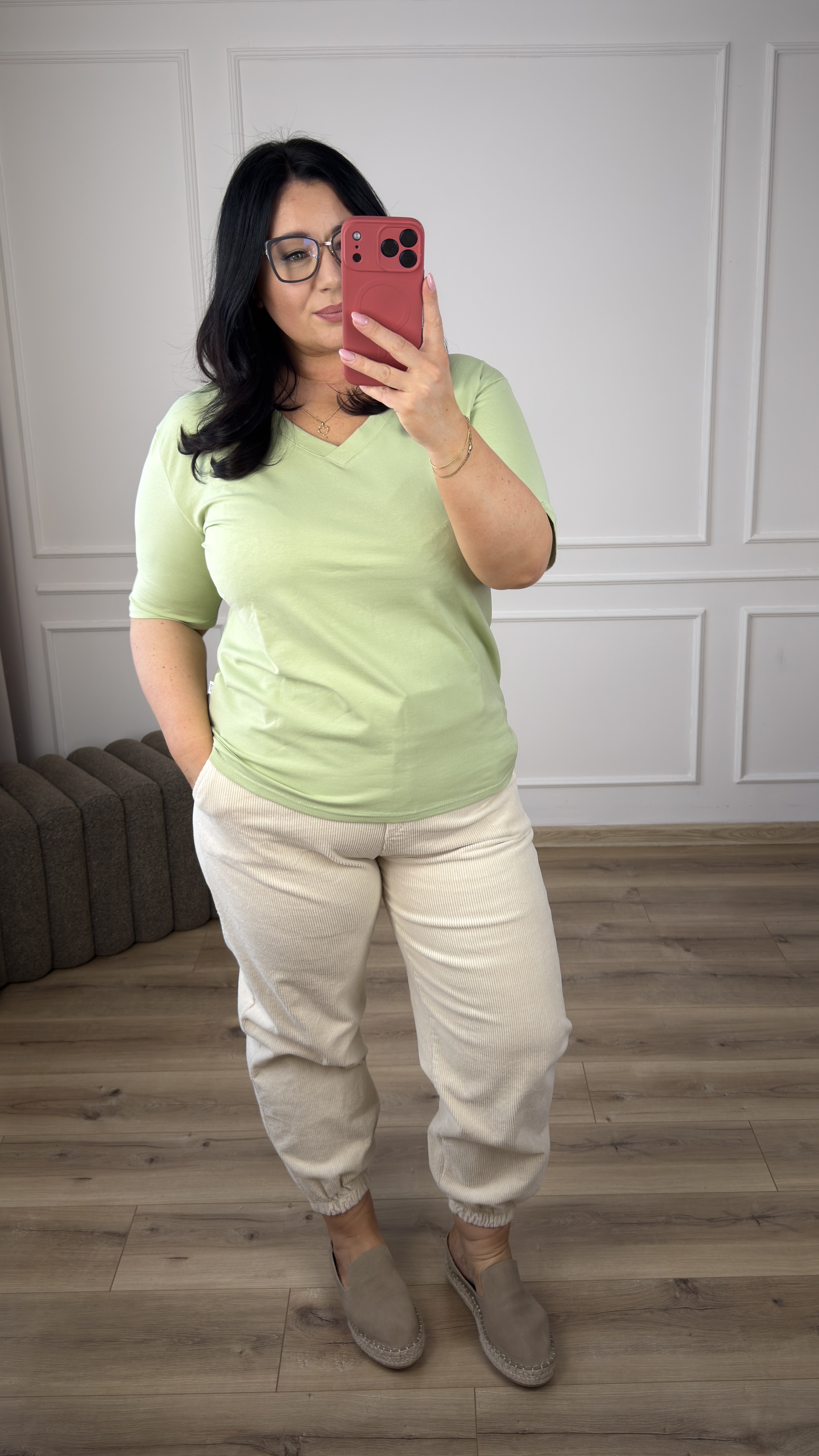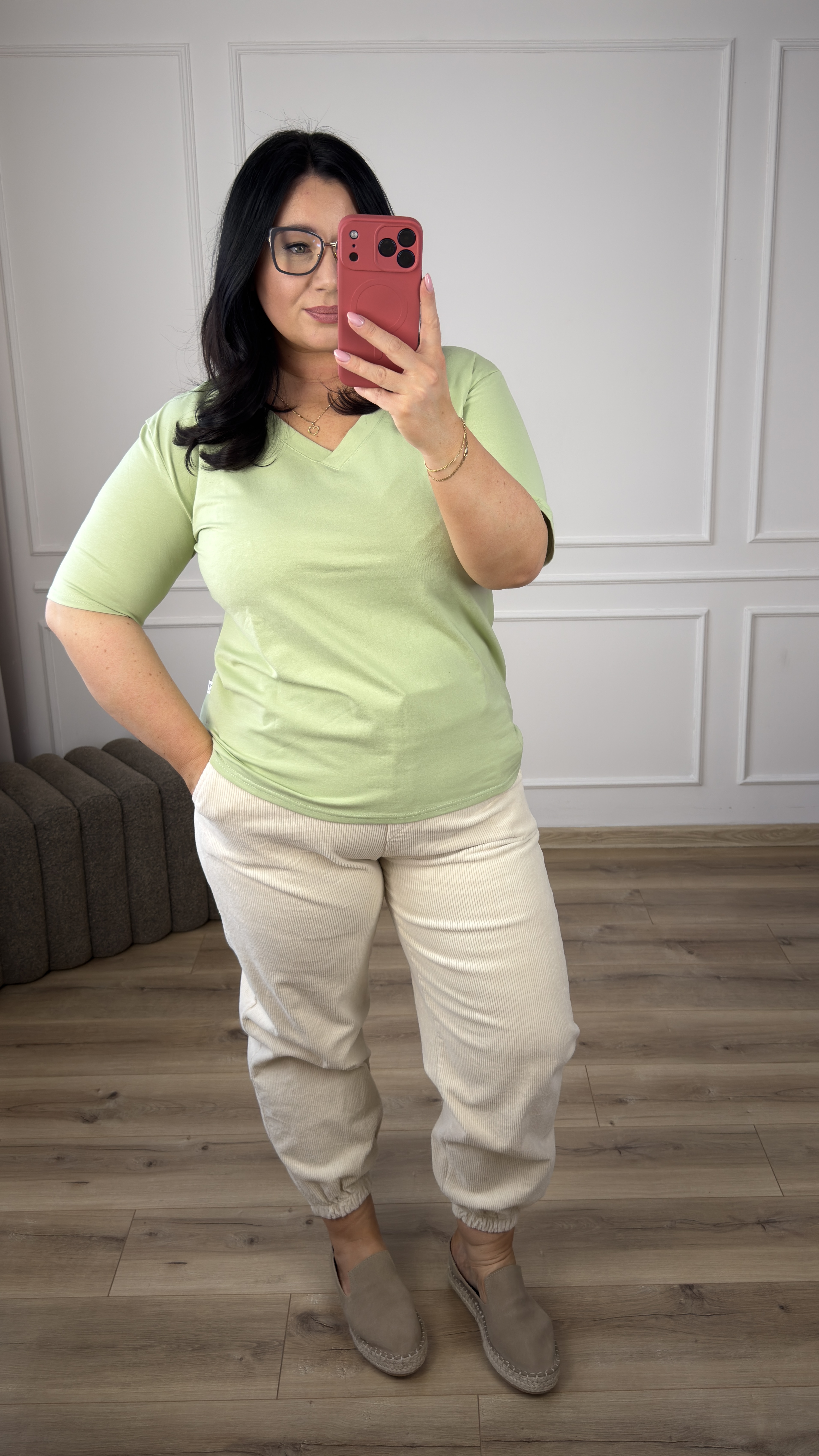 Klasyczny t-shirt grubszej bawełny polskiego producenta. O klasycznym kroju, posiada dekolt w serek idealnie sprawdzi się przy większym biuście. Krótki rękaw, dłuższy w stanie. Model dzięki swojej uniwersalności świetnie sprawdzi się jako baza do większości wiosennych stylizacji.