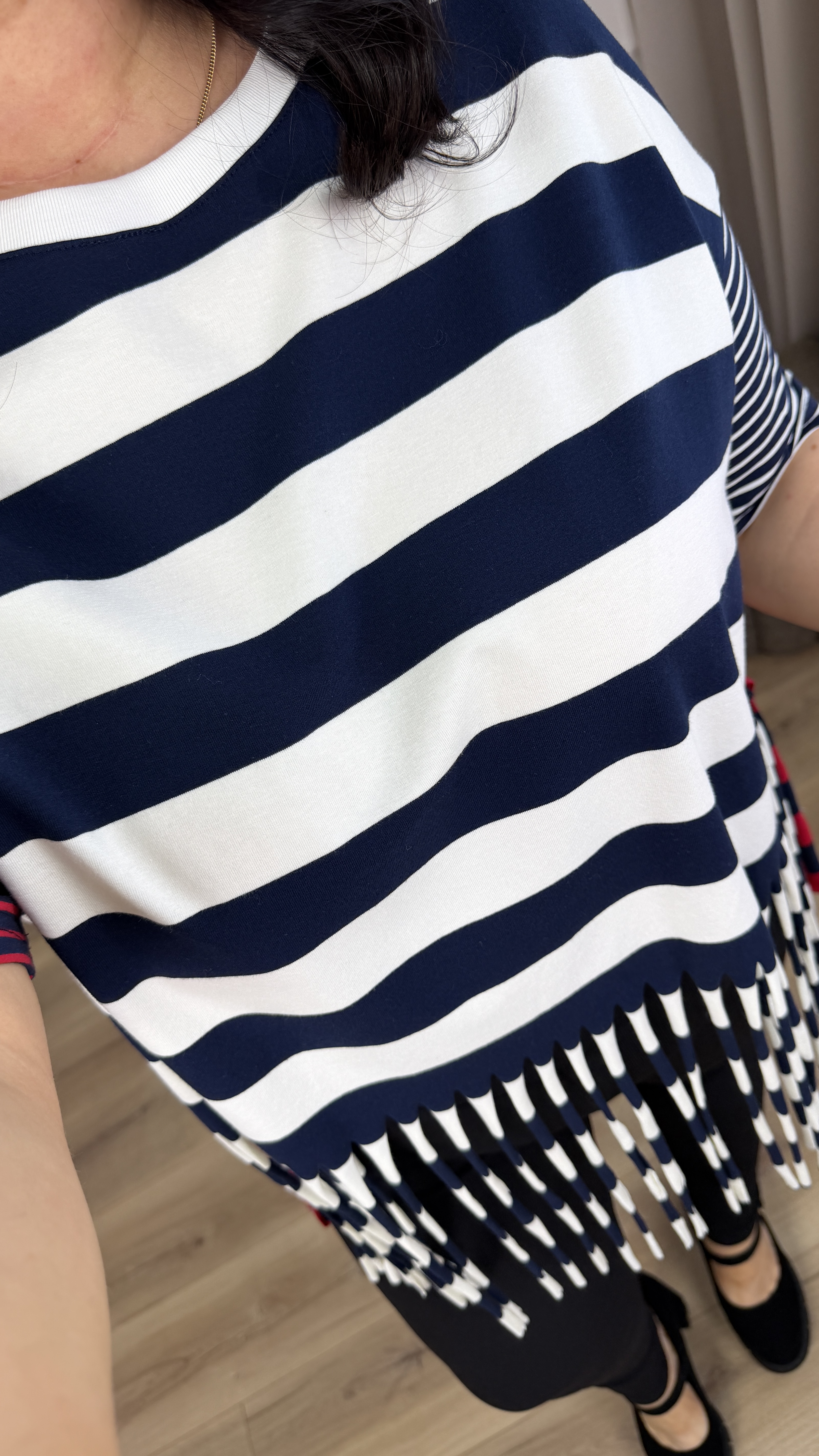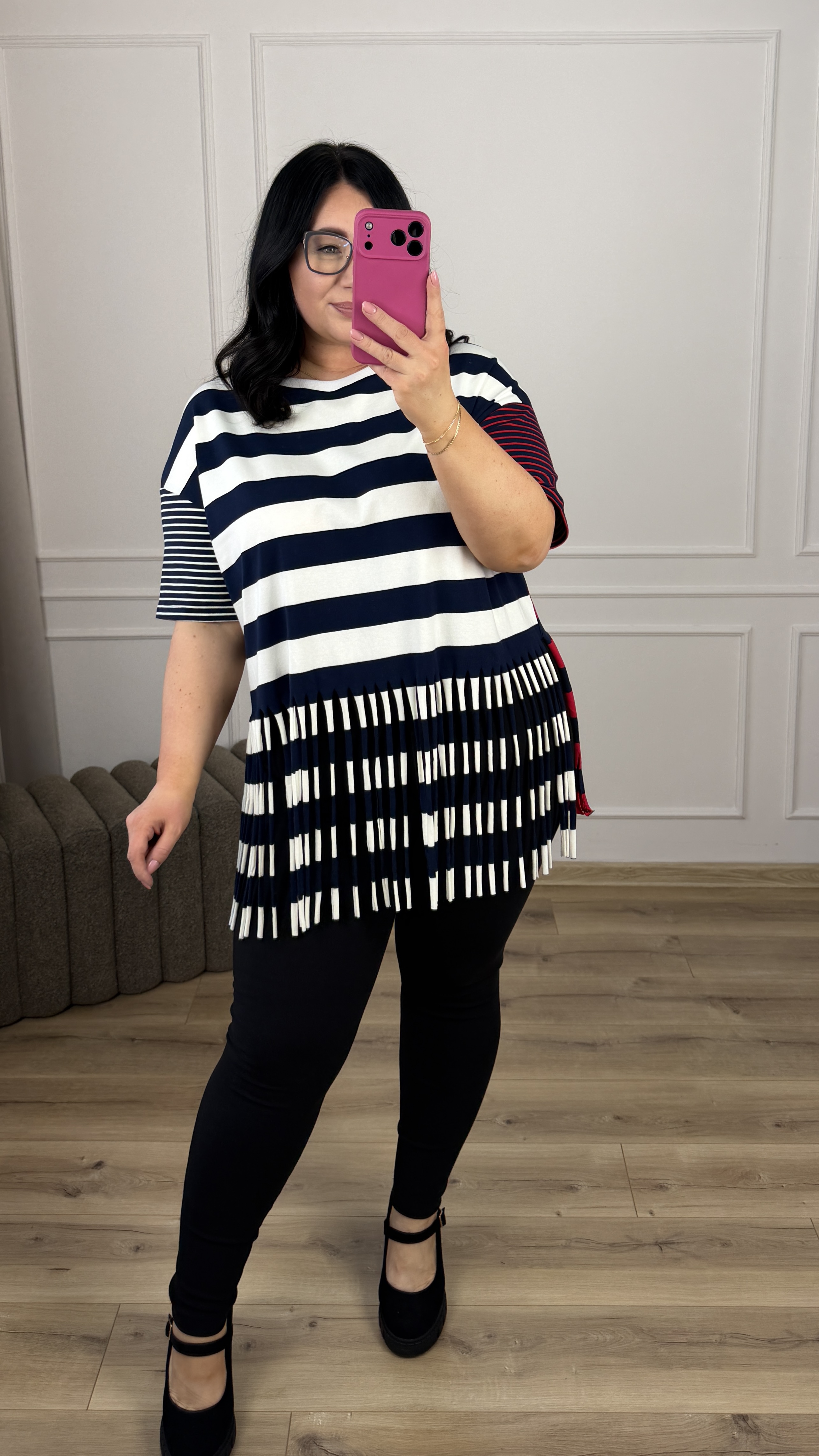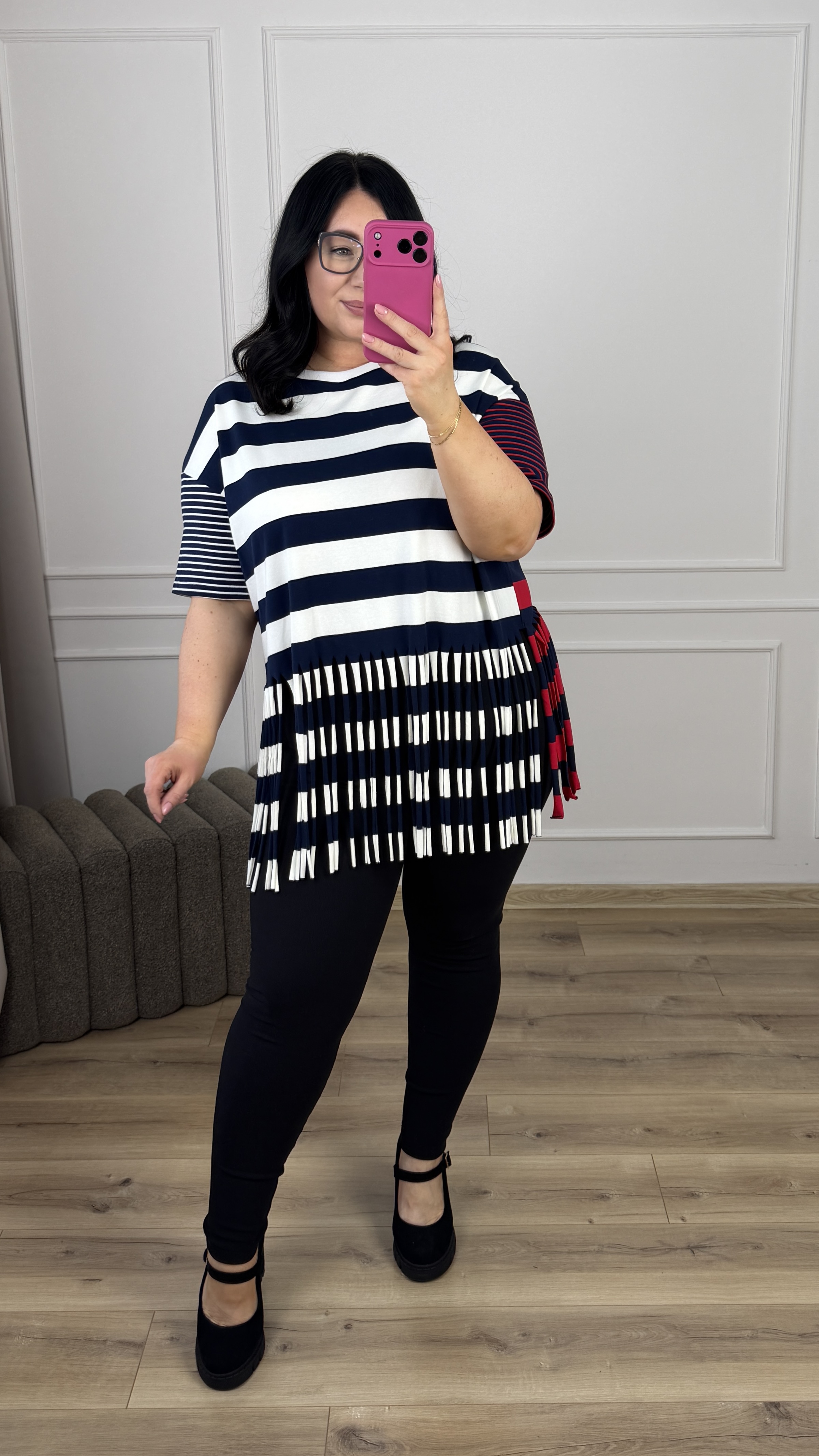 Efektowny t-shirt z grubej bawełny w paski. Paskowy t-shirt z ozdobnymi frędzlami u dołu. Model świetnie sprawdzi się w wiosenno-letnich stylizacjach. Nada koloru Twojej stylizacji i zwróci uwagę innych.