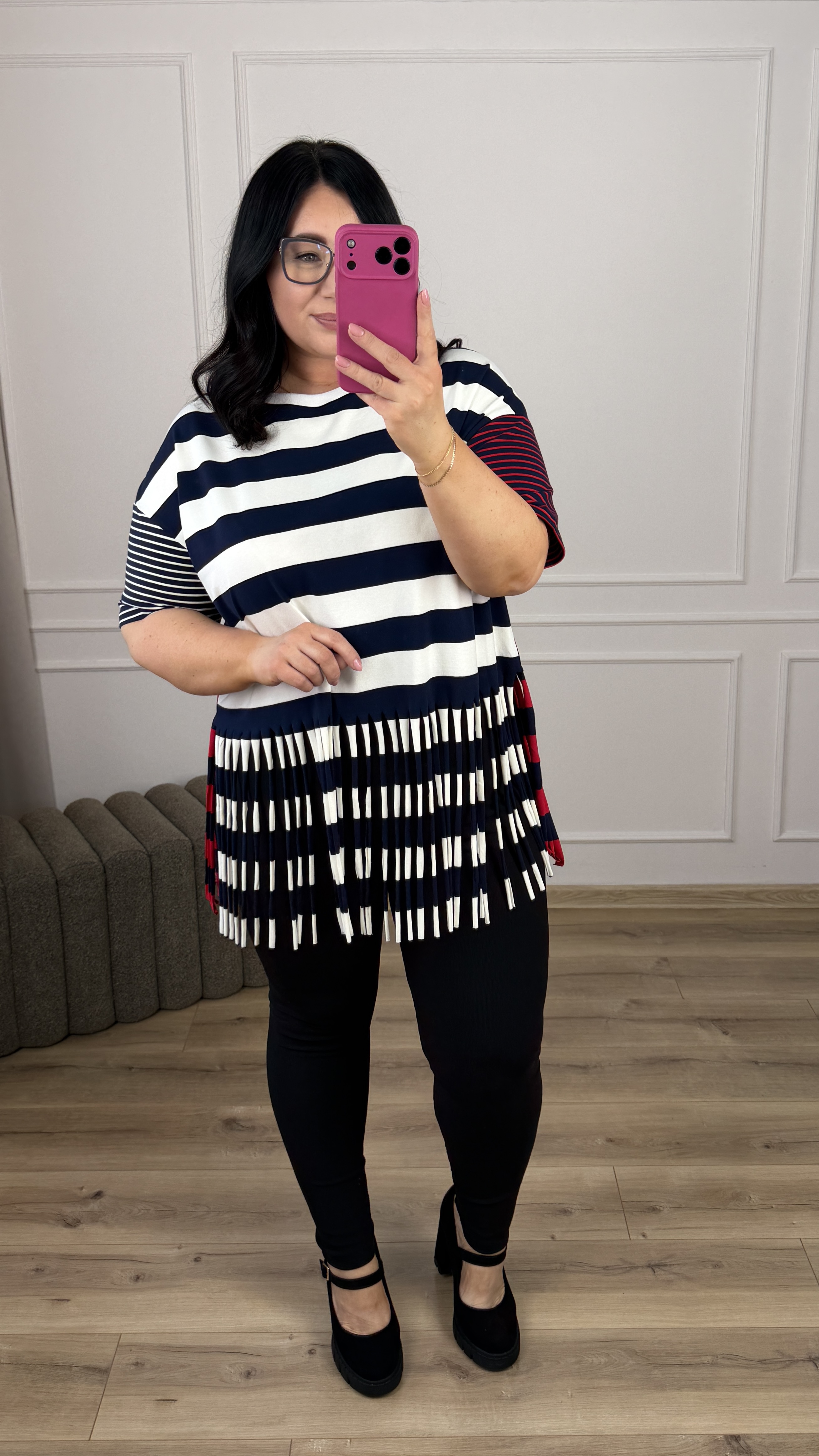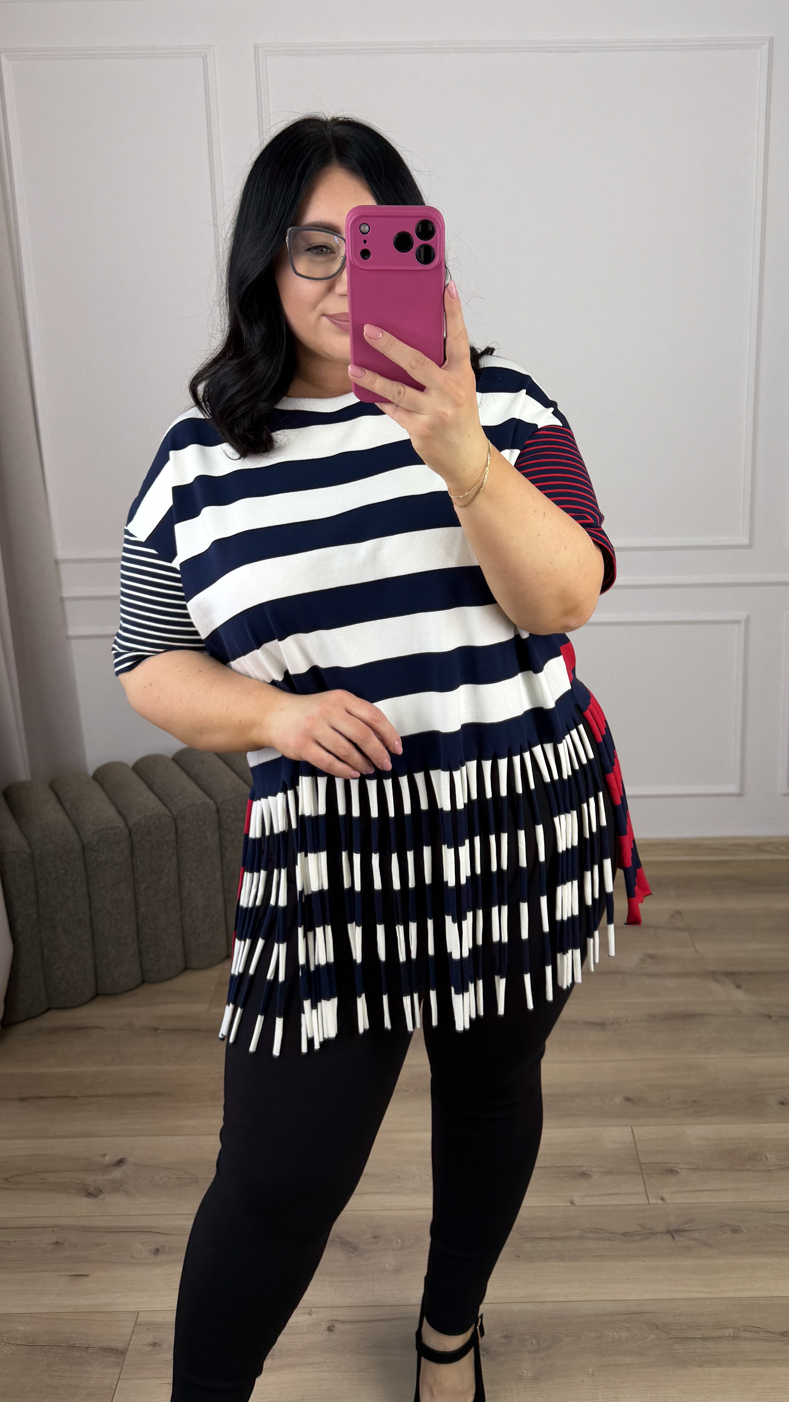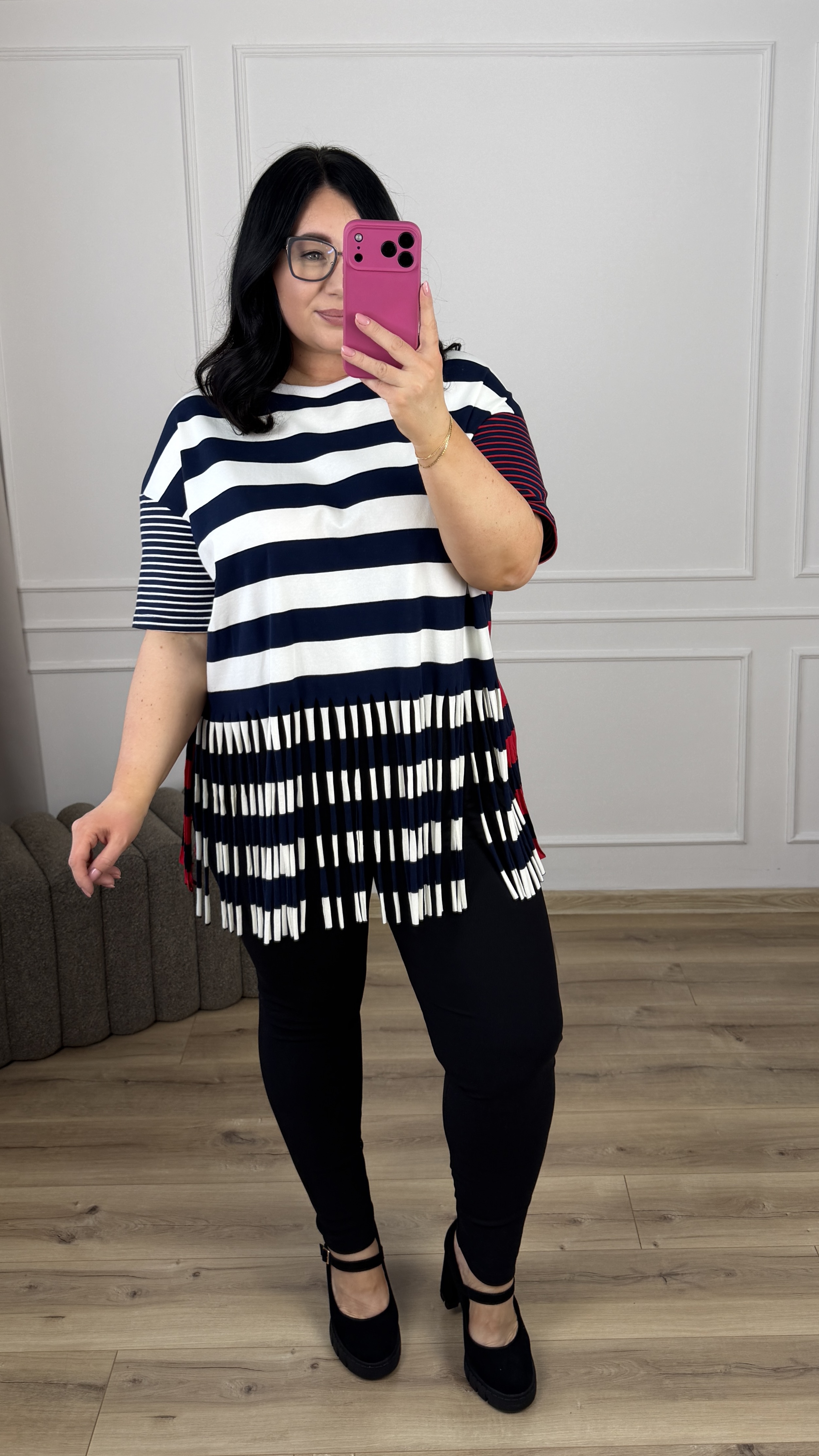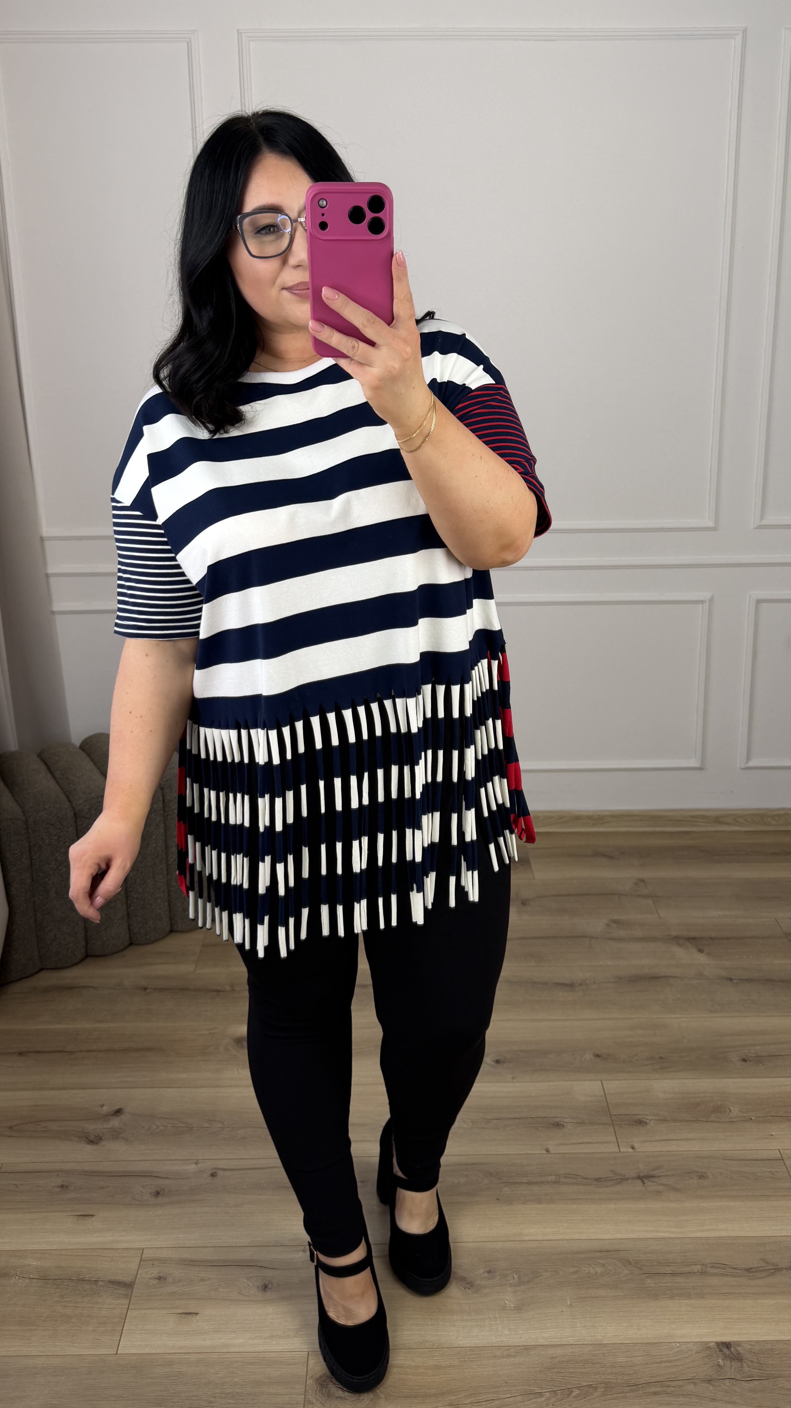 Efektowny t-shirt z grubej bawełny w paski. Paskowy t-shirt z ozdobnymi frędzlami u dołu. Model świetnie sprawdzi się w wiosenno-letnich stylizacjach. Nada koloru Twojej stylizacji i zwróci uwagę innych.